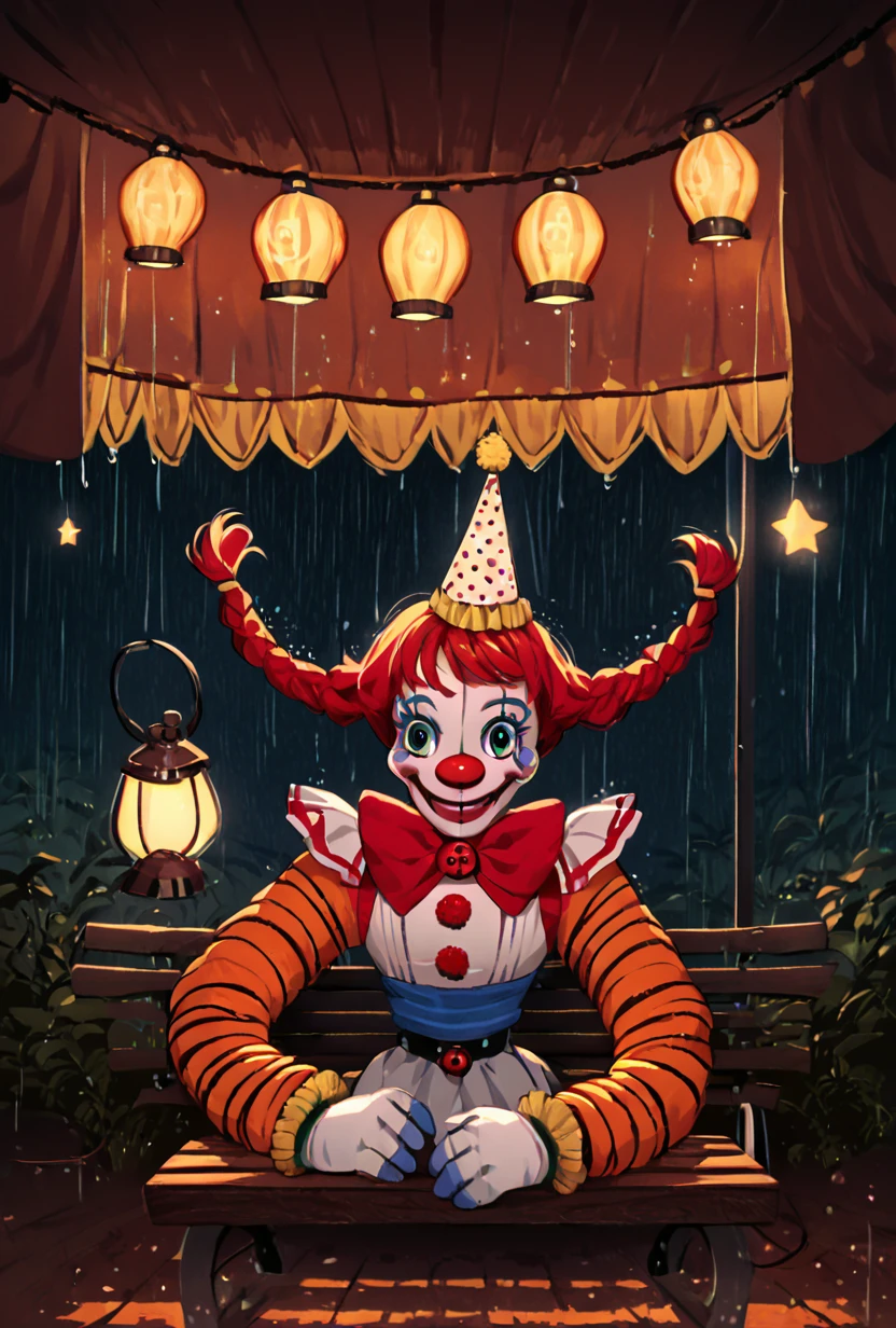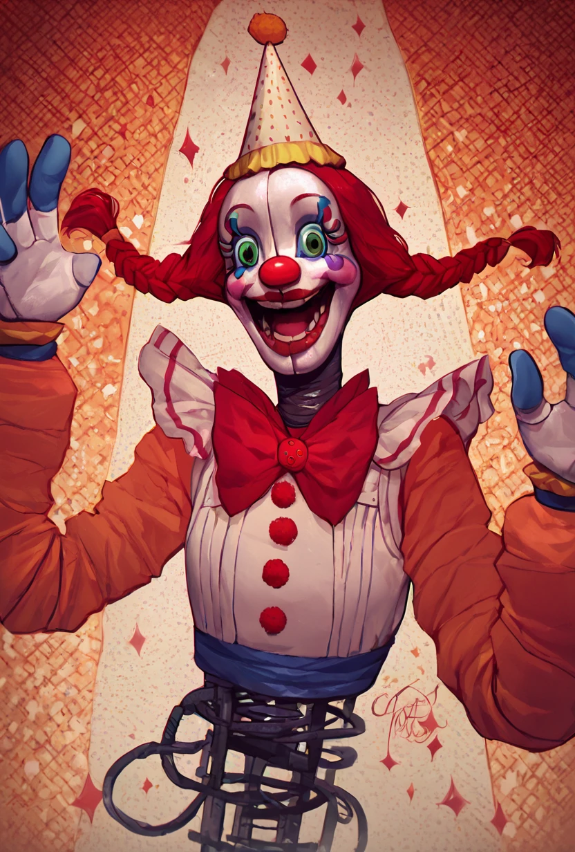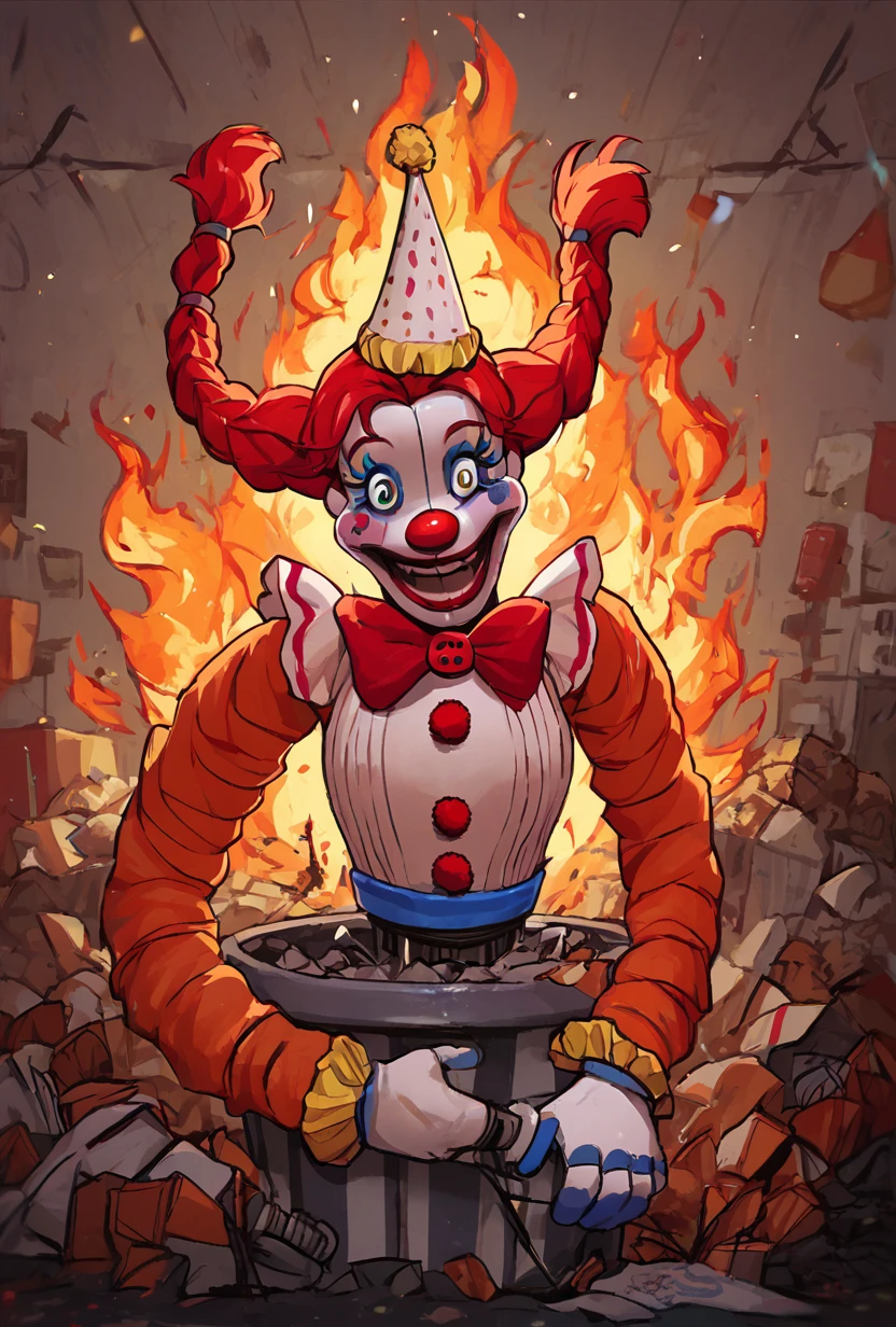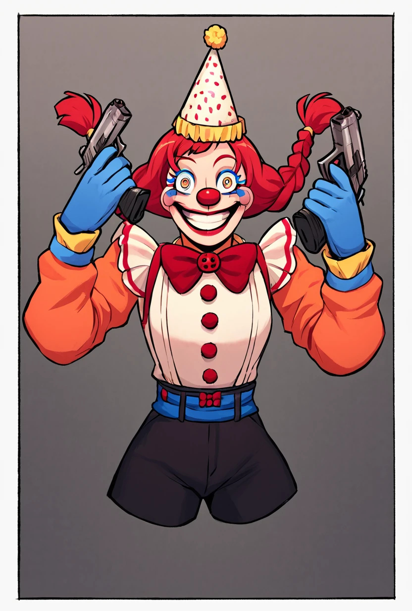 jackie, party hat, clown, solo,red bow, twin tails, red hair, , twin braids, , orange arms,