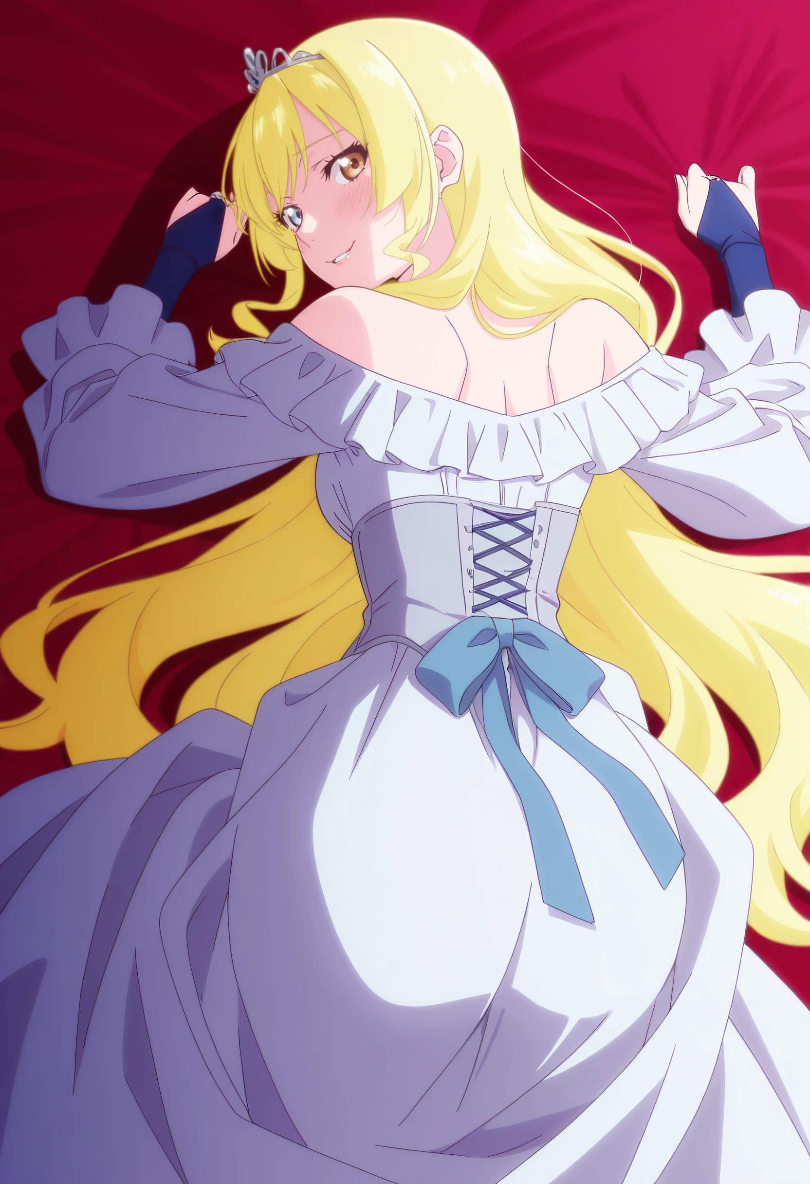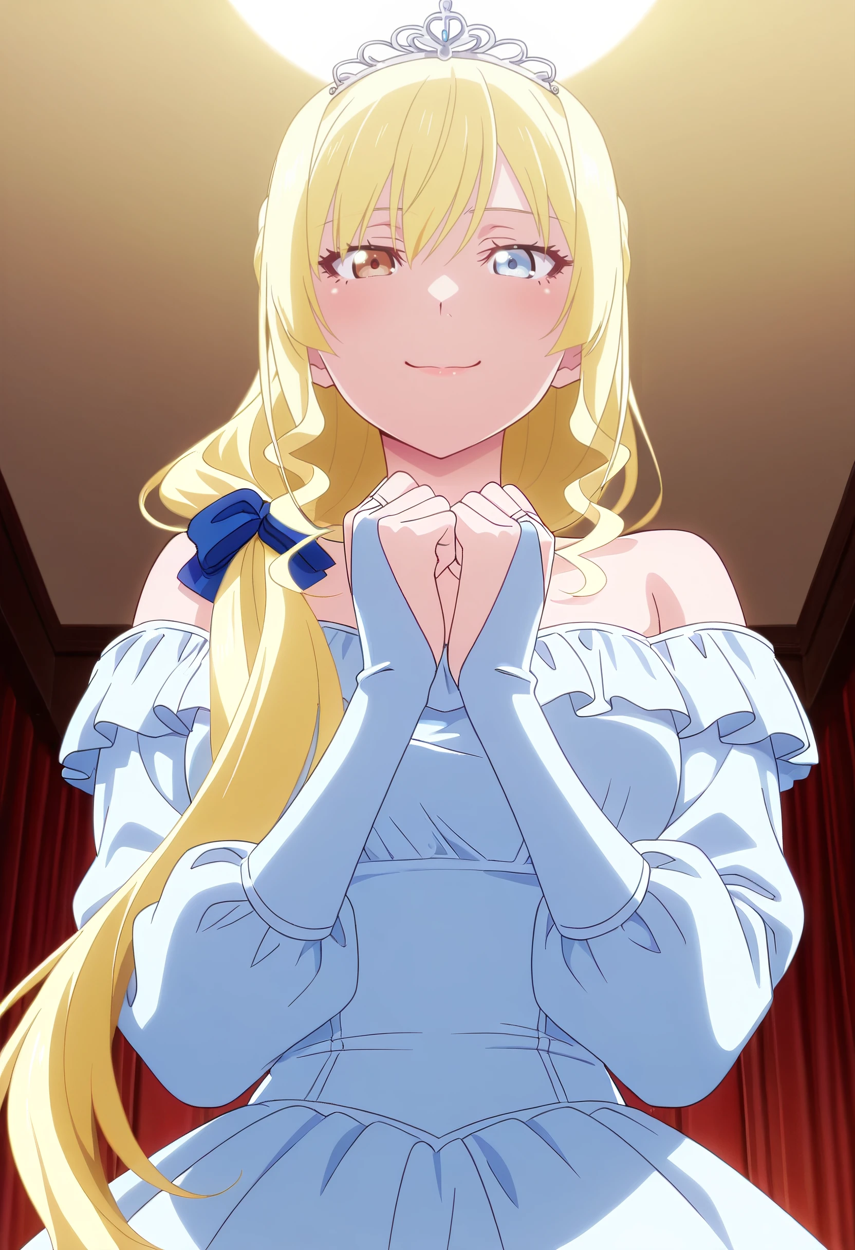 AcerolaDressB, dress, off shoulder, off-shoulder dress, princess, long sleeves, tiara, white dress, bare shoulders, frills, long dress, puffy sleeves, crown, frilled dress, ribbon, victorian, bridal gauntlets,