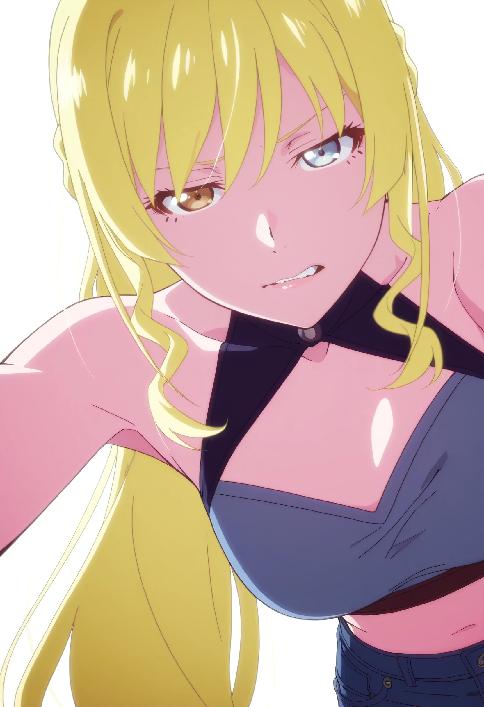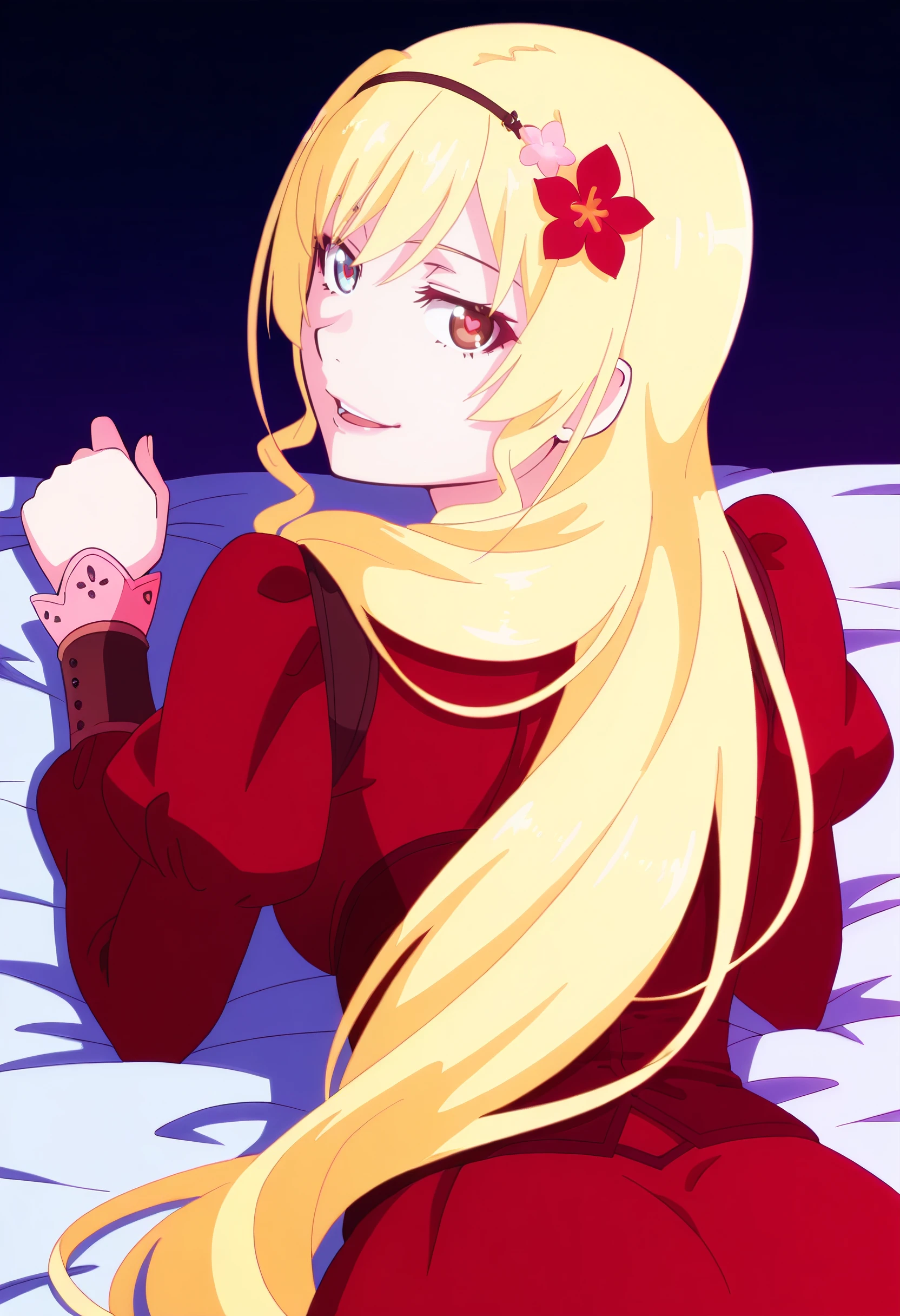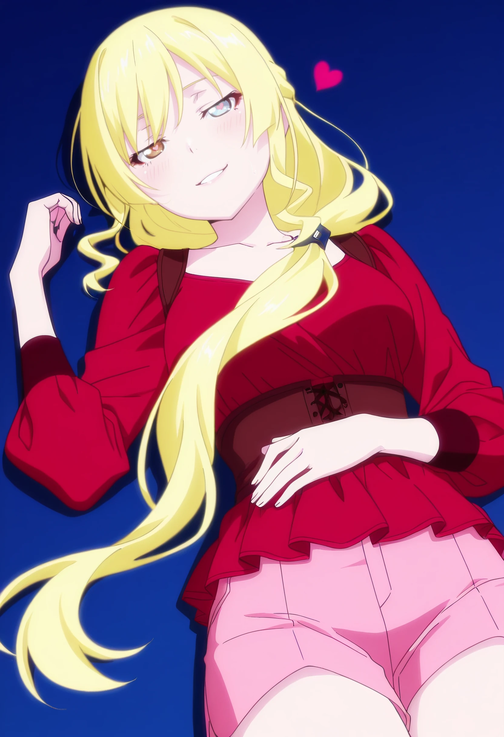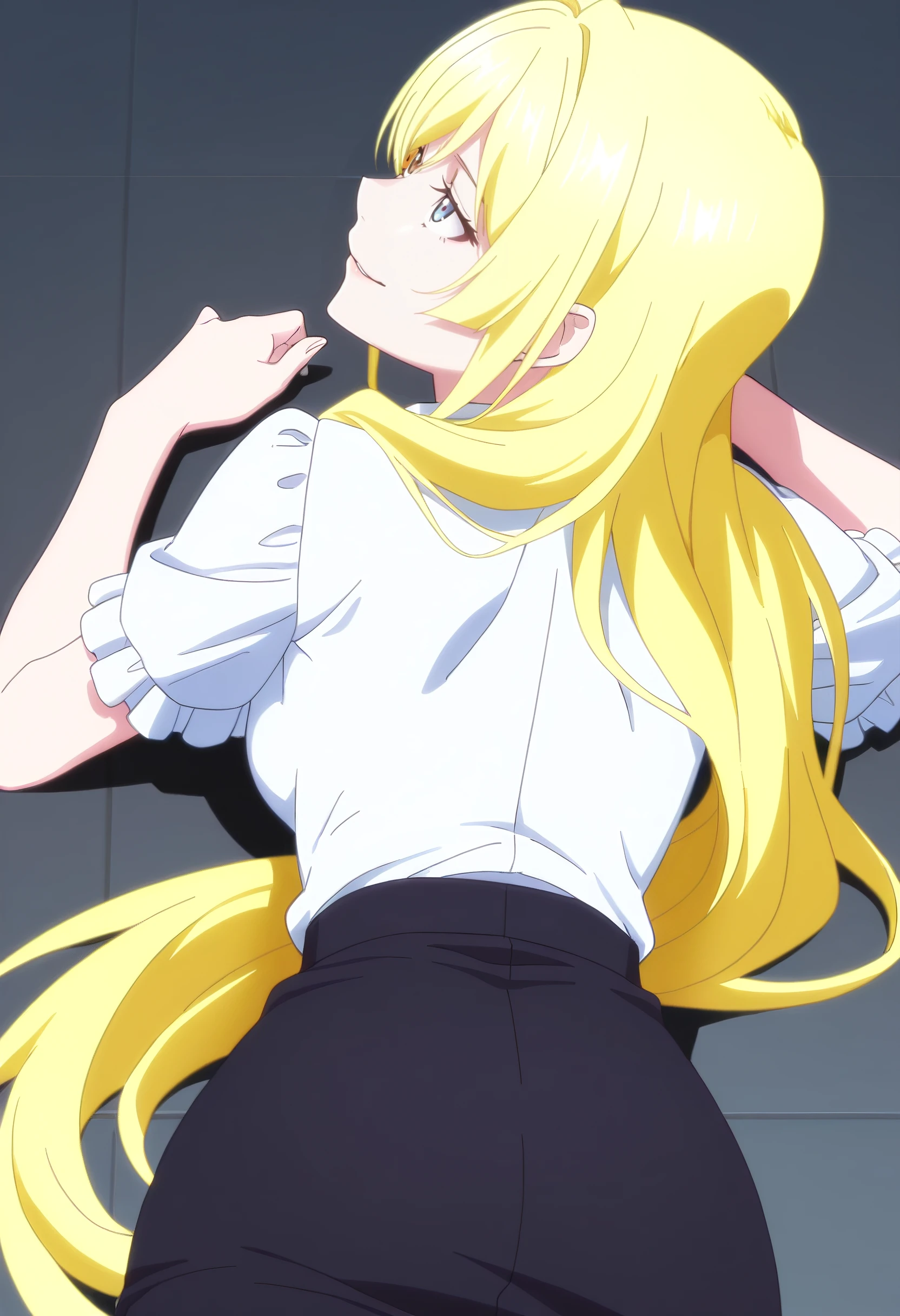 MonAcerola, blonde hair, long hair, very long hair, heterochromia, blue eyes, brown eyes, hair over shoulder,