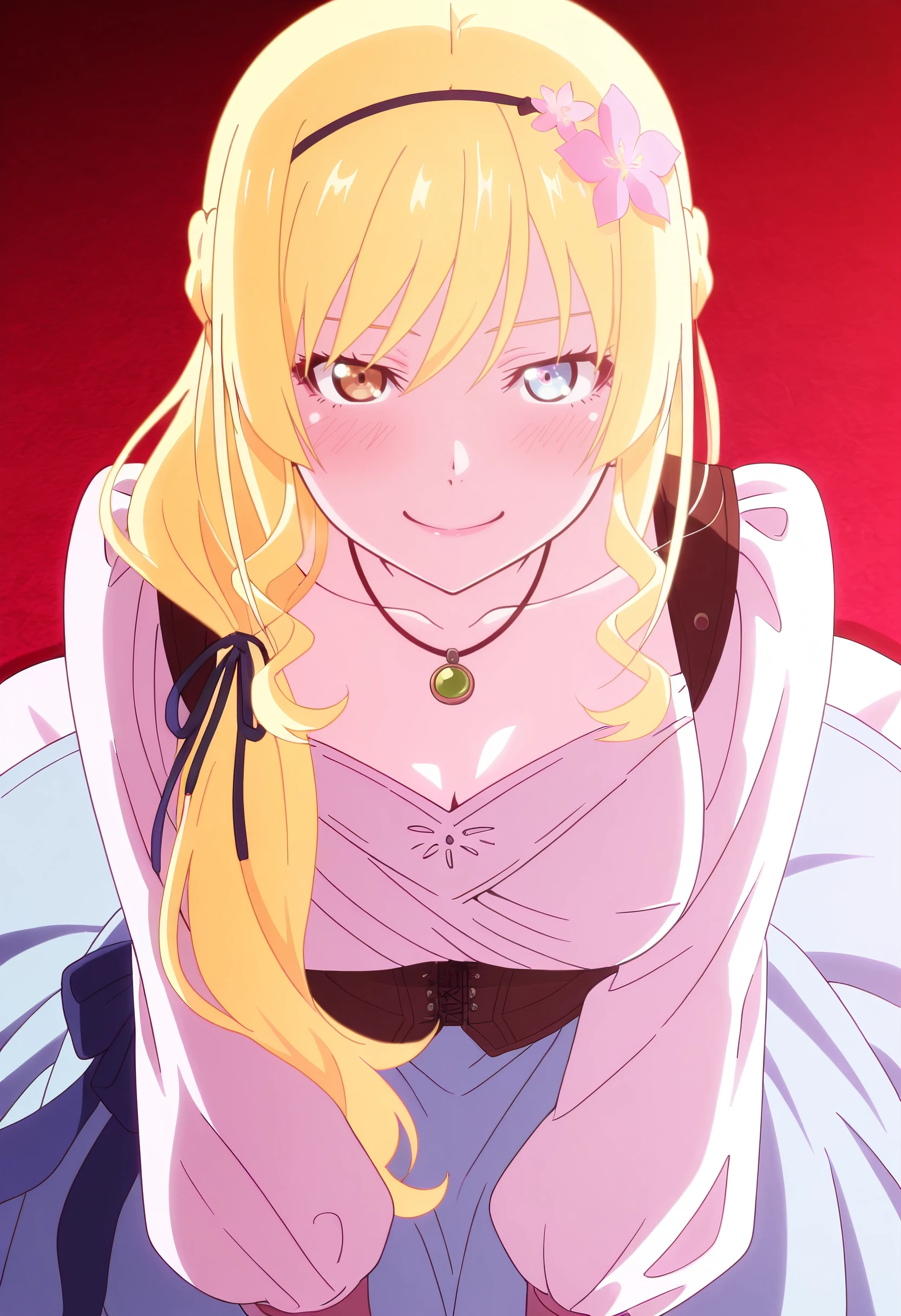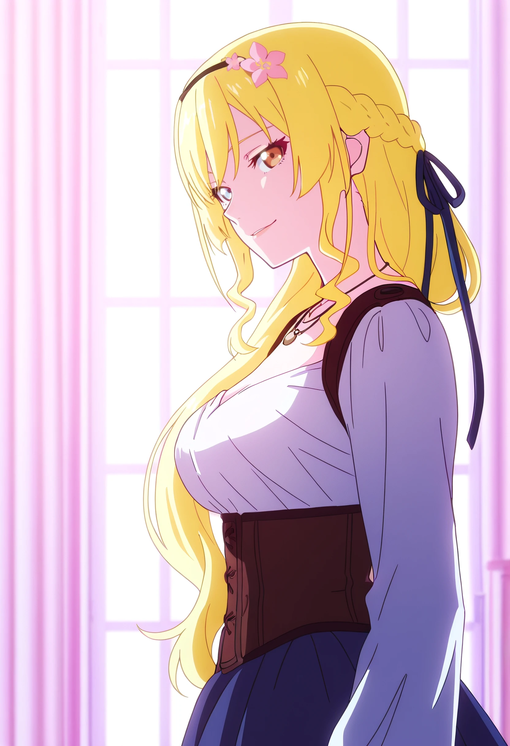 AcerolaDressC, jewelry, necklace, hair ornament, braid, flower, hair flower, dress, shirt, long sleeves, hairband, pendant, ribbon, hair ribbon, white shirt, puffy sleeves, crown braid, pink flower, skirt, official alternate costume, corset, black hairband,