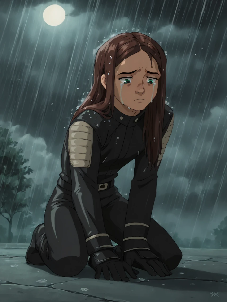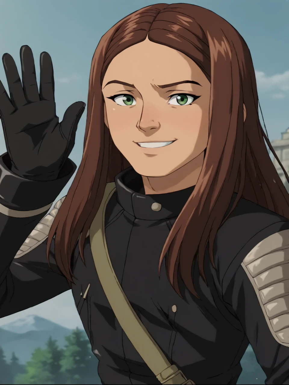 X23, 1girl, solo, long hair, brown hair, green eyes, black gloves, black uniform,