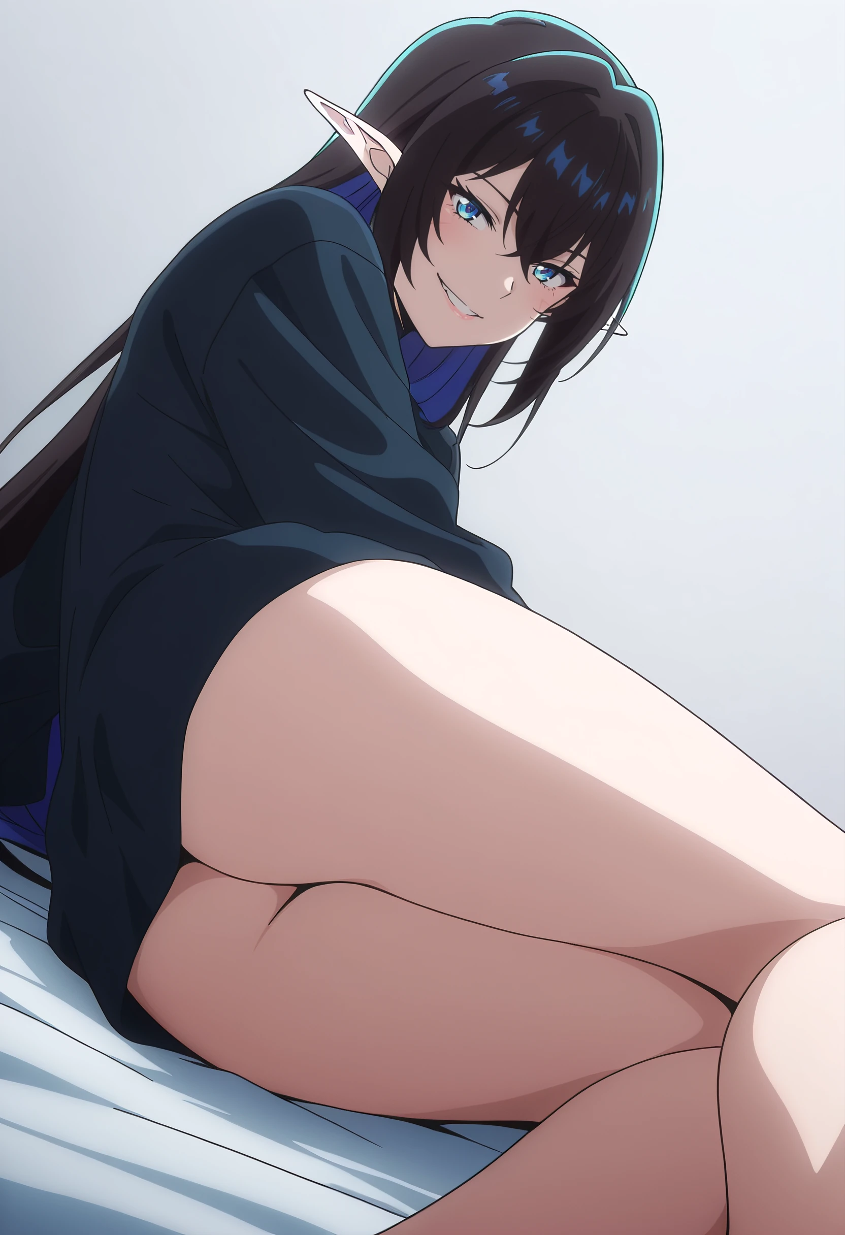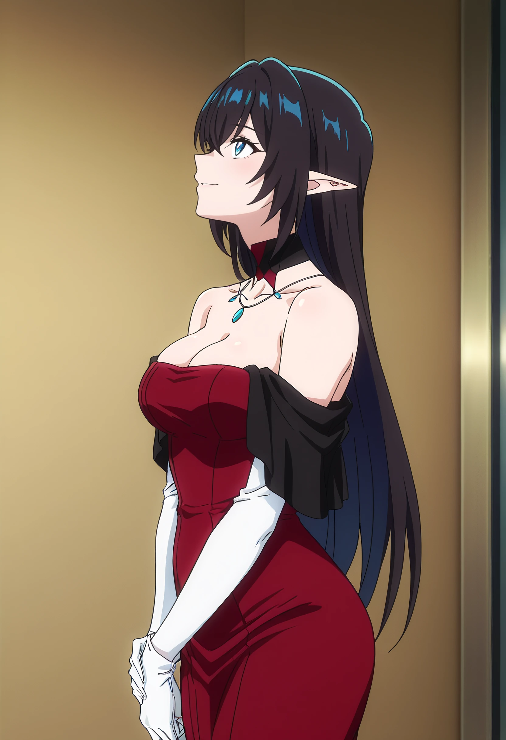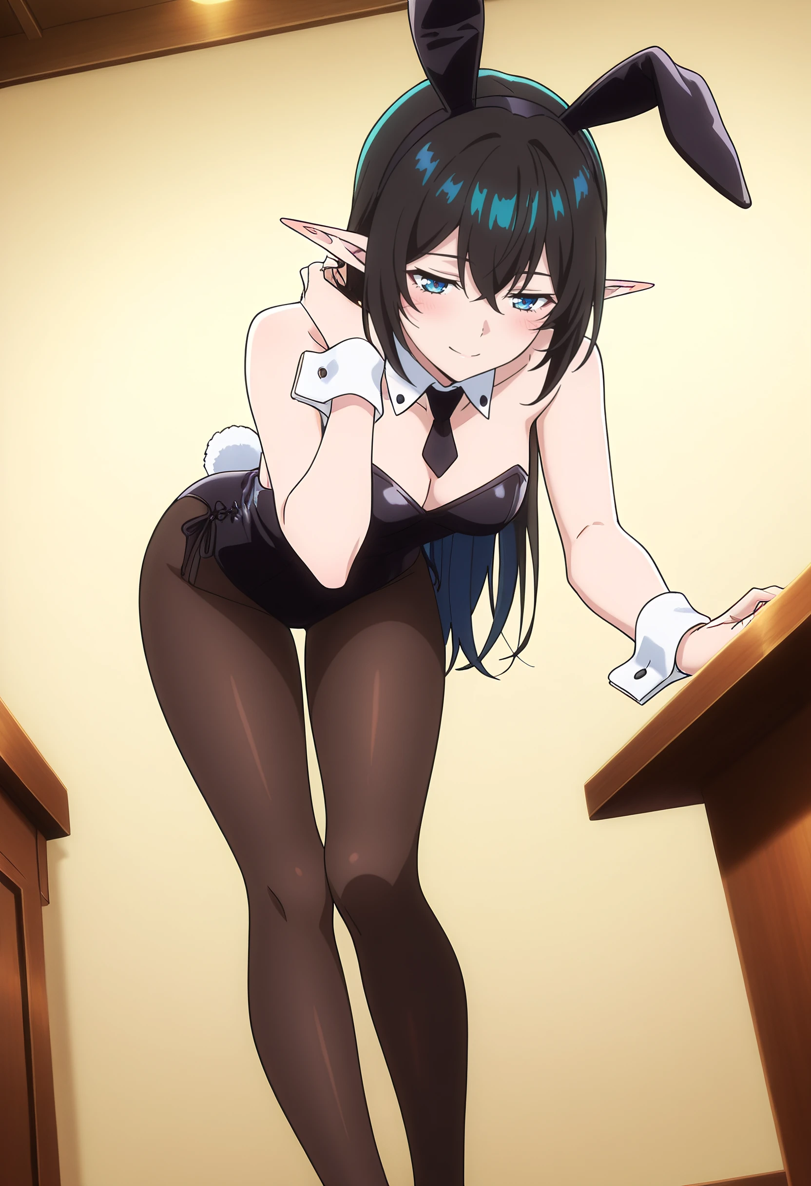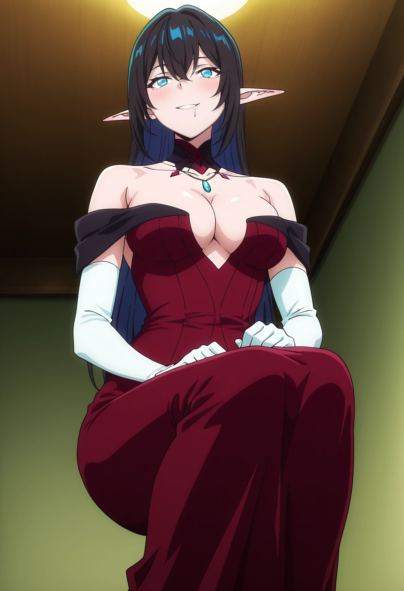 DL2Tratte, elf, long hair, long pointy ears, pointy ears, black hair, hair between eyes, blue eyes, bangs,