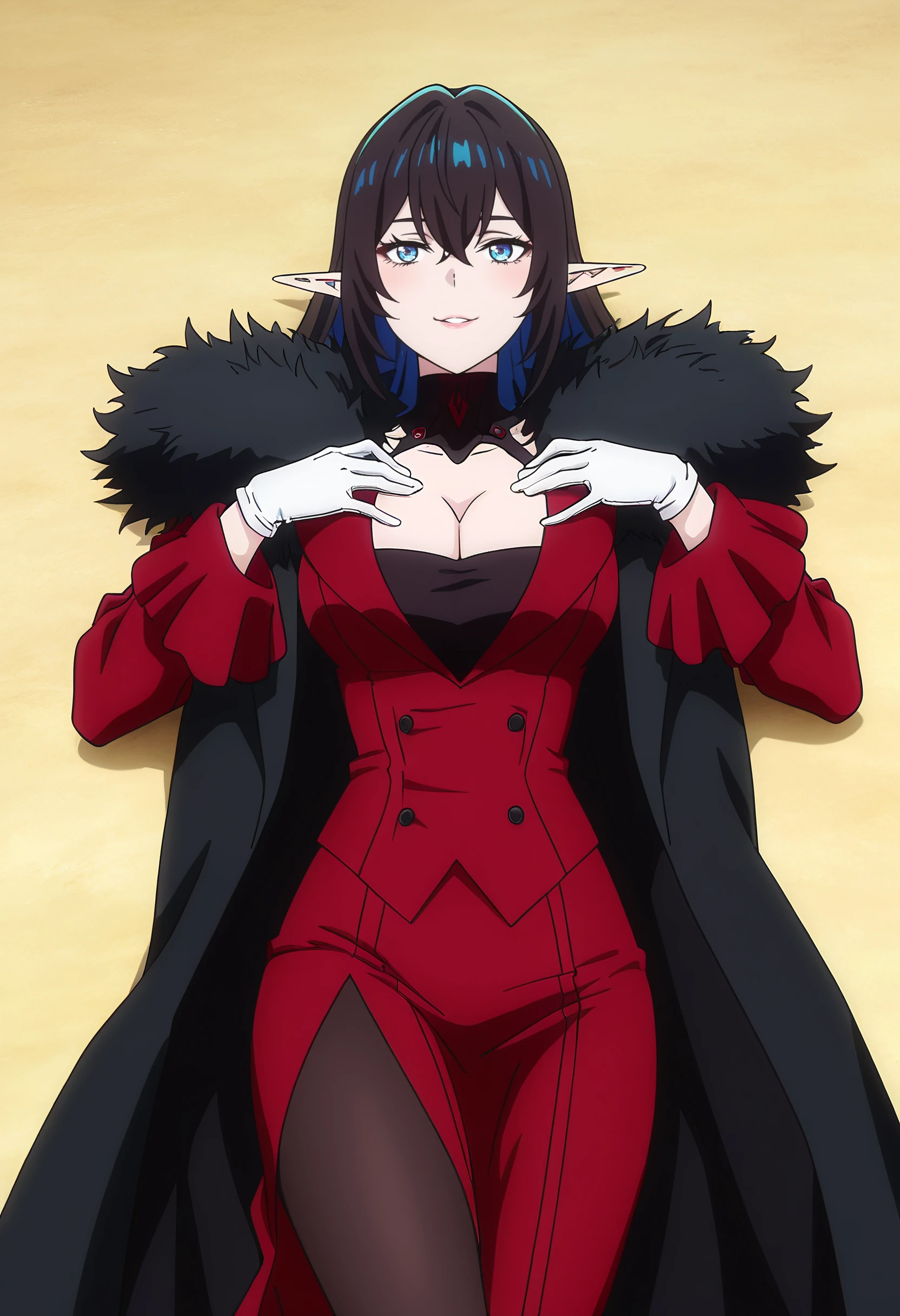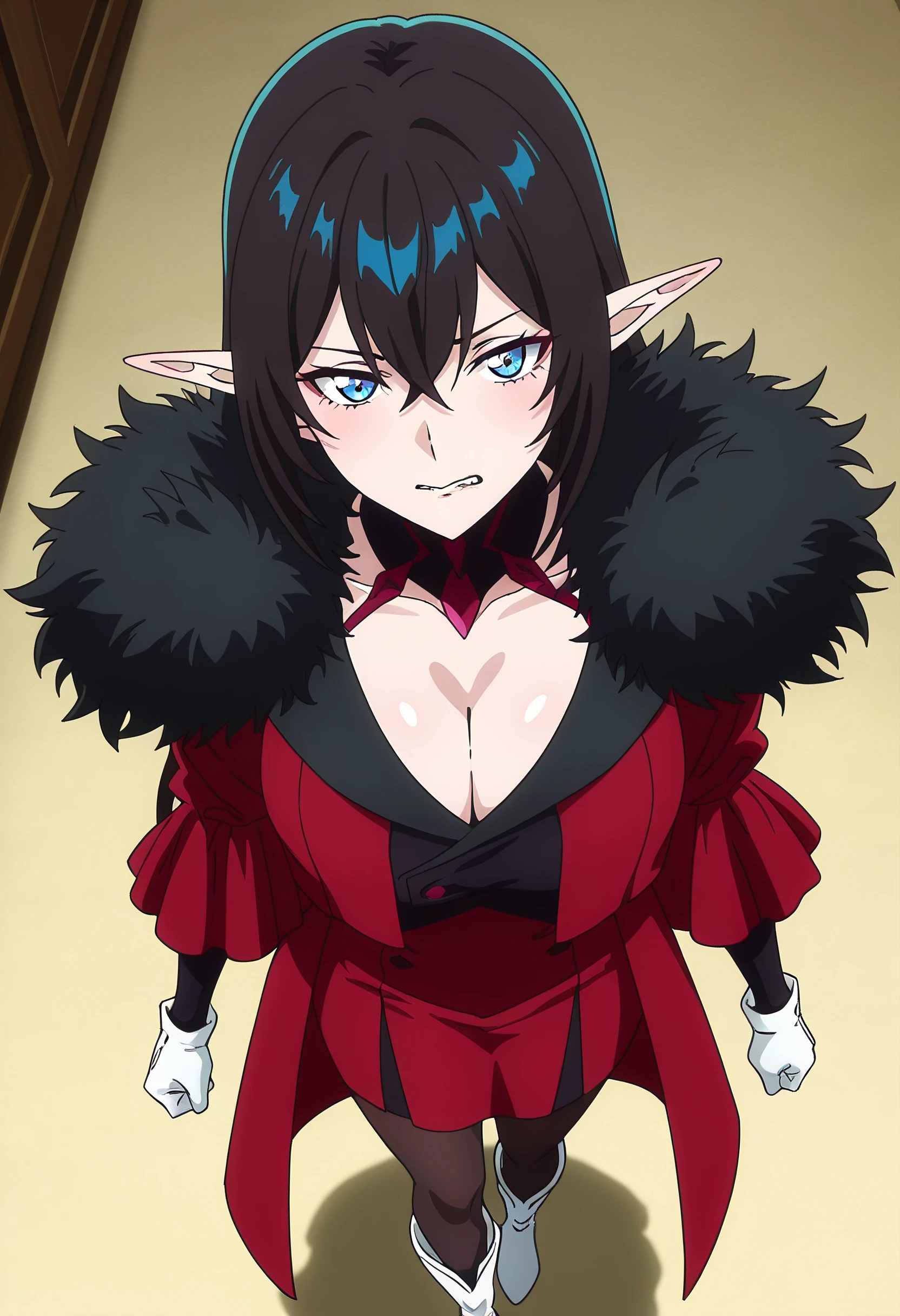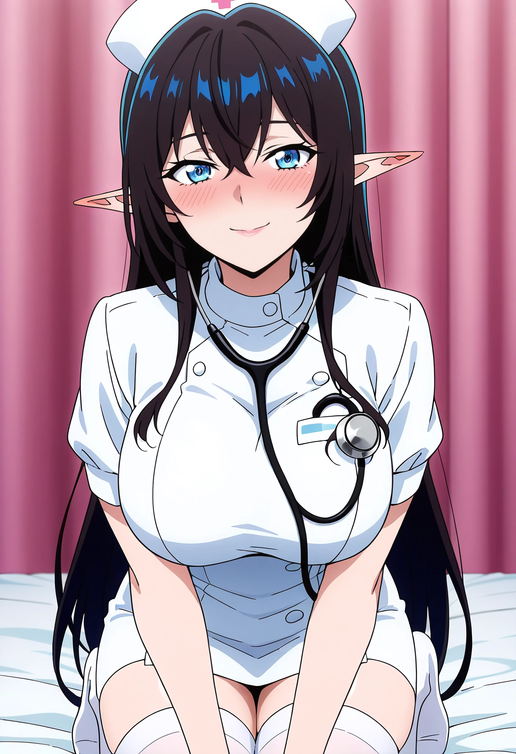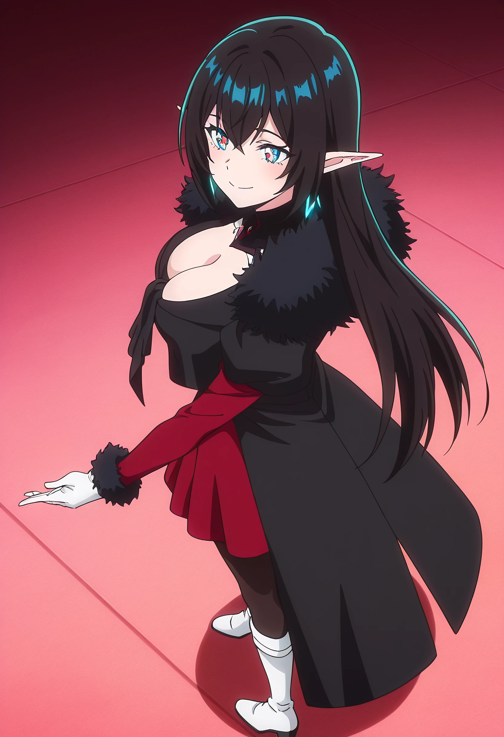 DL2Tratte, elf, long hair, long pointy ears, pointy ears, black hair, hair between eyes, blue eyes, bangs,