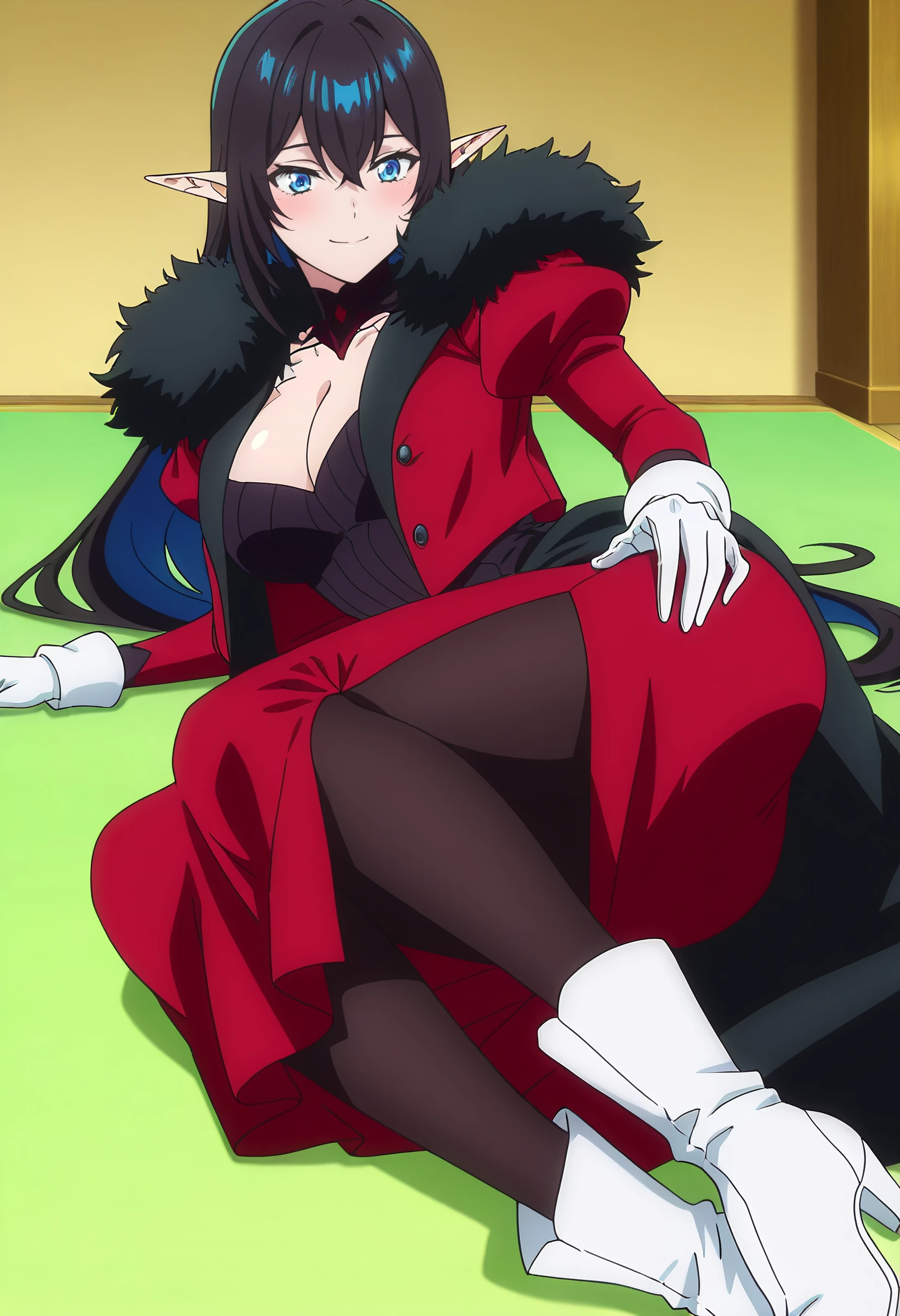 TratteJacket, fur-trimmed jacket, fur trim, fur collar, fur-trimmed sleeves, fur-trimmed coat, fur coat, fur, coat, gloves, skirt, white gloves, black legwear, red skirt, cleavage, white footwear, red sleeves, pantyhose,