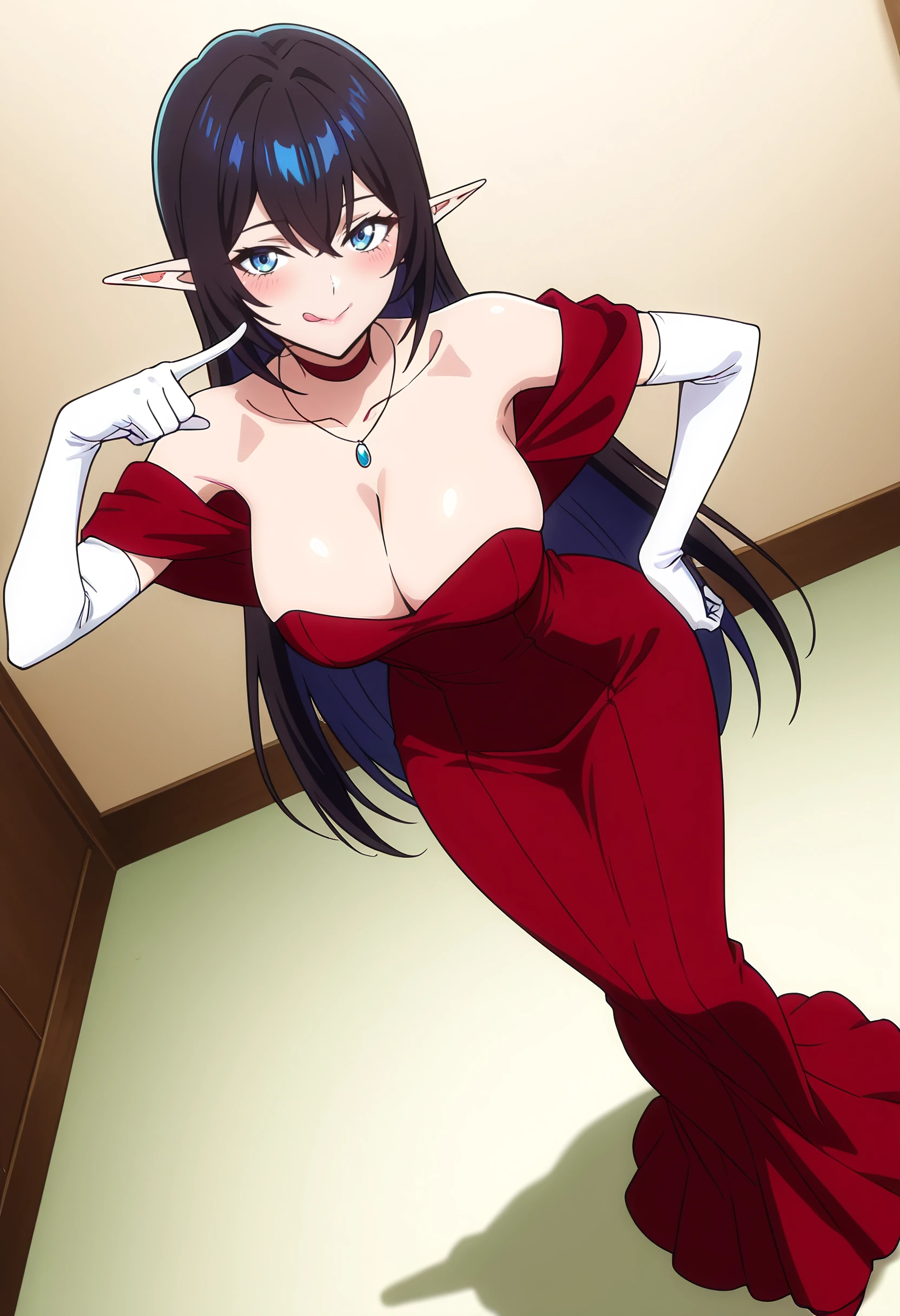 TratteDress, cleavage, bare shoulders, dress, gloves, collarbone, red dress, off shoulder, white gloves, elbow gloves, strapless, jewelry, necklace, long dress, choker,