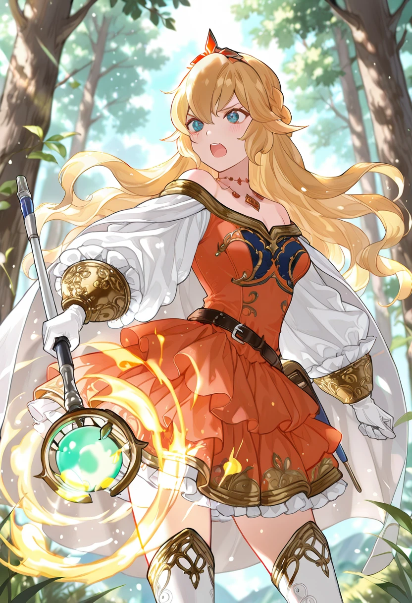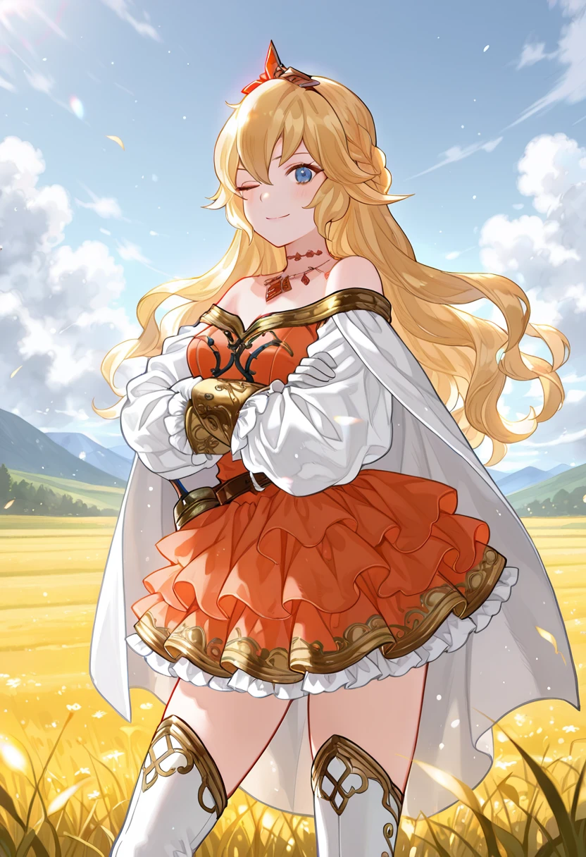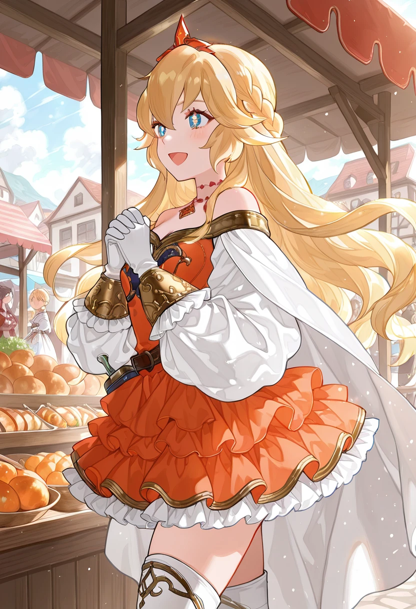 Trigger Words (Outfit): red necklace, orange dress, off shoulder, white sleeves, puffy sleeves, white gloves, white cape, belt, short dress, thigh boots, white boots,