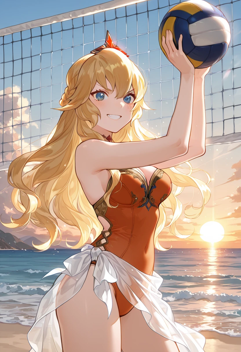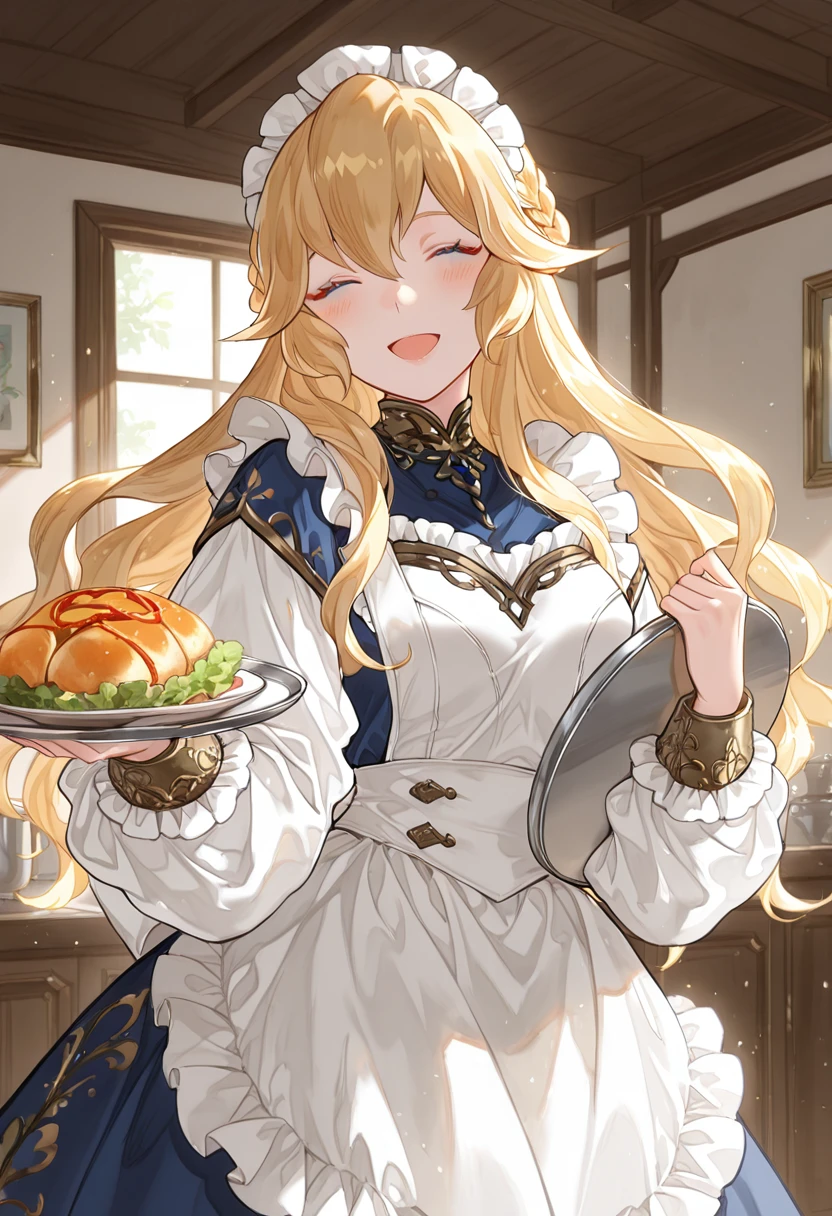 AliceFE, blonde hair, long hair, braid, bangs, sidelocks, blue eyes, red tiara,