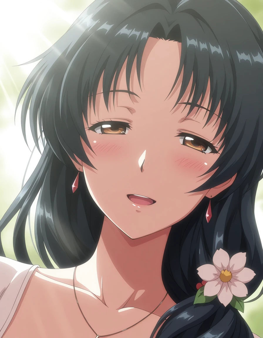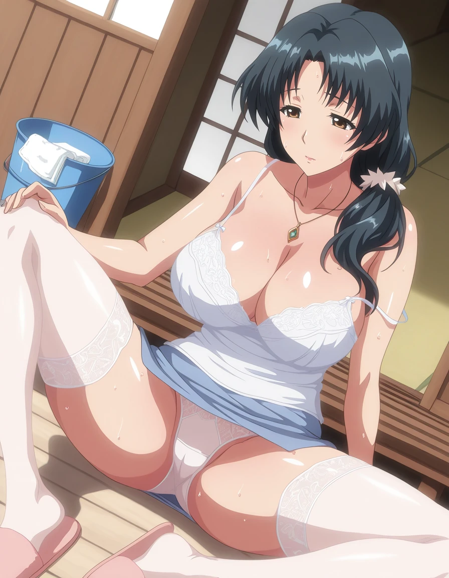 mai_tsmam3,mai_miyurit3,long_hair,side_ponytail,black_hair,brown_eyes,large_breasts,hair_ornament,necklace,white_thighhighs,blue_camisole,white_skirt,miniskirt,white_bra,mature_female,brown_slippers,pendant