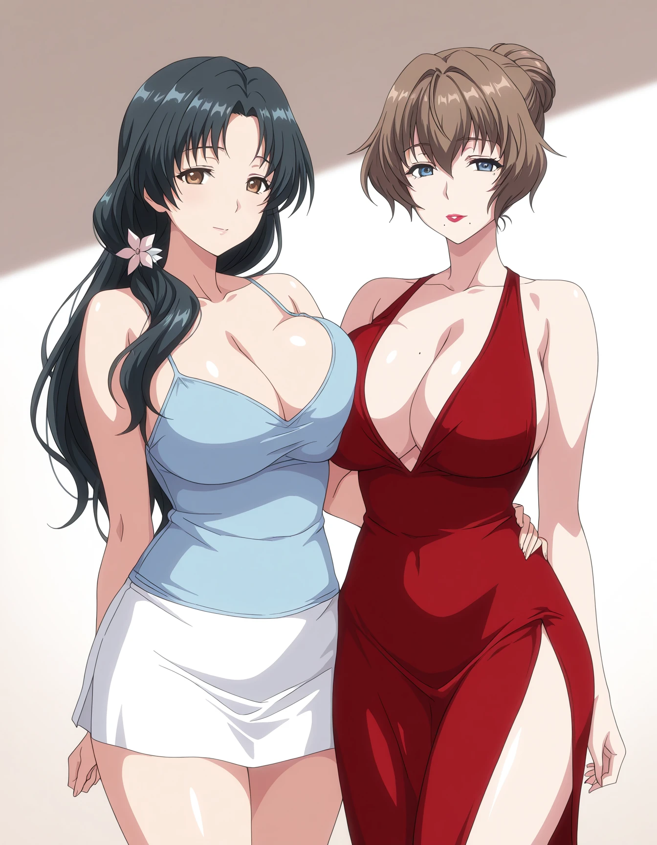 mai_tsmam3,mai_sayokot3,mature_female,short_hair,hair_between_eyes,single_hair_bun,brown_hair,brown_eyes,lipstick,mole_under_mouth,large_breasts,red_choker,earrings,necklace,bracelet,red_dress,pelvic_curtain,garter_straps,black_thighhighs,high_heels