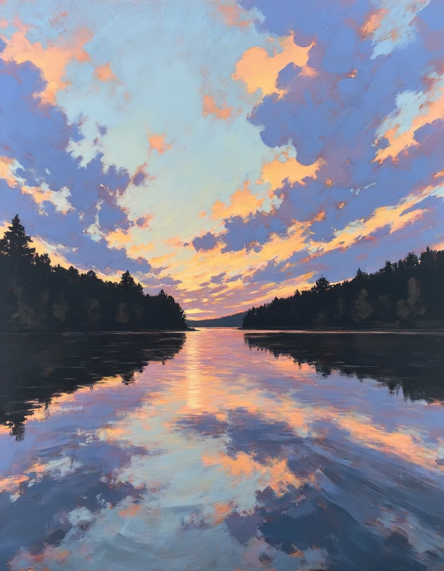 an oil painting of a red canoe gliding through a serene lake, surrounded by yellow lily pads, with a backdrop of lush green trees reflecting in the water under a wide sky filled with swirling clouds in shades of blue and white in the style of jim-musil