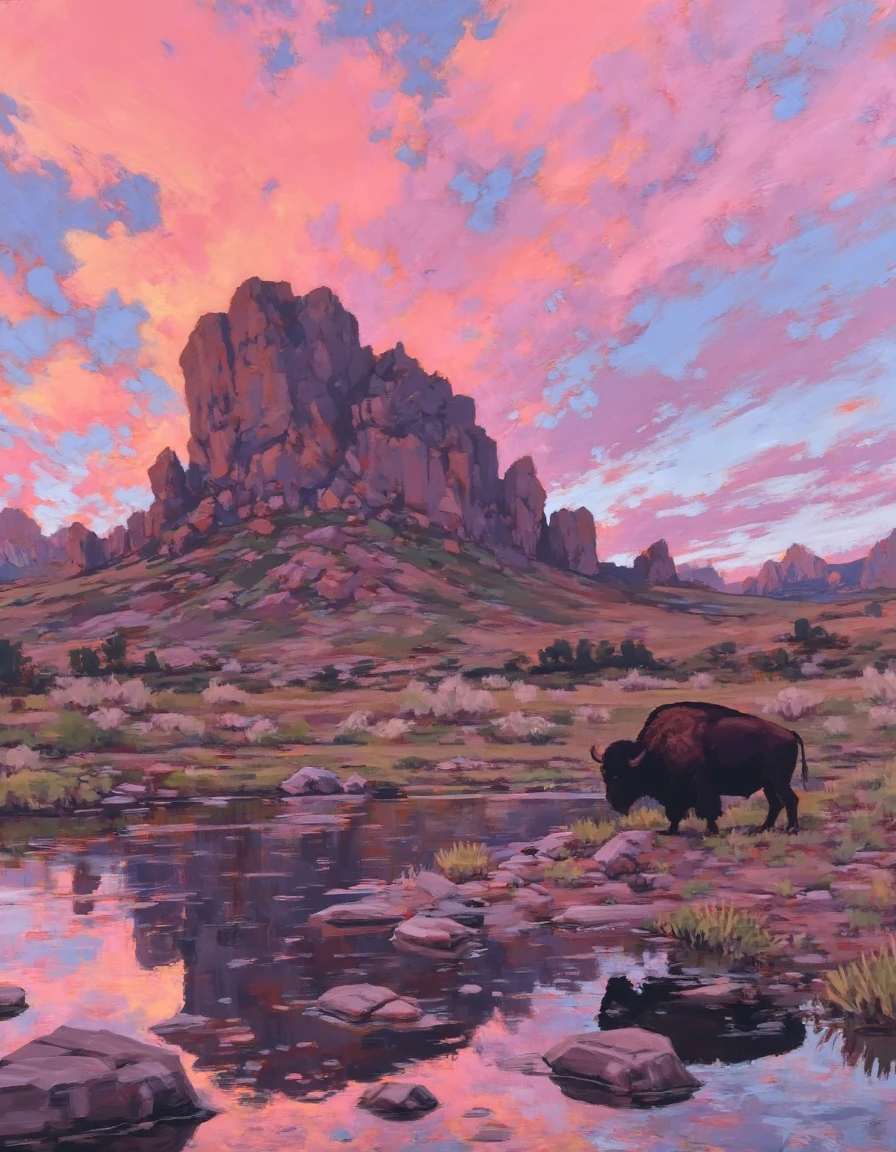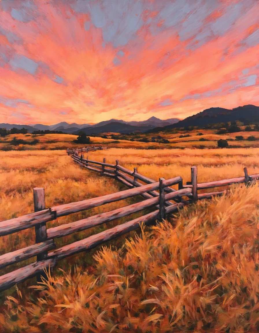 an oil painting of a vibrant red barn nestled amidst golden fields under an expansive sky painted with swirling hues of pink, orange, and blue, casting a warm glow over the landscape and reflecting a sense of peaceful solitude as a dirt path leads through the scene in the style of jim-musil