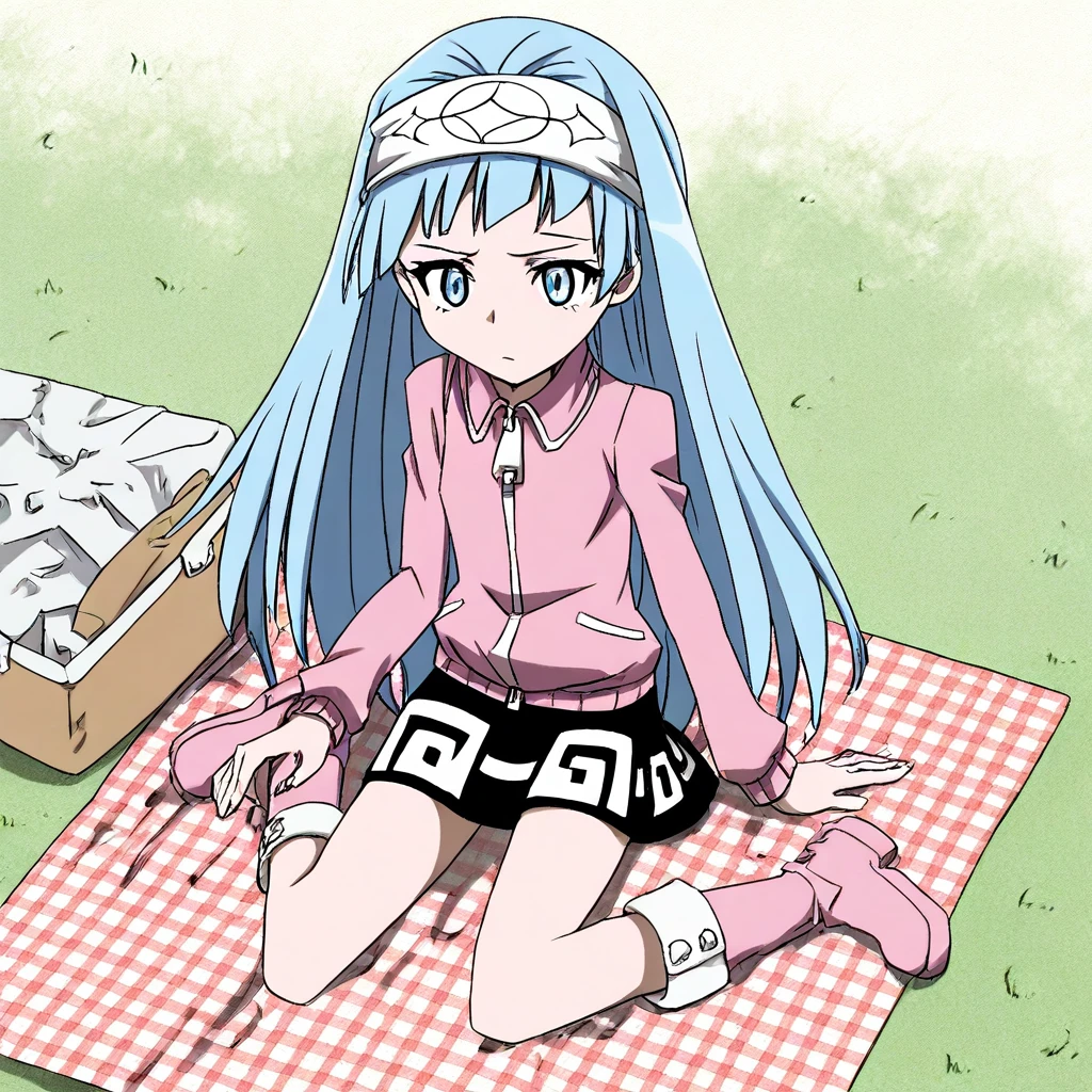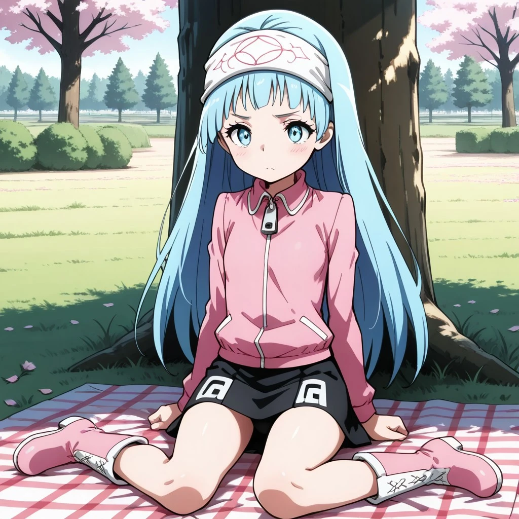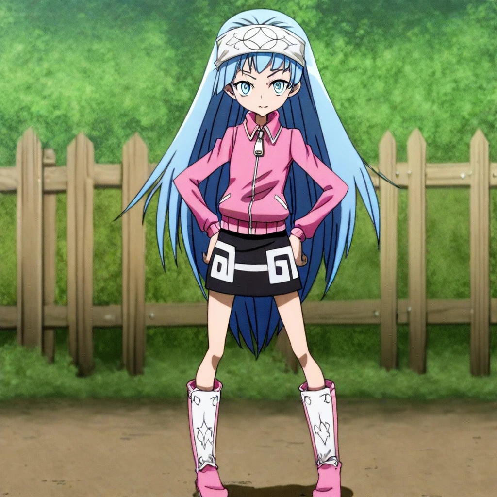 usui_sk, blue hair, long hair, blue eyes, headband, track jacket, zipper, skirt, boots