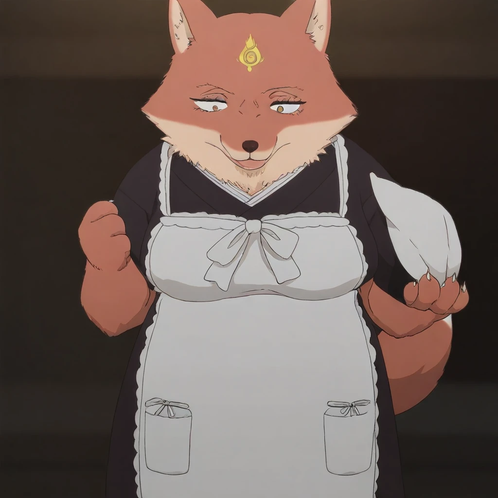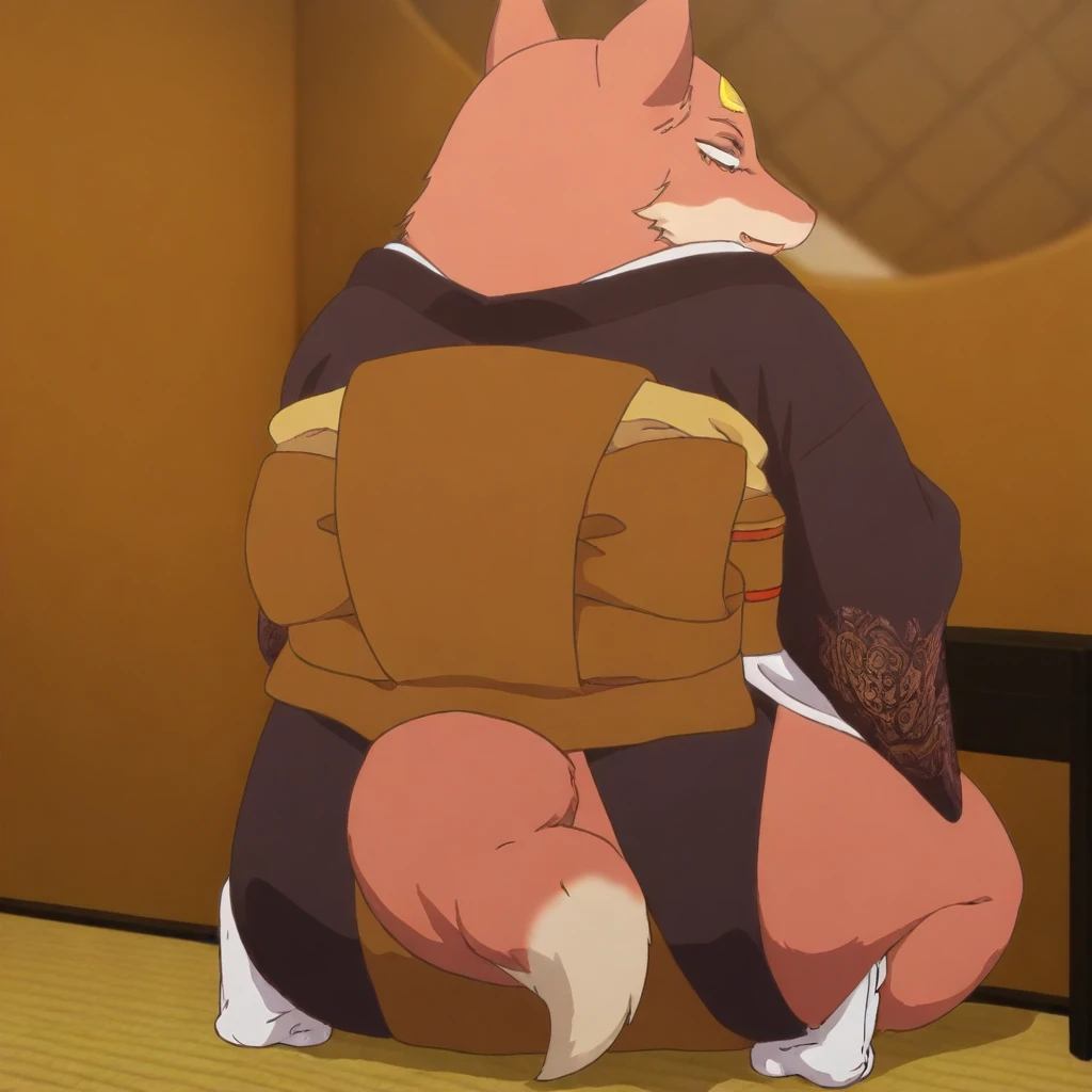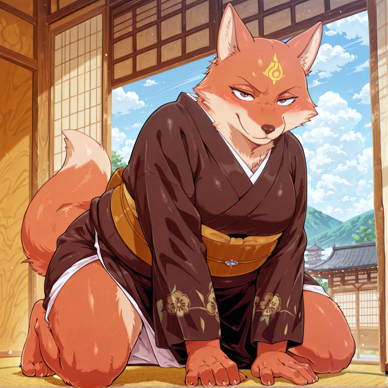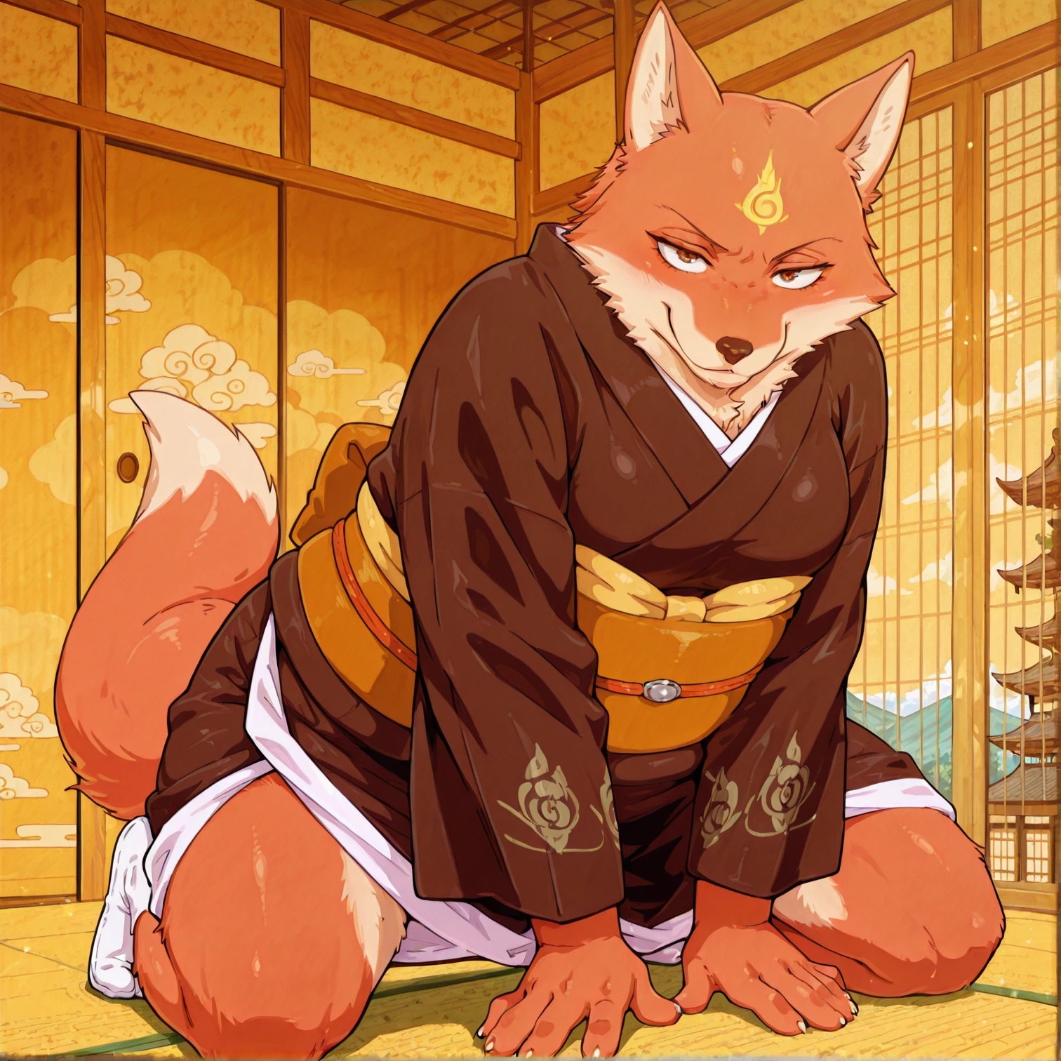 Tsubaki,fox,anthro,forehead markings,yellow markings,brown eyes,brown and white body,brown and white fur,tail