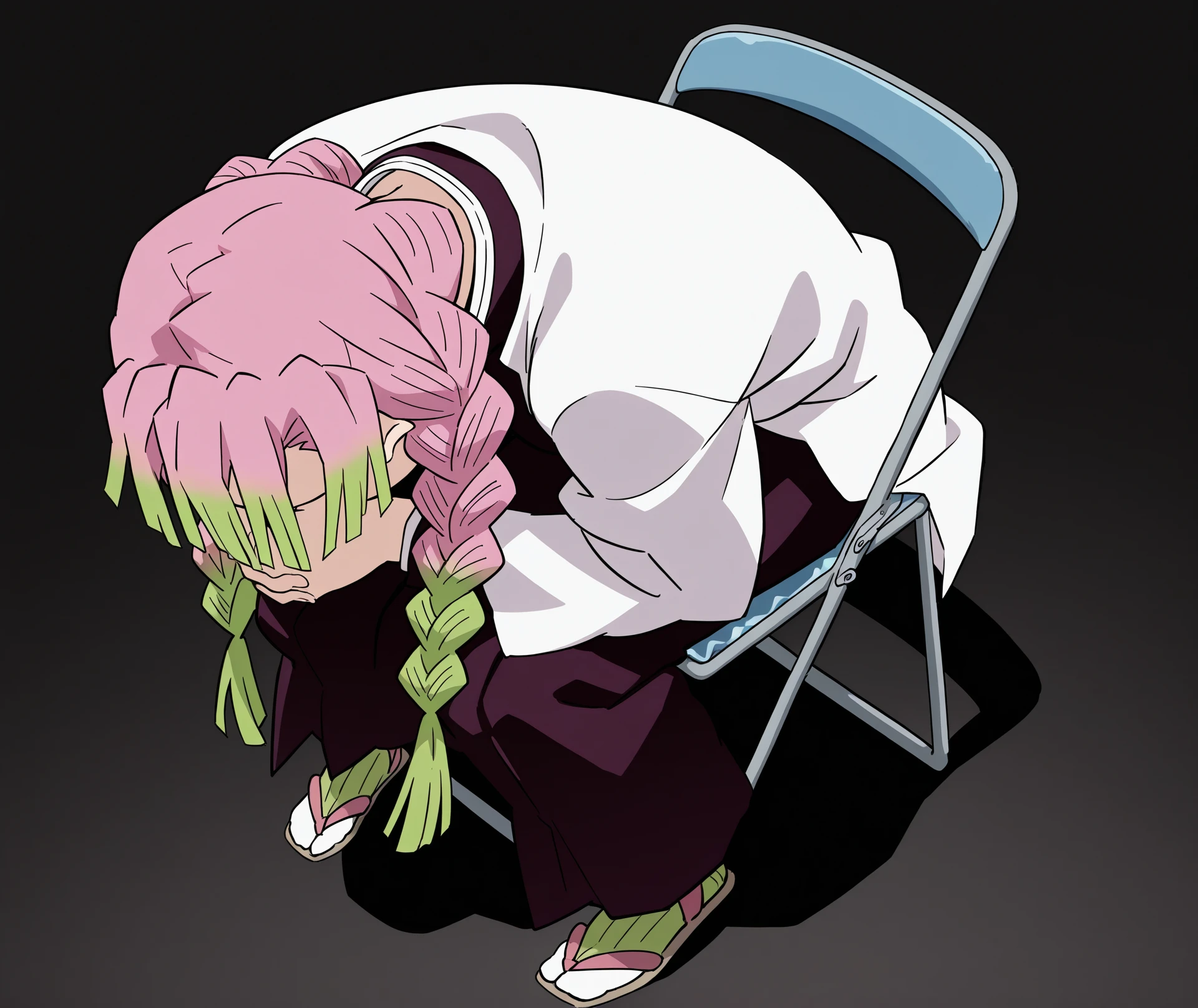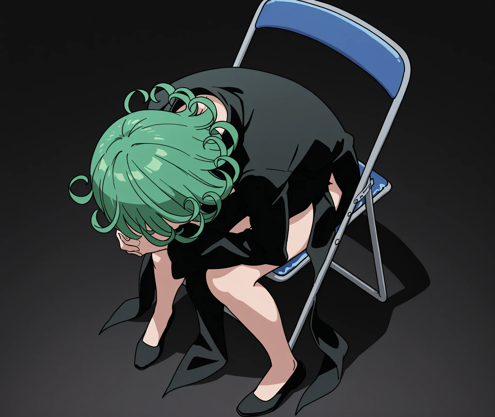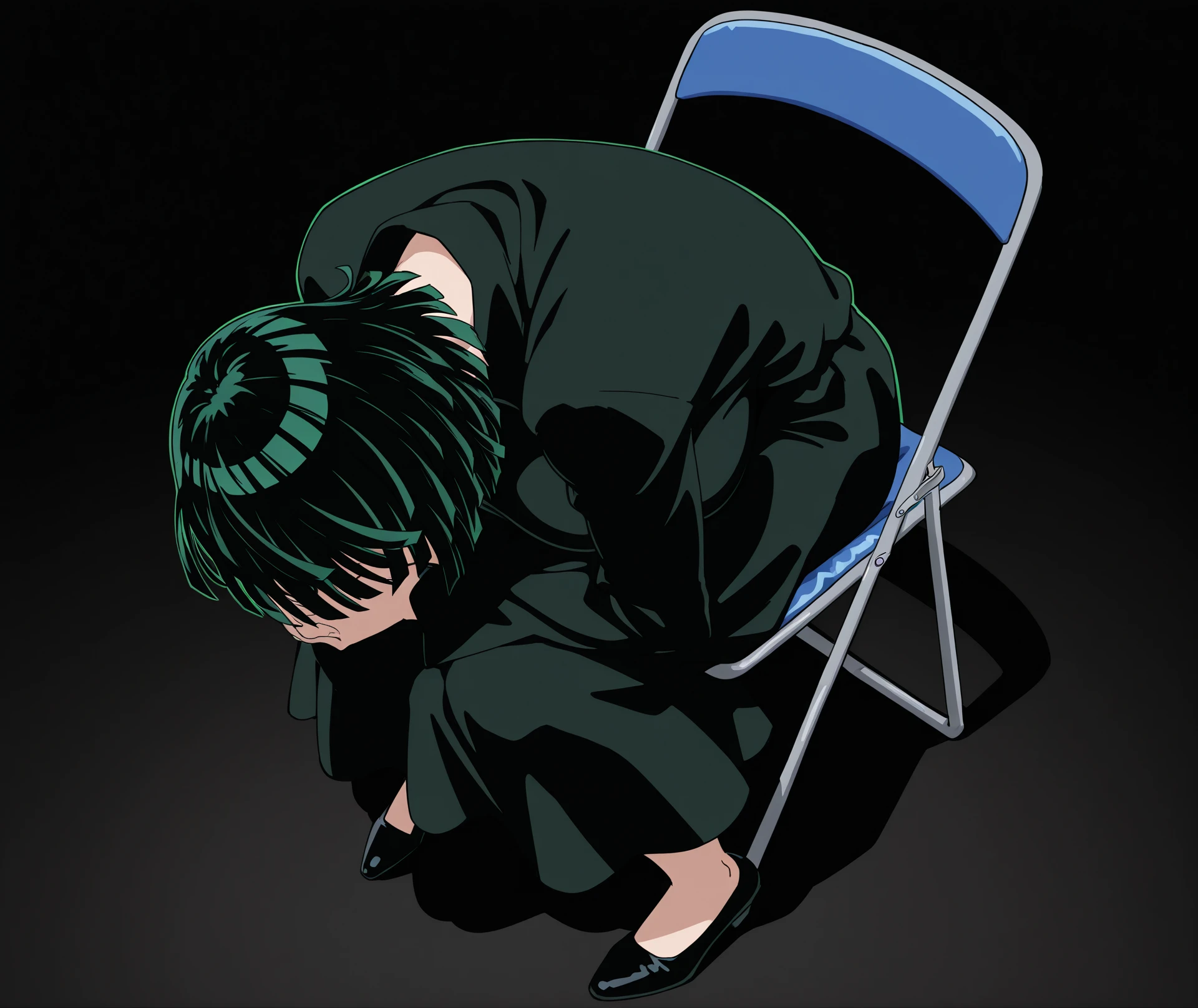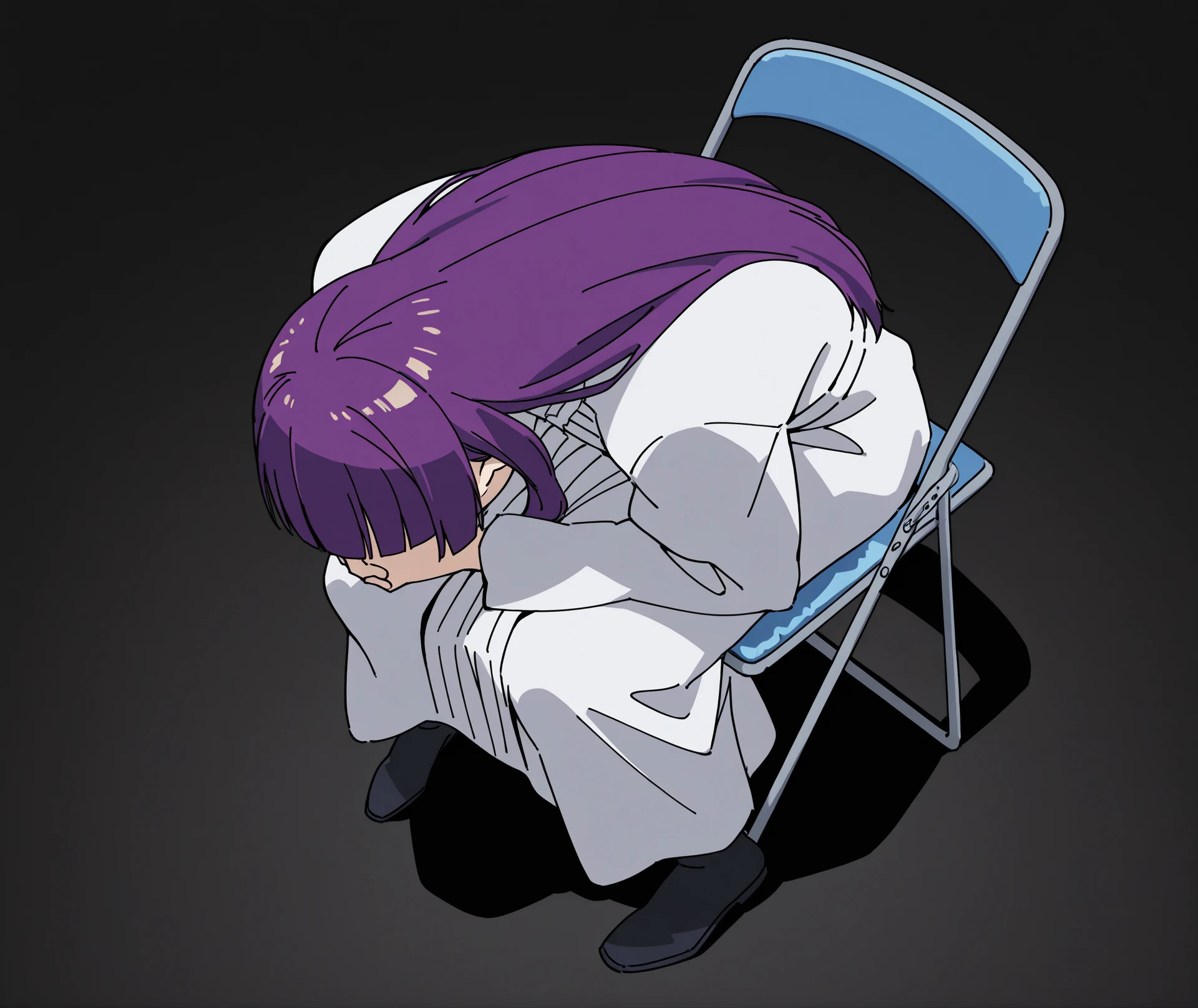 sitting, full body, from above, chair, parody, meme, own hands clasped, head down, folding chair, shinji in a chair \(meme\),