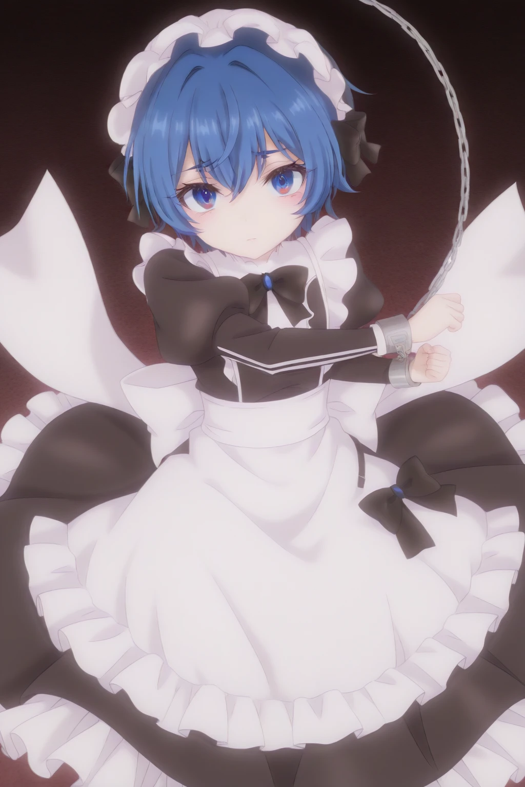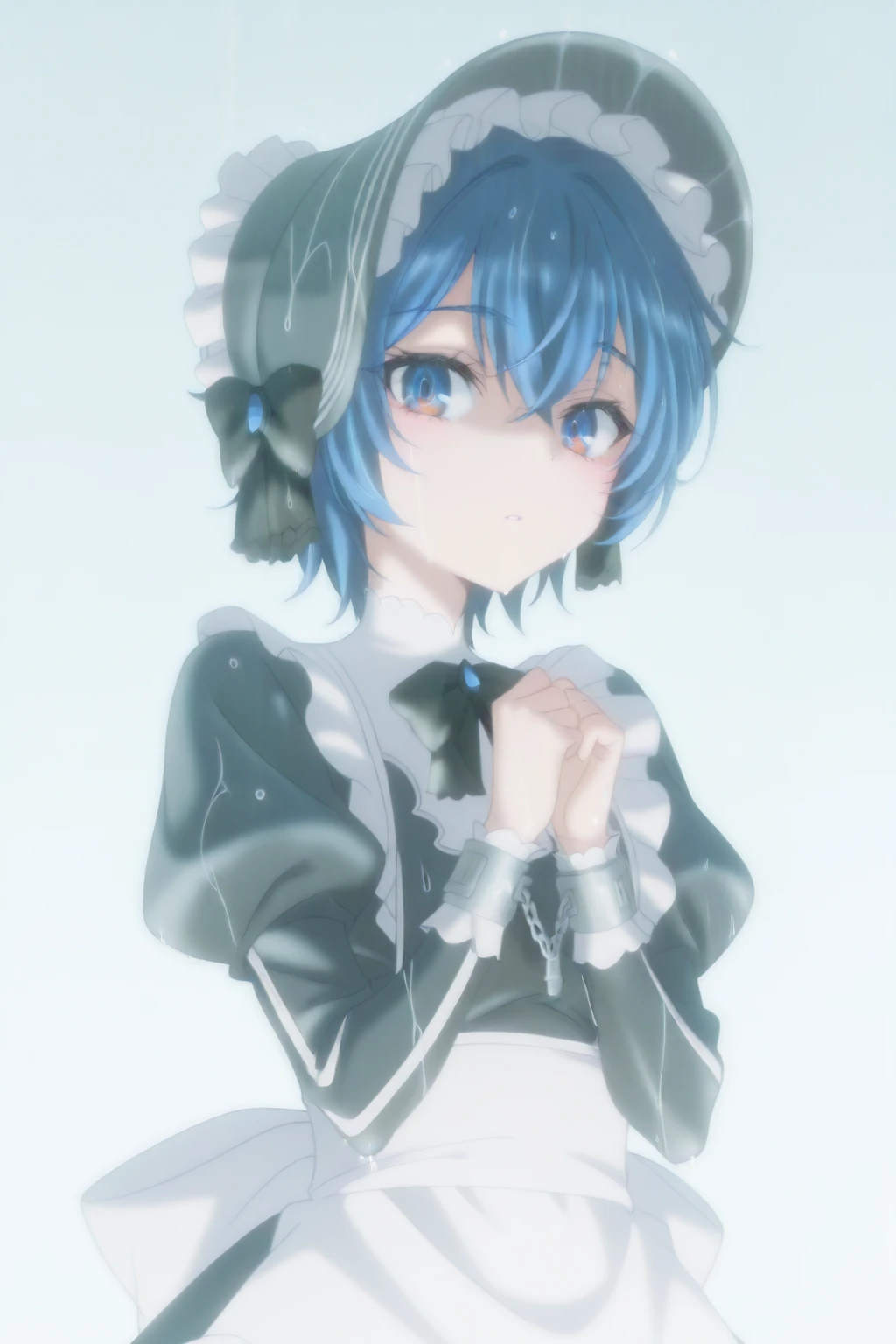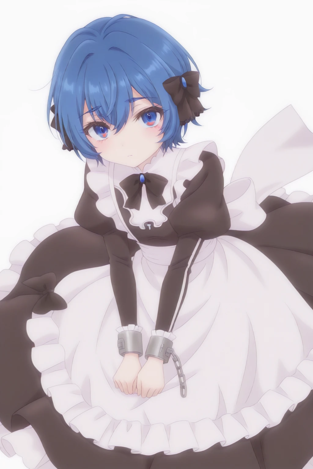 maid, hat, bowtie, black frilled headwear, black dress, juliet puffy sleeves, black bow, long sleeves