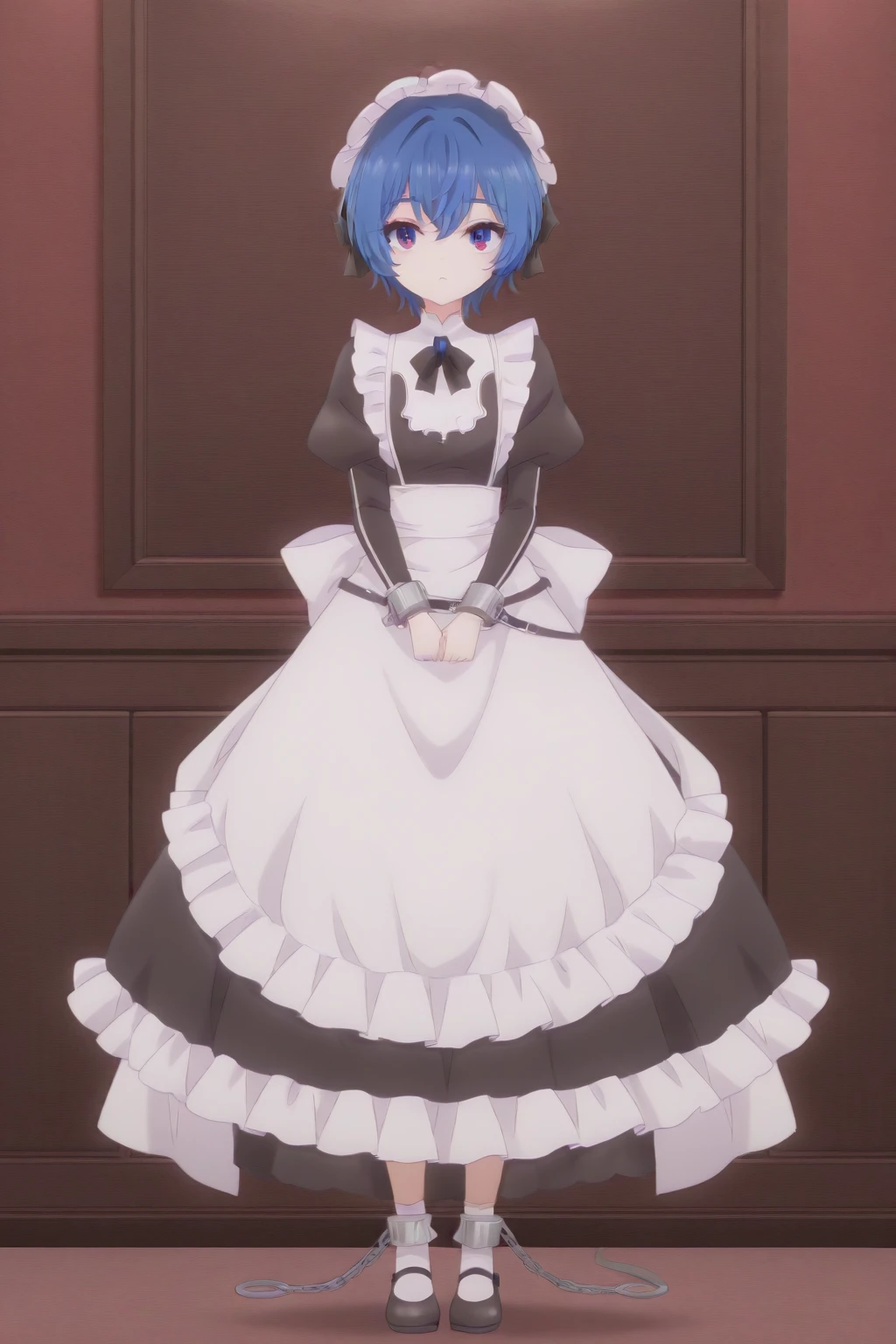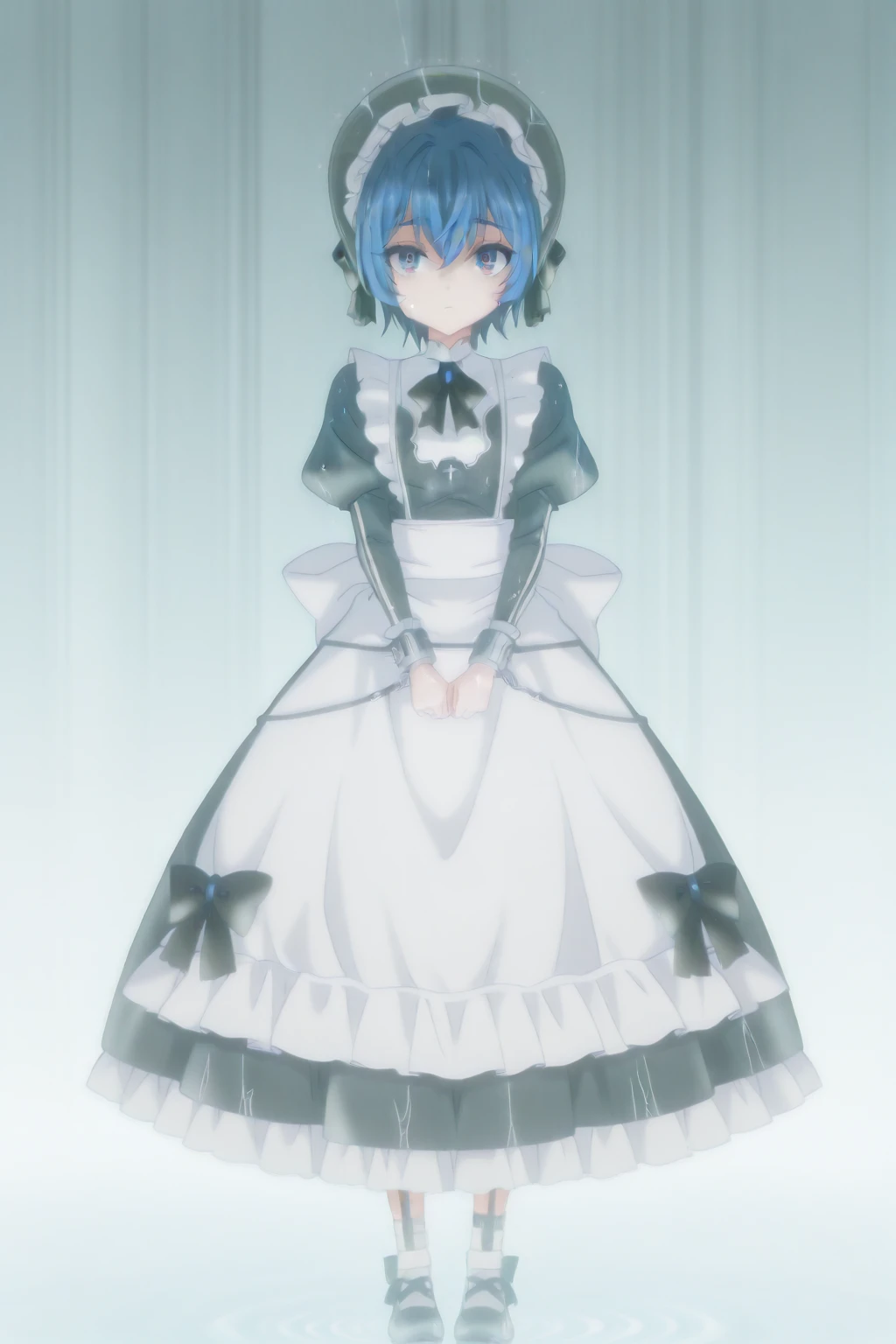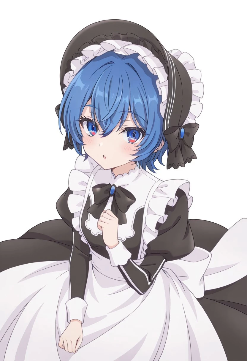 maid, hat, bowtie, black frilled headwear, black dress, juliet puffy sleeves, black bow, long sleeves