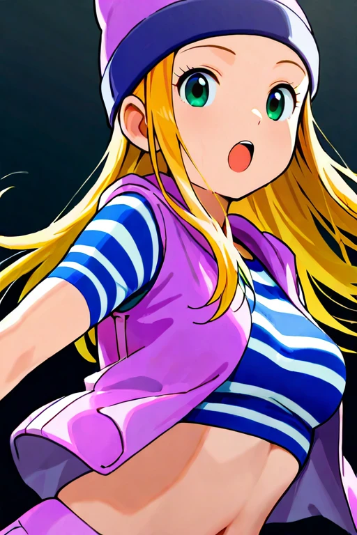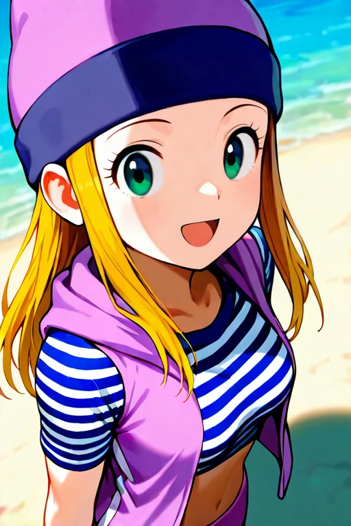 1girl, solo, izumi_orimoto, long hair, blonde hair, green eyes, beanie, purple headwear,