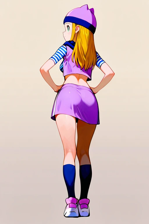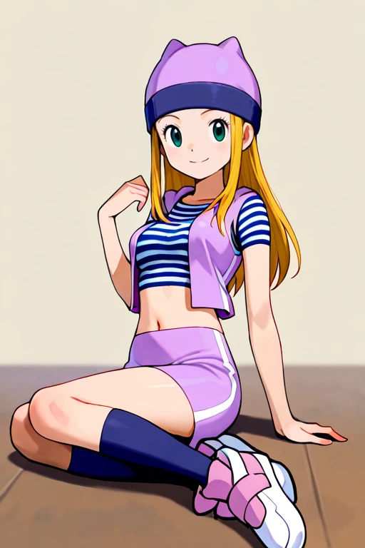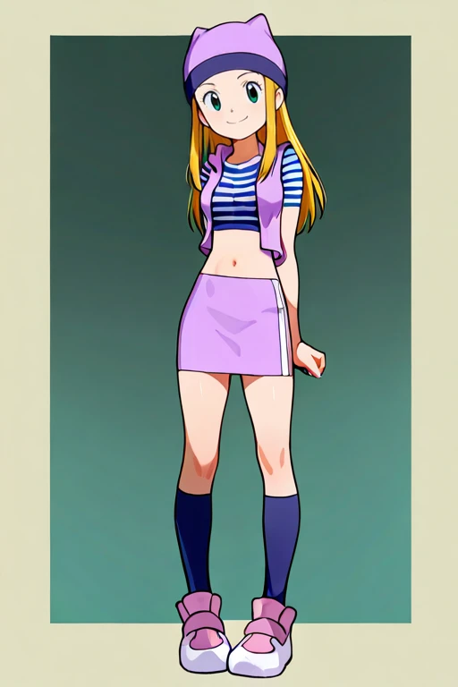 medium breasts, izumidef, short sleeves, purple vest, striped shirt, crop top, navel, purple skirt, kneehighs, socks, shoes,
