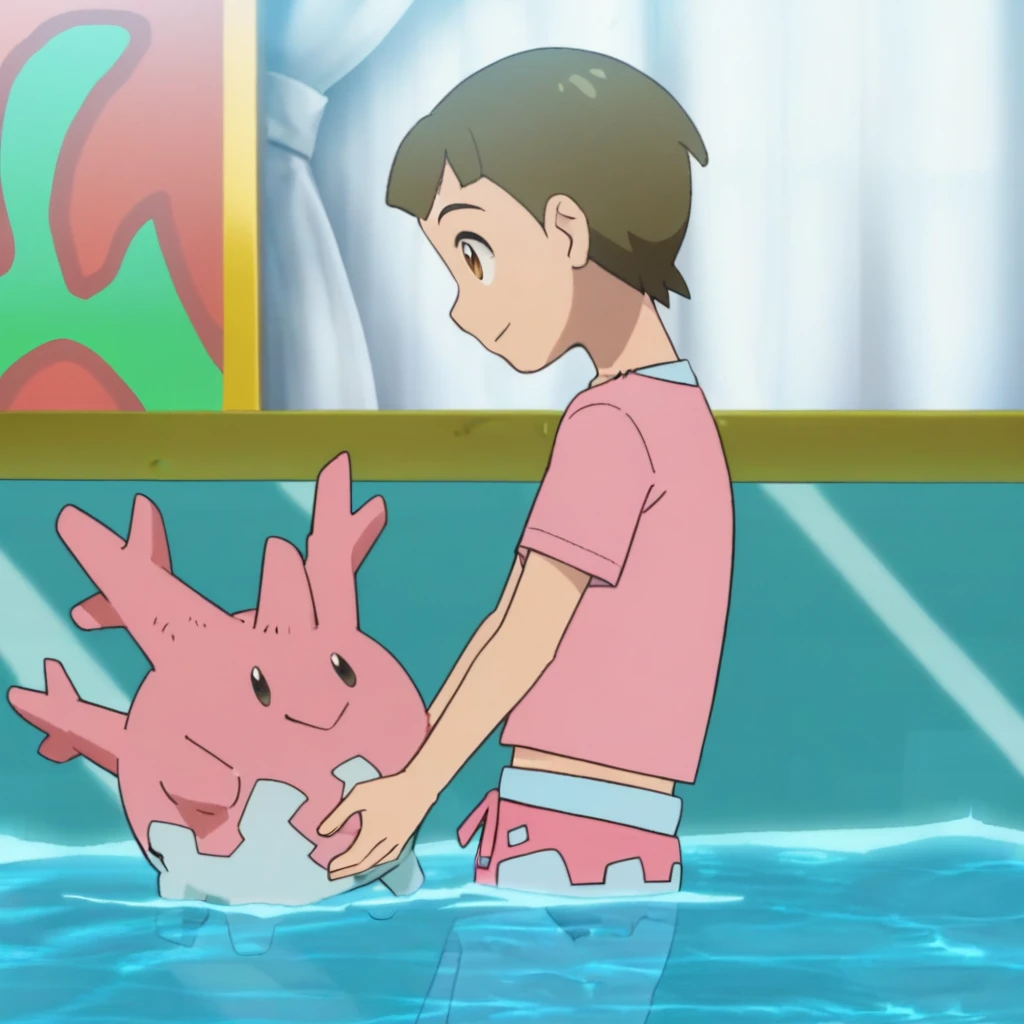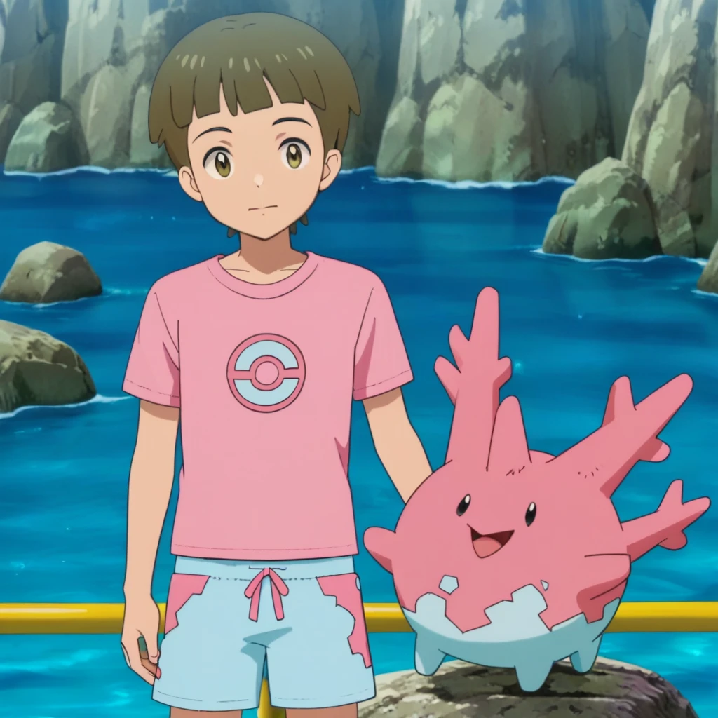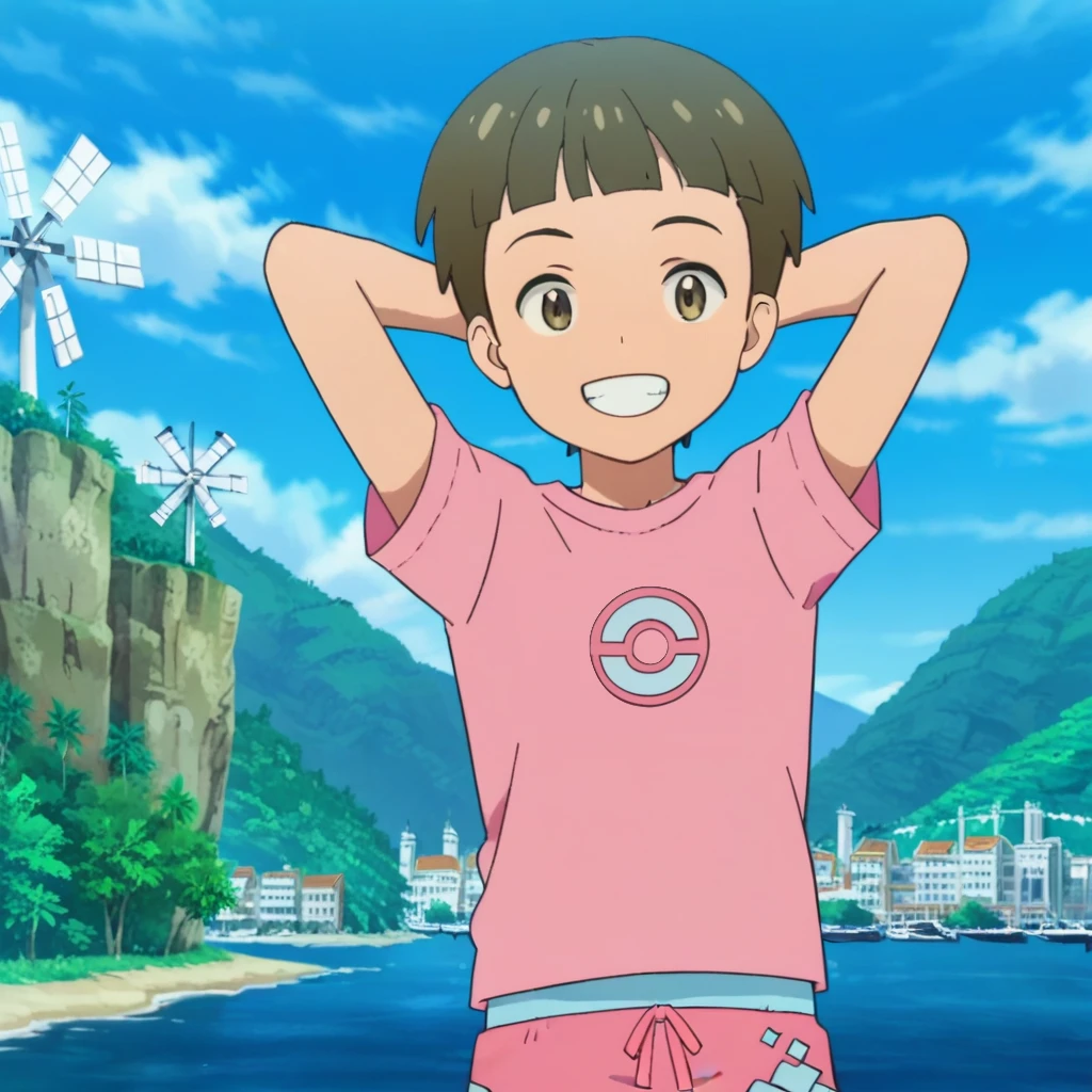 Prompts: male, brown hair, blunt bangs, brown eyes, pink t-shirt, male swimwear, pink swim trunks, barefoot, outdoors (stage/sign/curtains/swimming pool/water), outdoors (harbor/sky/cloud/sea/mountain/cliff/beach/sand/palm tree/greenery/windmill/cityscape/lighthouse/boat/horizon), outdoors (obstacle course/blue sky/ocean/rock/slide/trampoline/platform/bird)