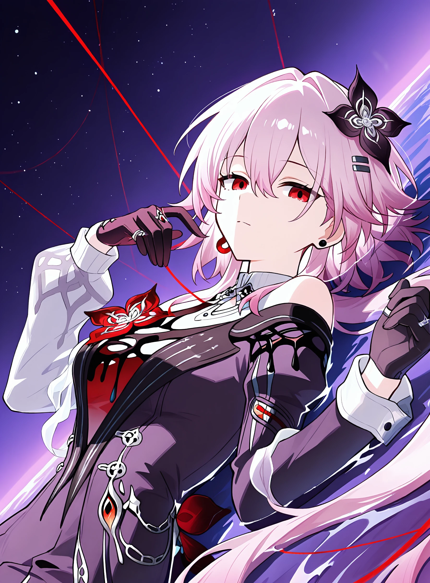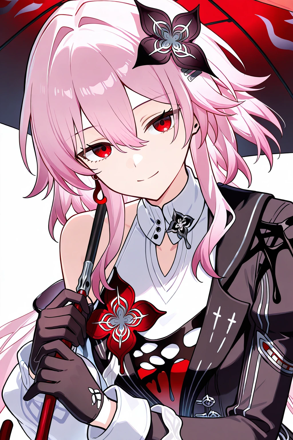 evernight\(honkai:star rail\), white shirt, red eyes, pink hair, solo, earrings, jewelry, gloves, looking at viewer, black gloves, upper body, long hair, simple background, long sleeves, hair flower, black flower, ???? shoulders, single ???? shoulder, bangs, crossed bangs, closed mouth, shirt,