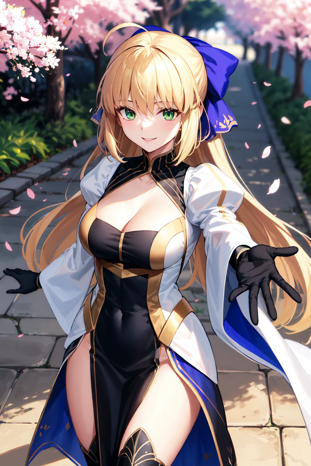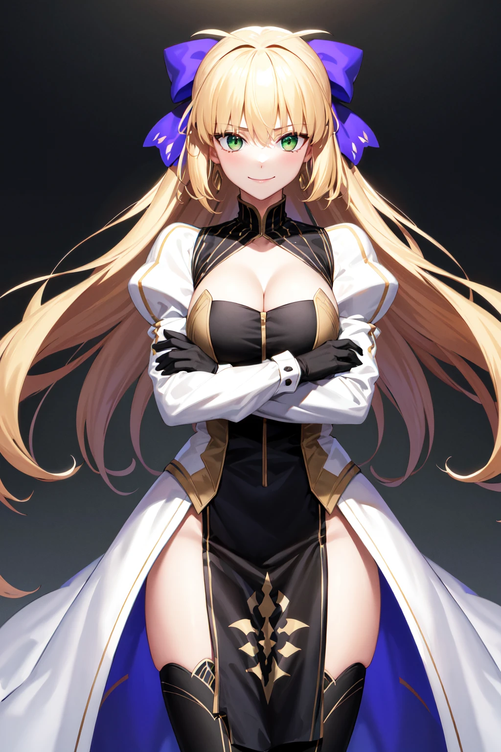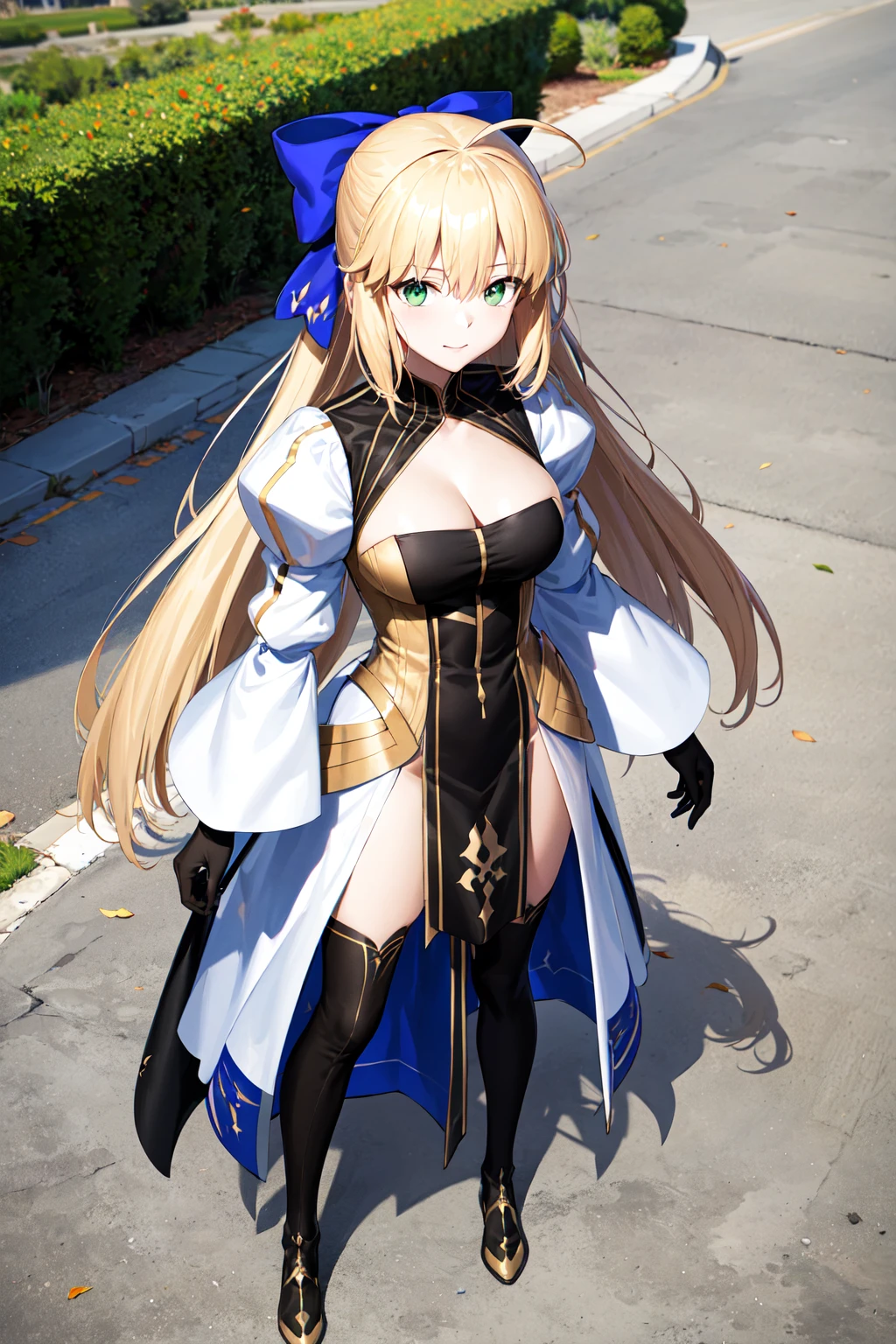 outfit3aacaster, long hair, blonde hair, ahoge, split ponytail, hair bow, blue bow, green eyes, medium breasts, cleavage cutout, two-tone dress, white dress, puffy sleeves, long sleeves, wide sleeves, black gloves, pelvic curtain, black thighhighs