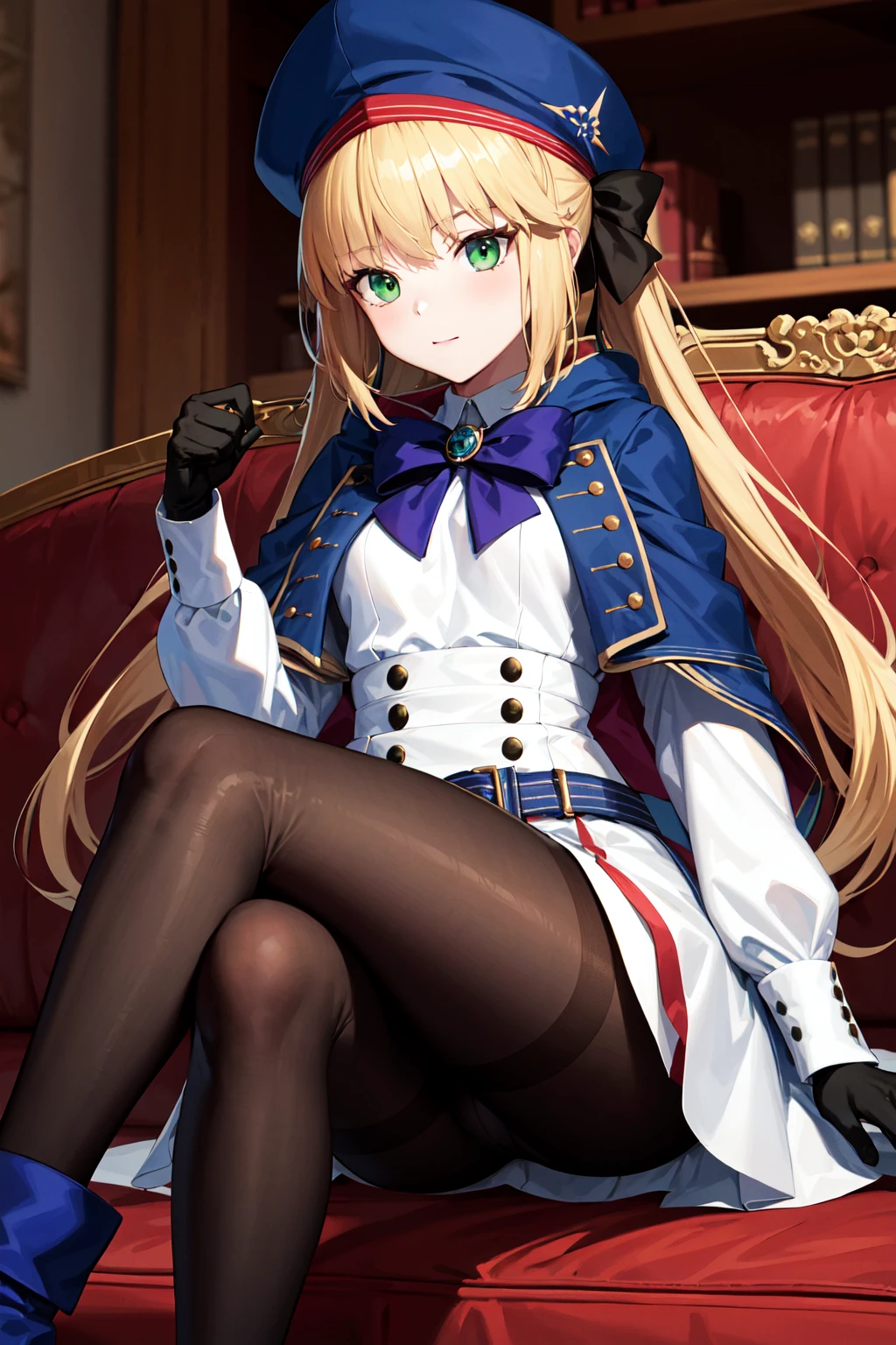 outfit2aacaster, long hair, blonde hair, twintails, hair bow, beret, blue headwear, green eyes, small breasts, blue bowtie, blue cape, white dress, long sleeves, black gloves, buttons, blue belt, black pantyhose