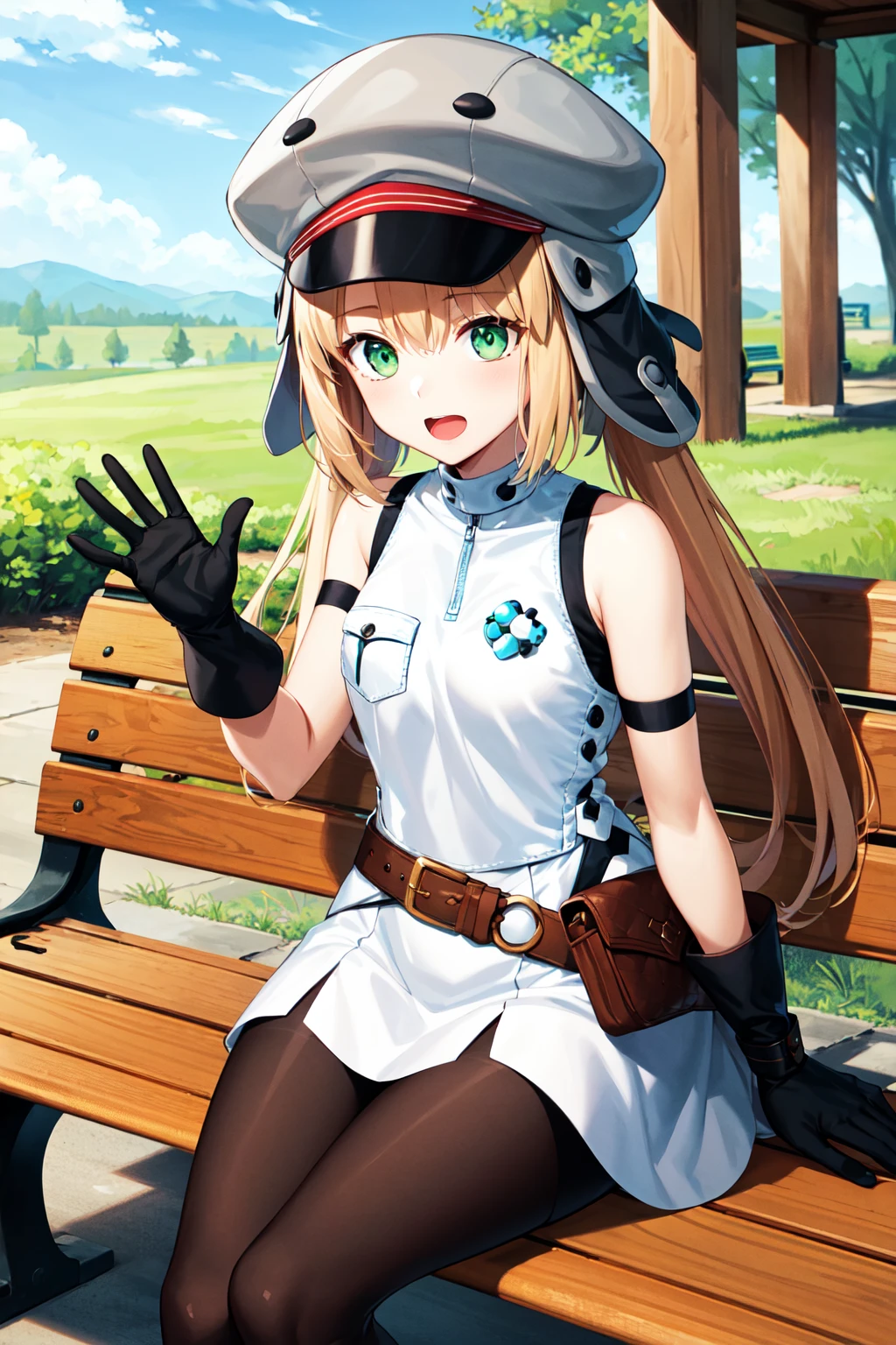 outfit1aacaster, long hair, blonde hair, twintails, cabbie hat, grey headwear, green eyes, small breasts, white shirt, sleeveless, armband, grey gloves, brown belt, pouch, grey skirt, black pantyhose