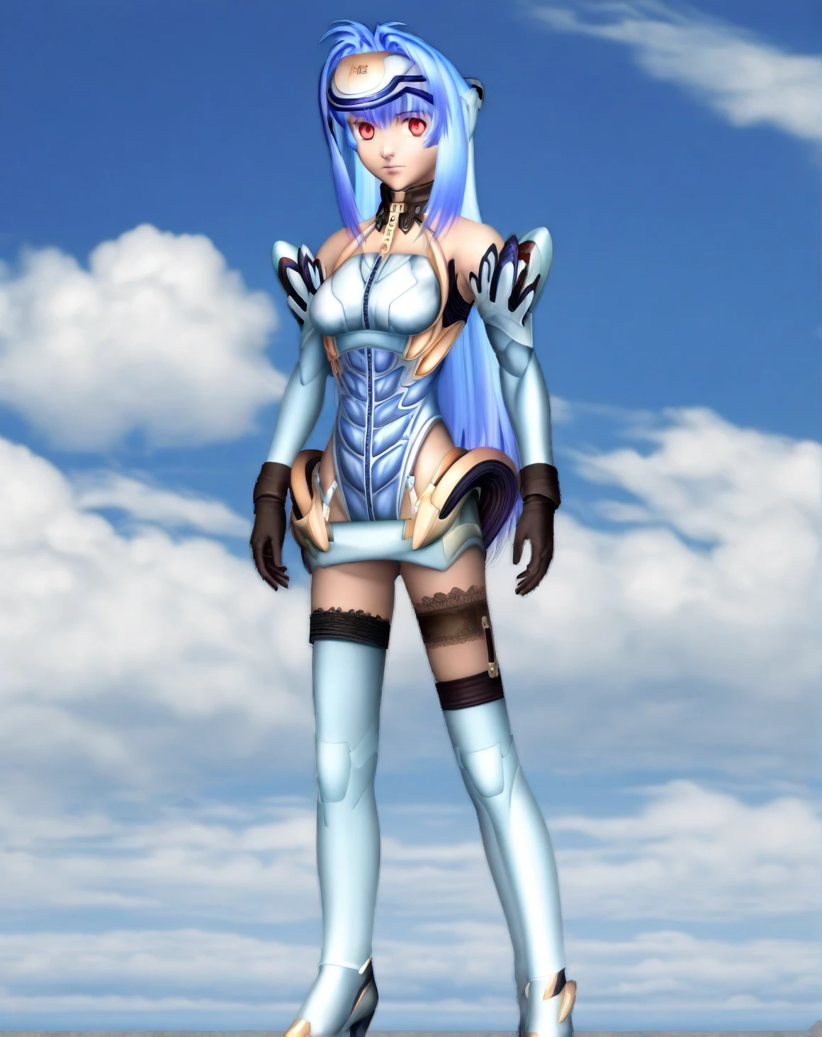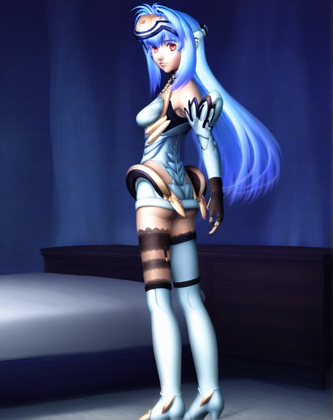 kos-mos, zipper, expressionless, white thighhighs, lips, bedroom, detailed background, high heels, blue hair, android, 1girl, solo, masterpiece, best quality, newest, absurdres, 3d, looking at viewer, big anime eyes, spaceship background, official art,