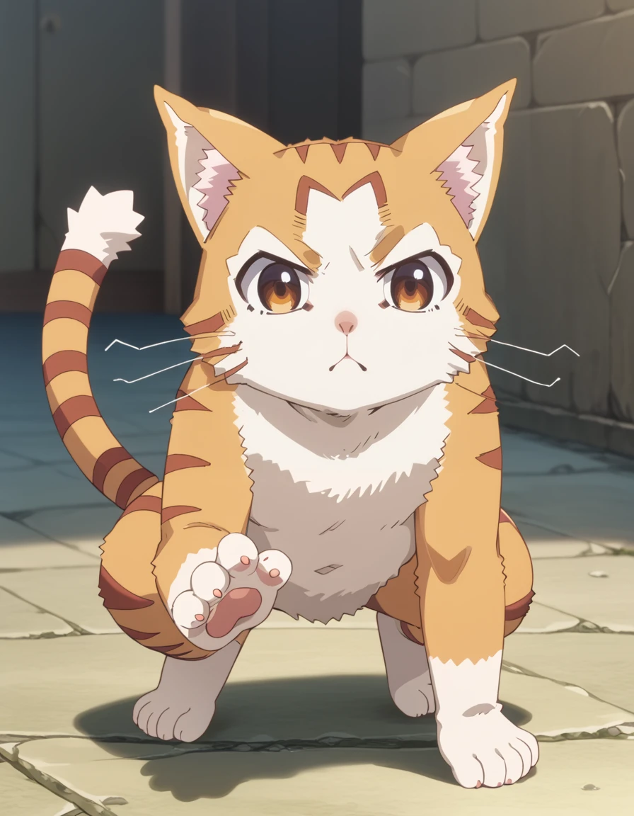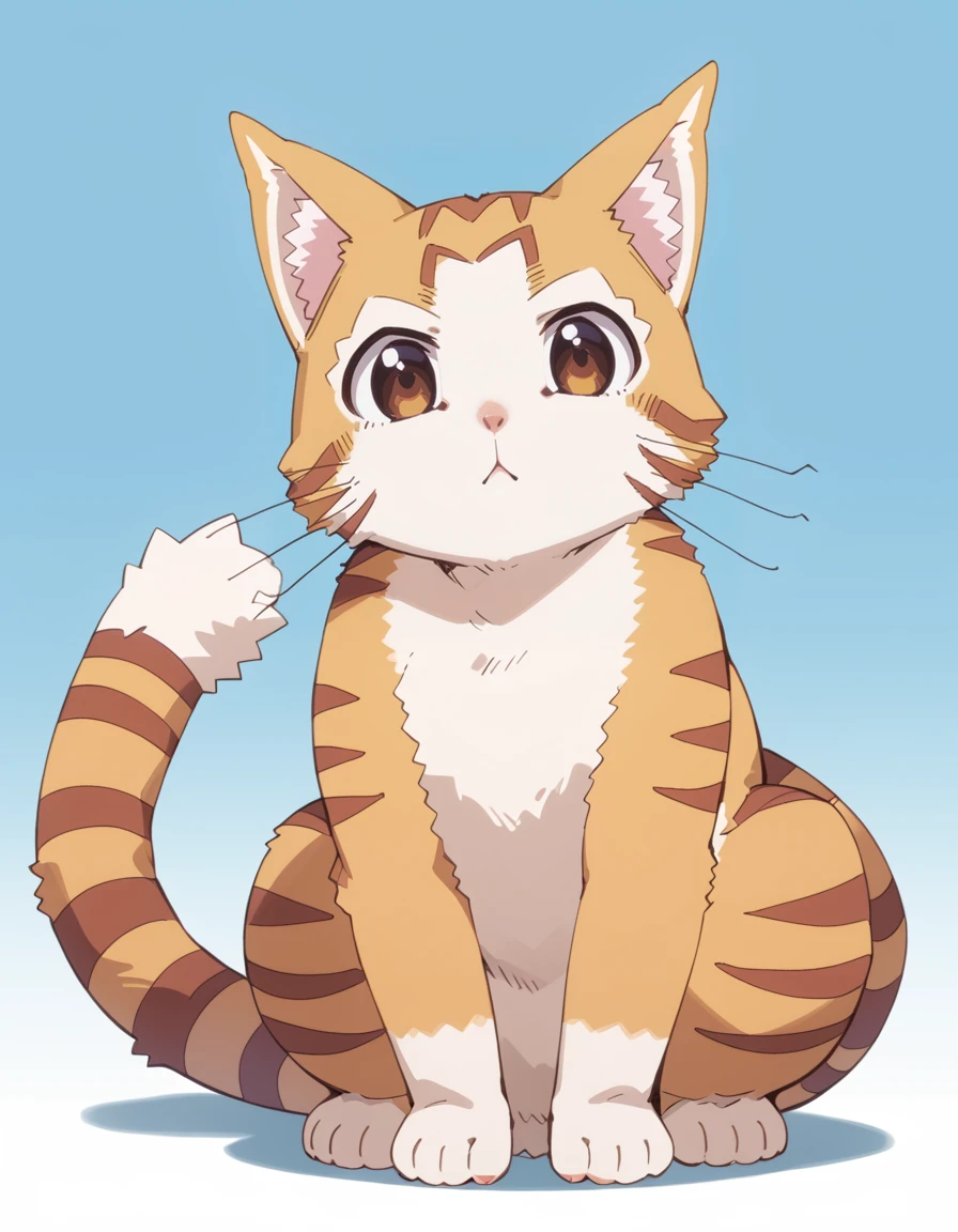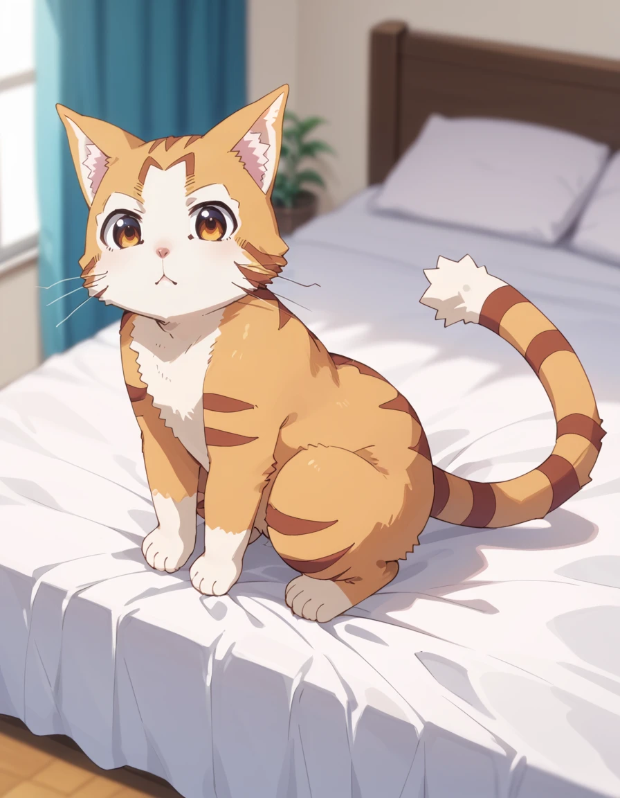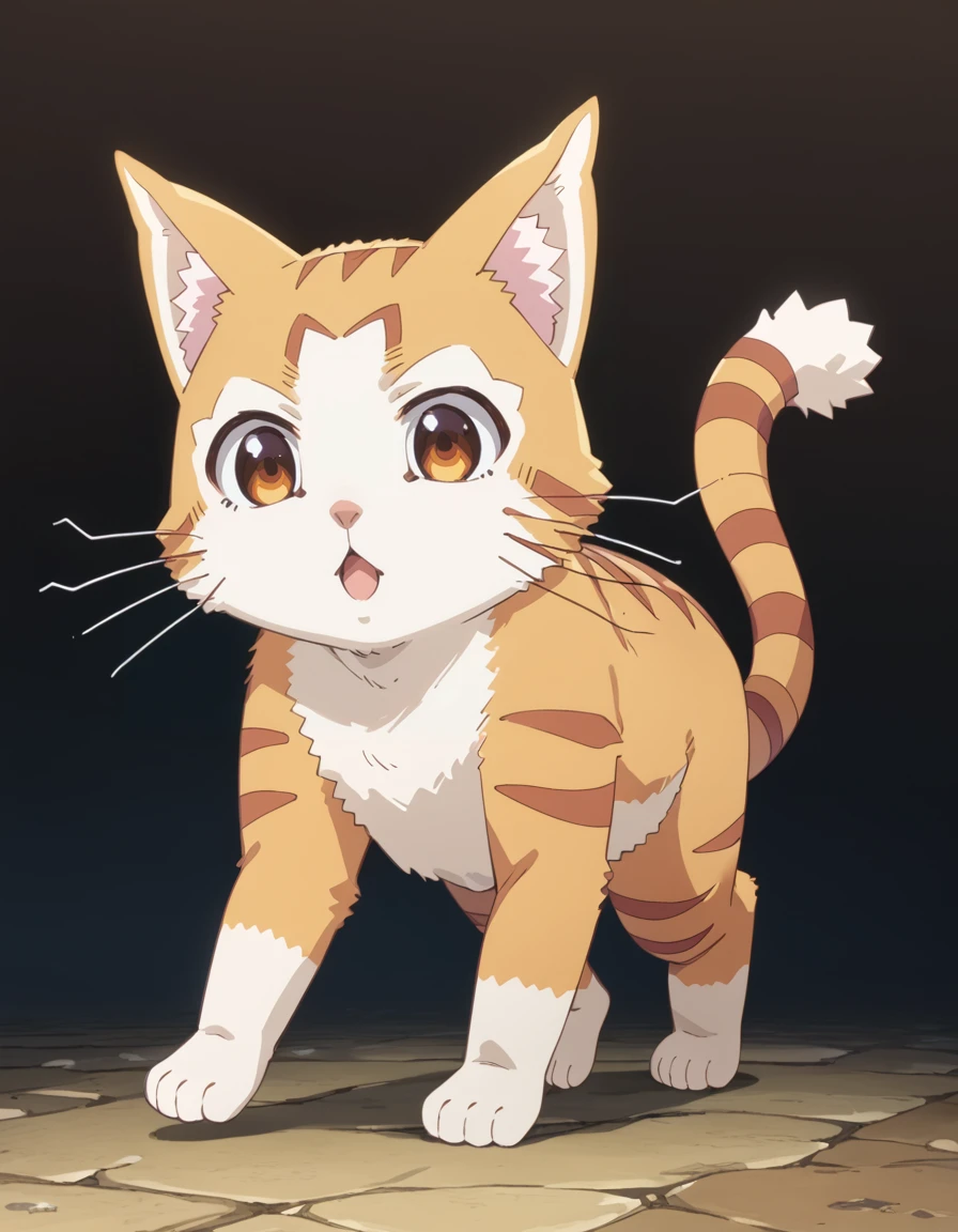 tama (beheneko), cat, orange fur, white fur, brown eyes, brown stripes, pointy ears, cat ears, whiskers, white muzzle, fluffy tail, striped tailDescription