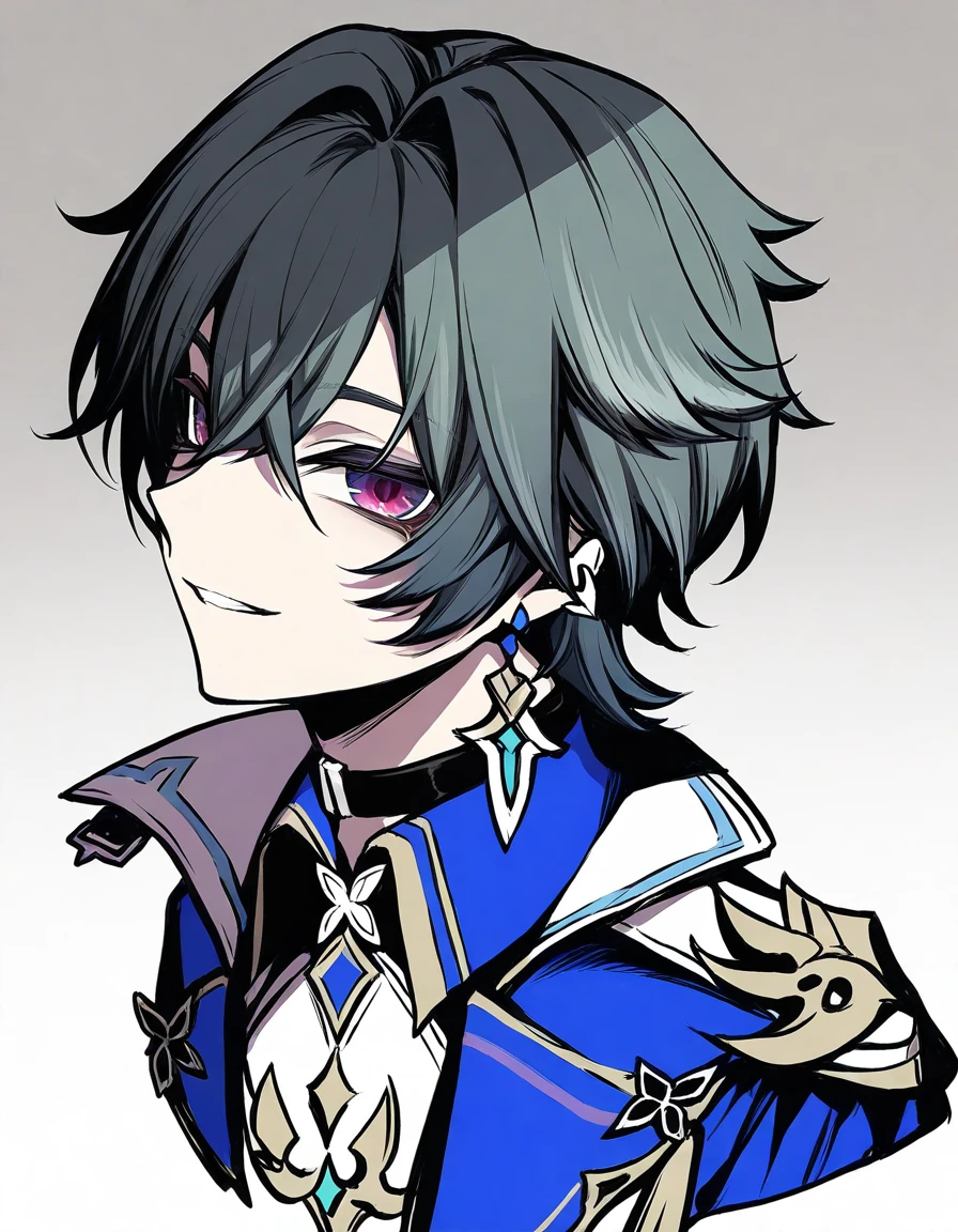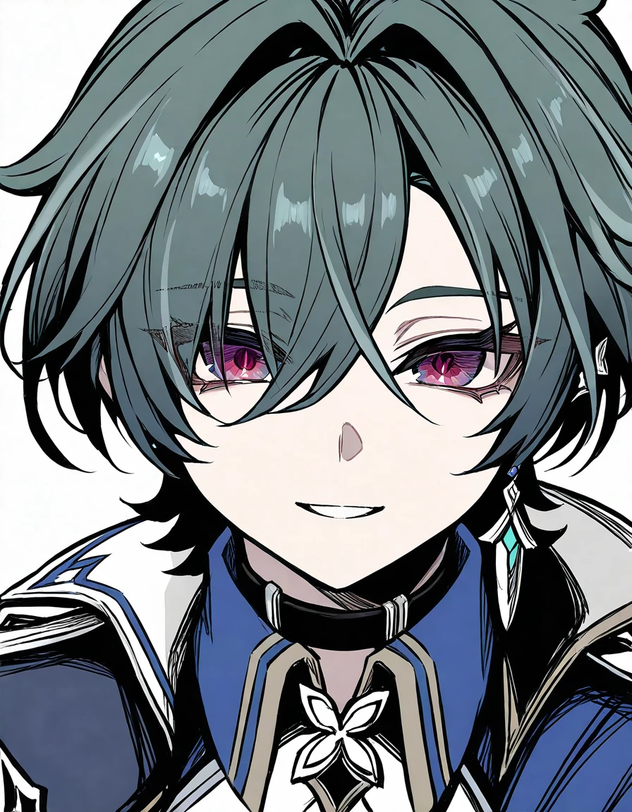 外观:dark green hair,short hair,hair intakes,bangs,hair between eyes,eyelashes,purple eyes,red eyes,single earring,ear piercing,parted lips,
