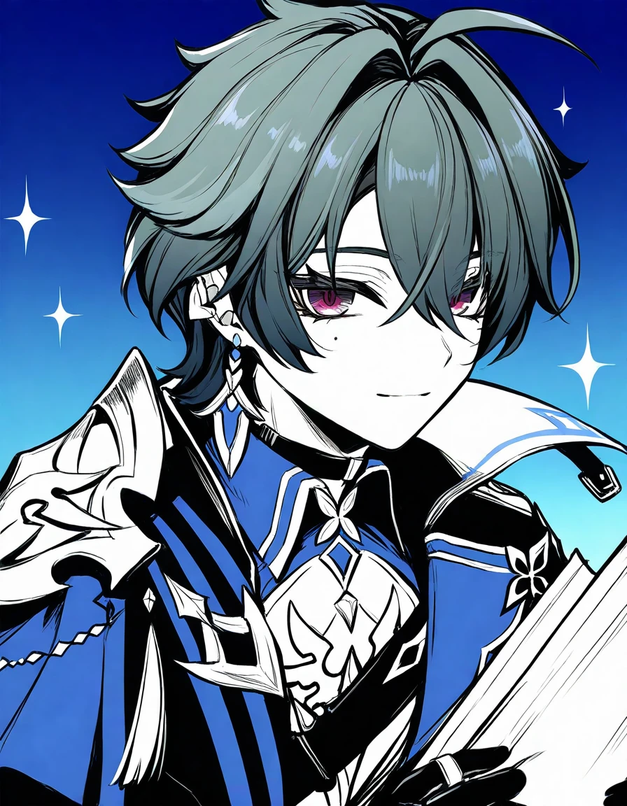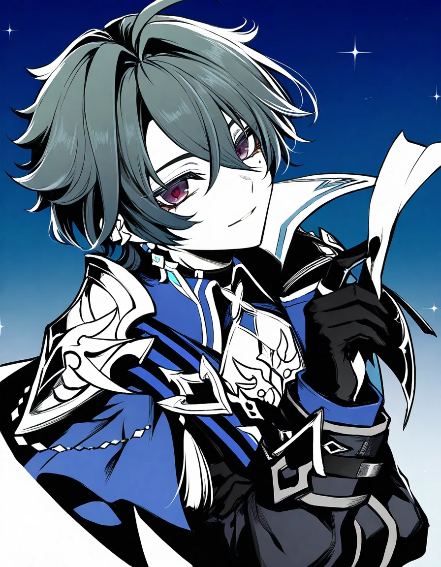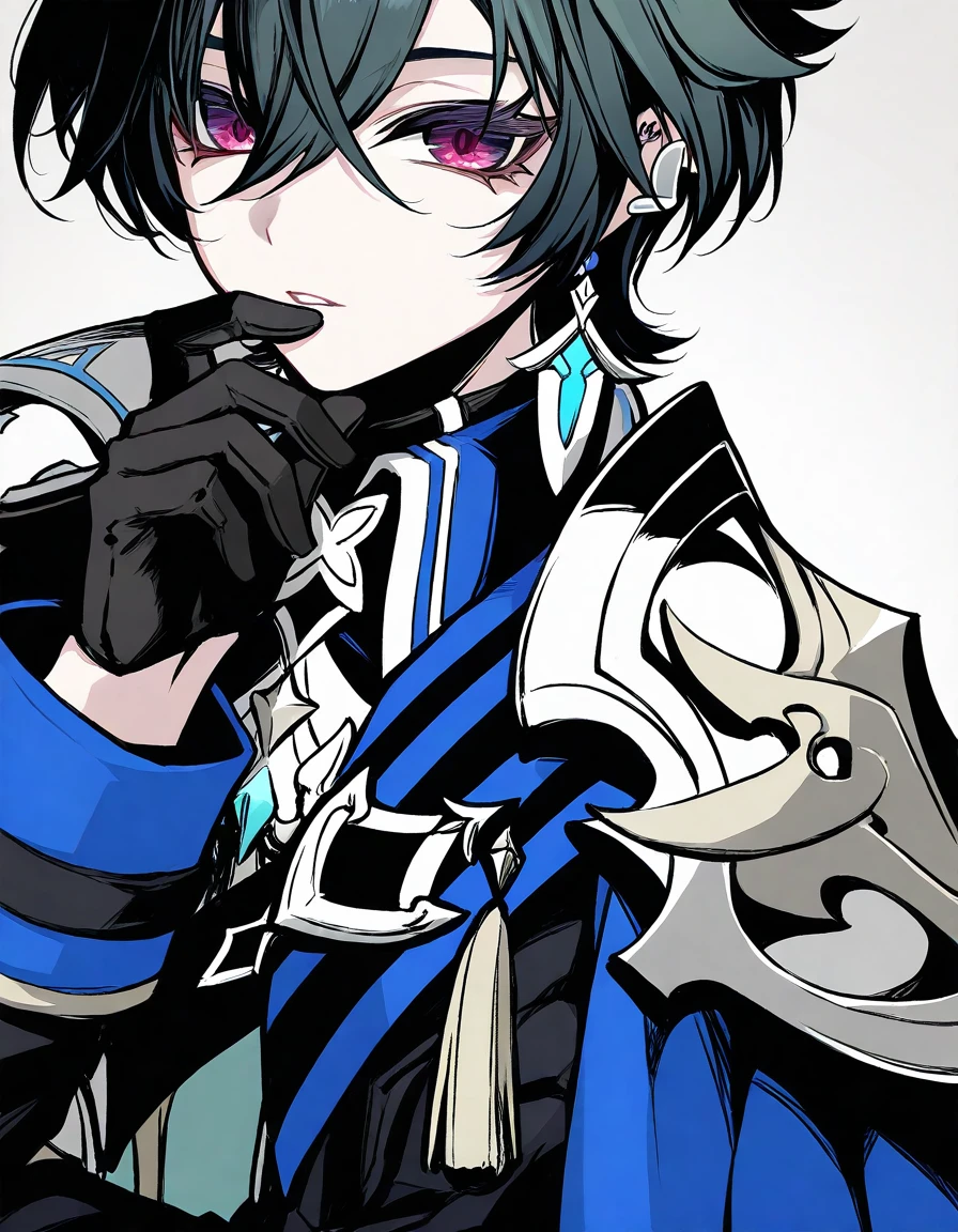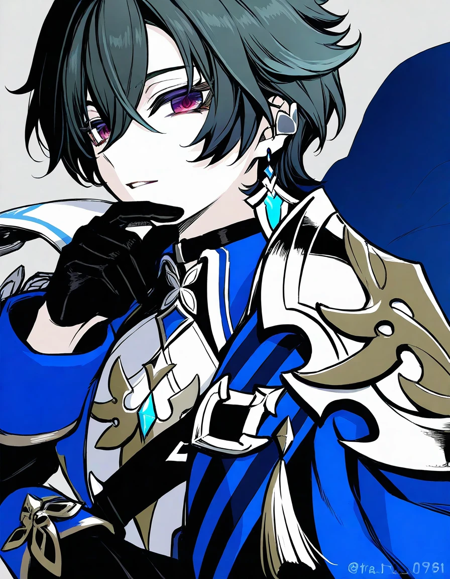 服饰:jewelry,ascot,blue cape,shoulder armor,pauldrons,long sleeves,blue gemstone,black gloves,(gold trim,(blue jacket,shirt),sidelocks),tassel,vision \(genshin impact\),white pants,thighhighs,thigh boots,black footwear,