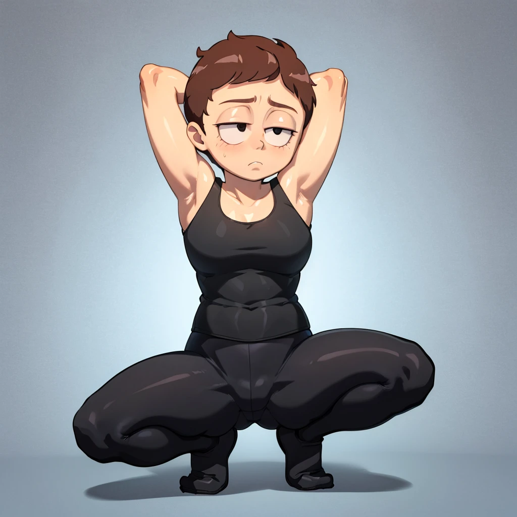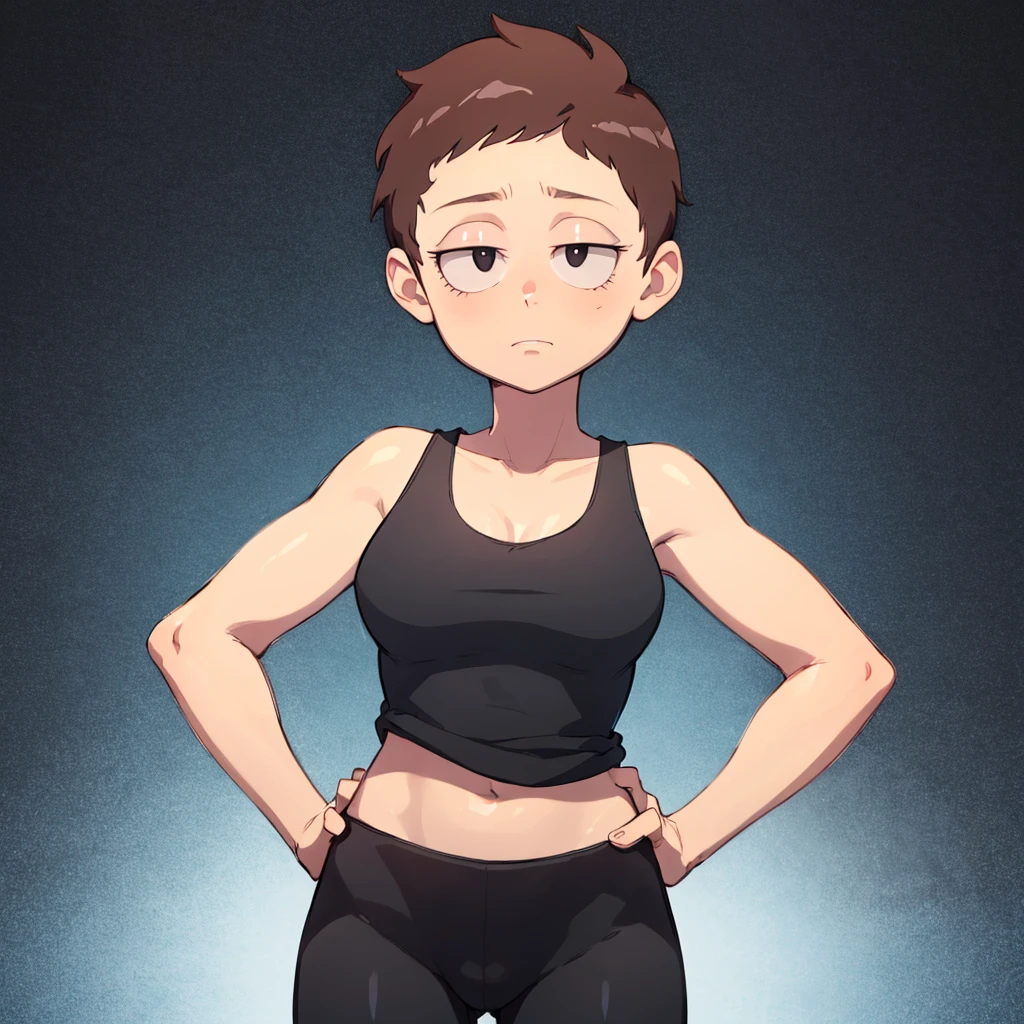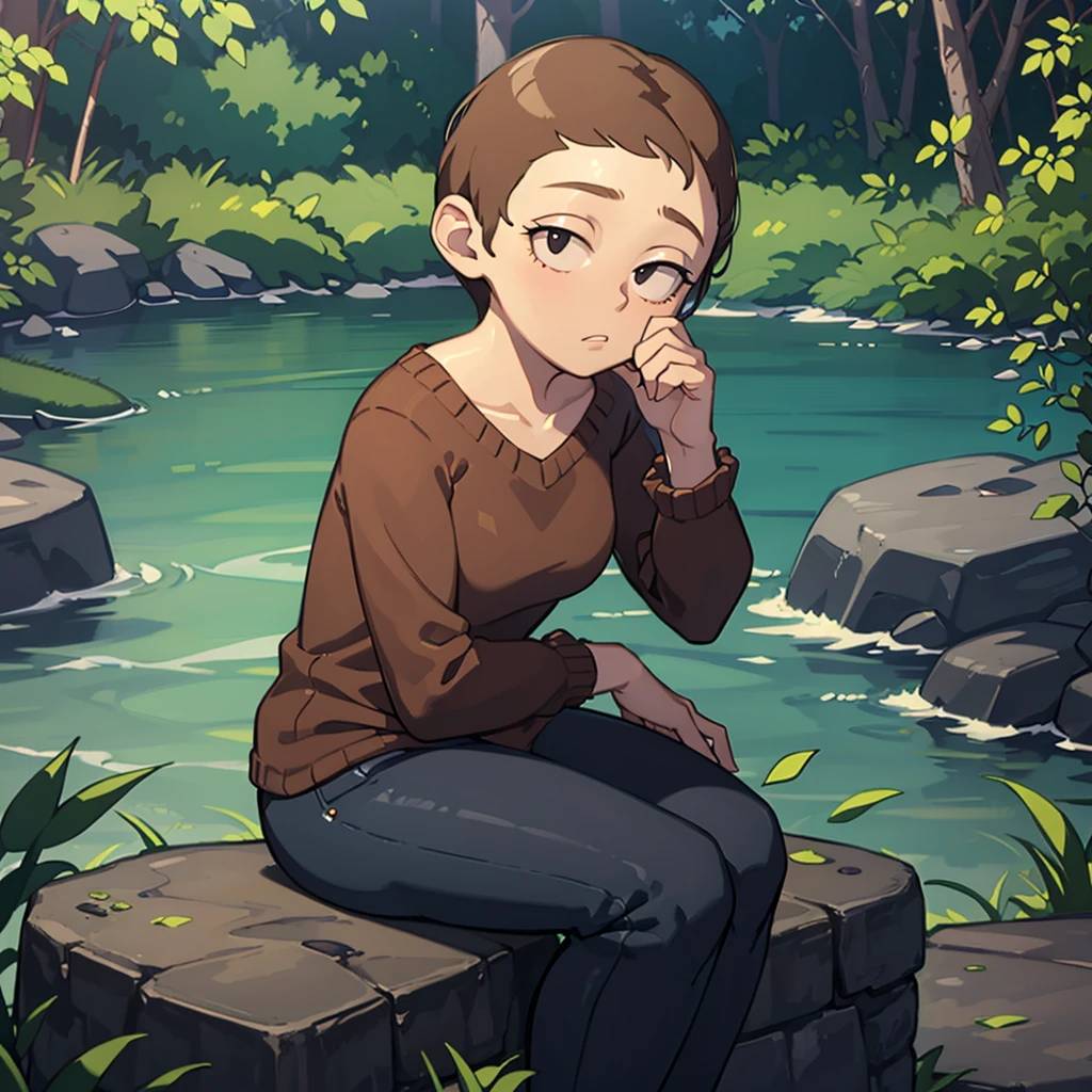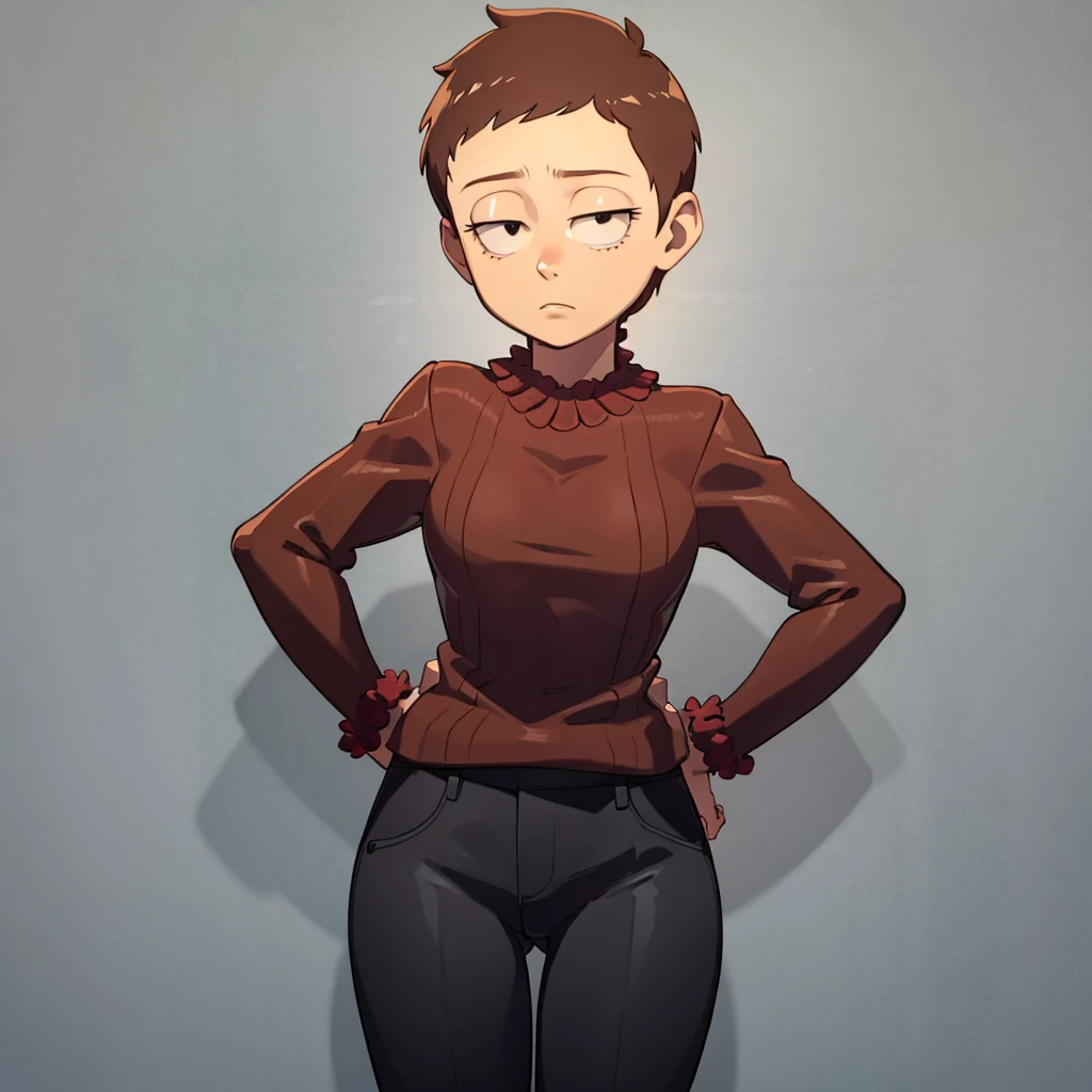 1girl, solo, Sharon Marsh, short hair, very short hair, brown hair, pants, black eyes, shirt, long sleeves