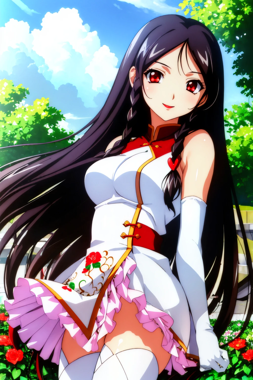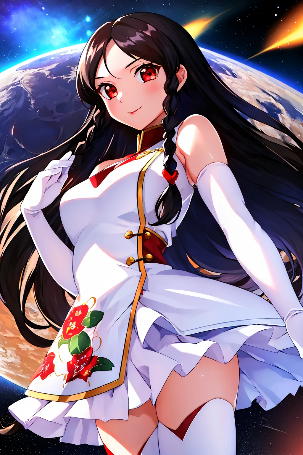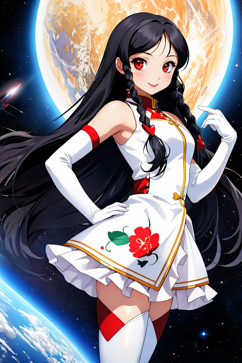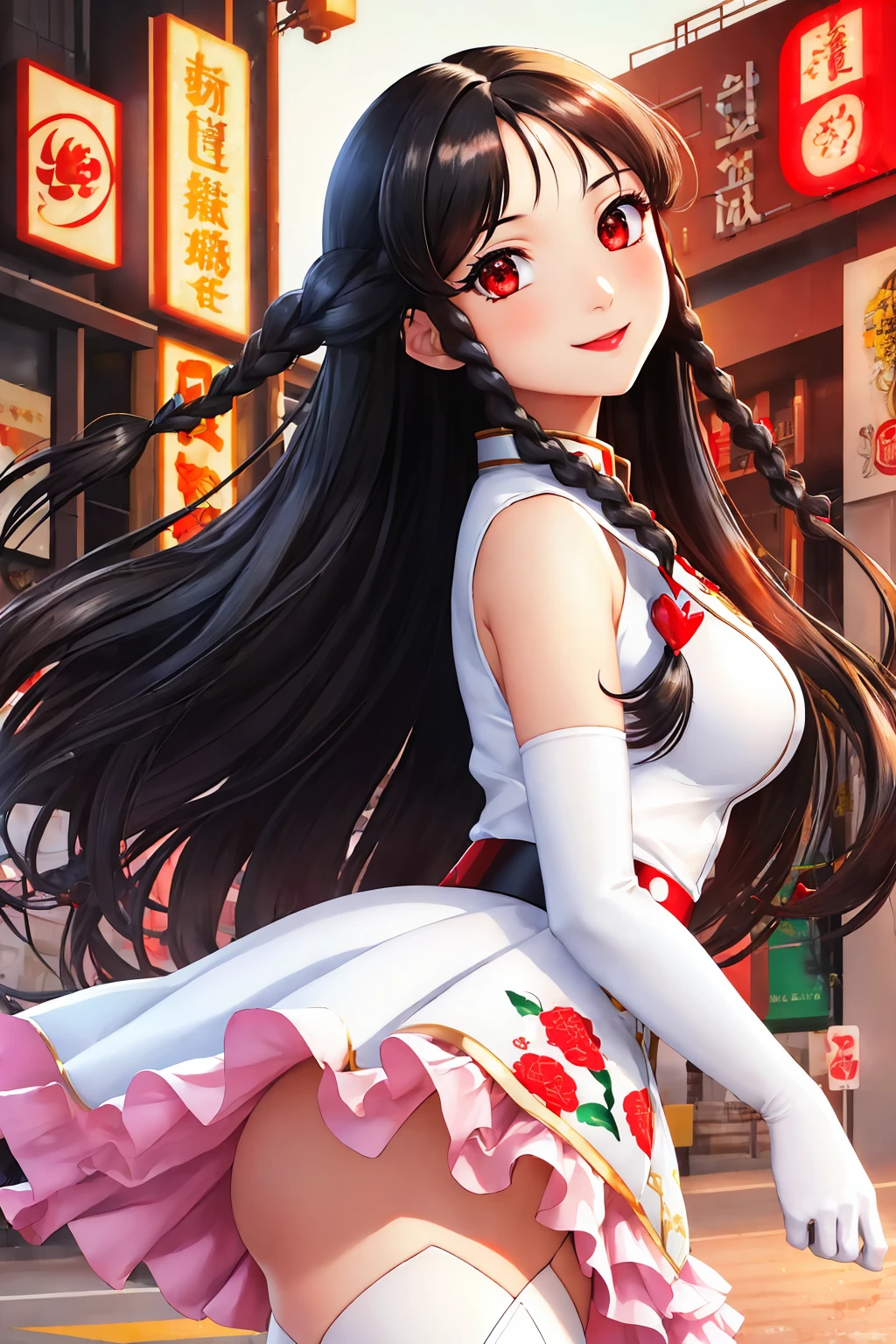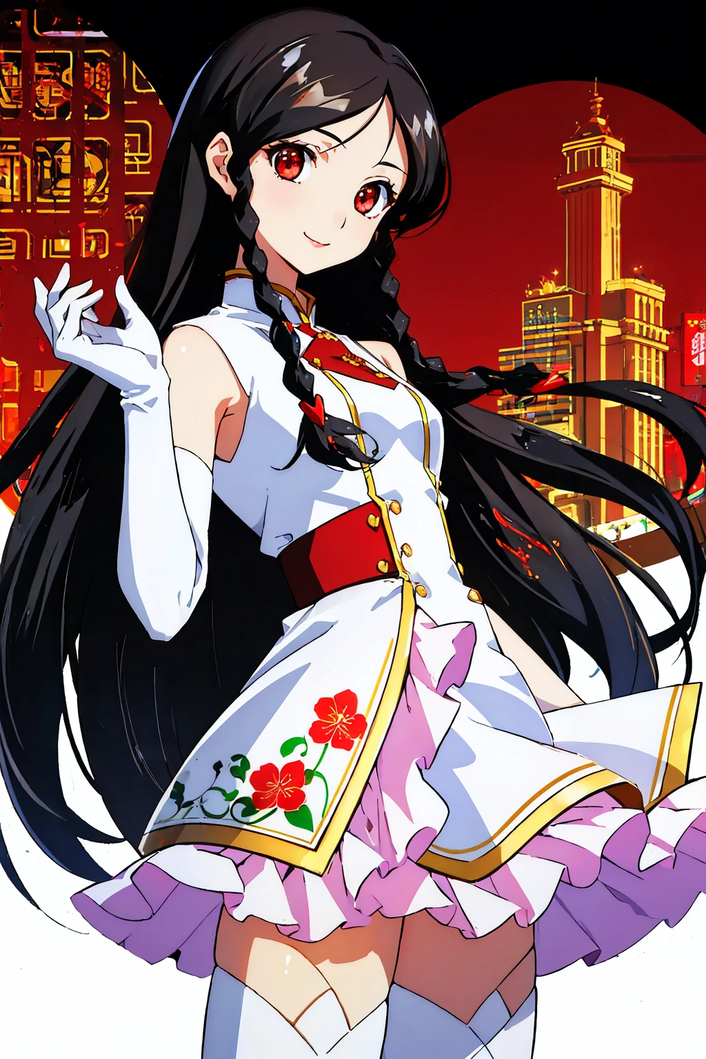 black hair, twin braids, parted bangs, white dress, frilled skirt, white gloves, white thighhighs, long hair, red eyes