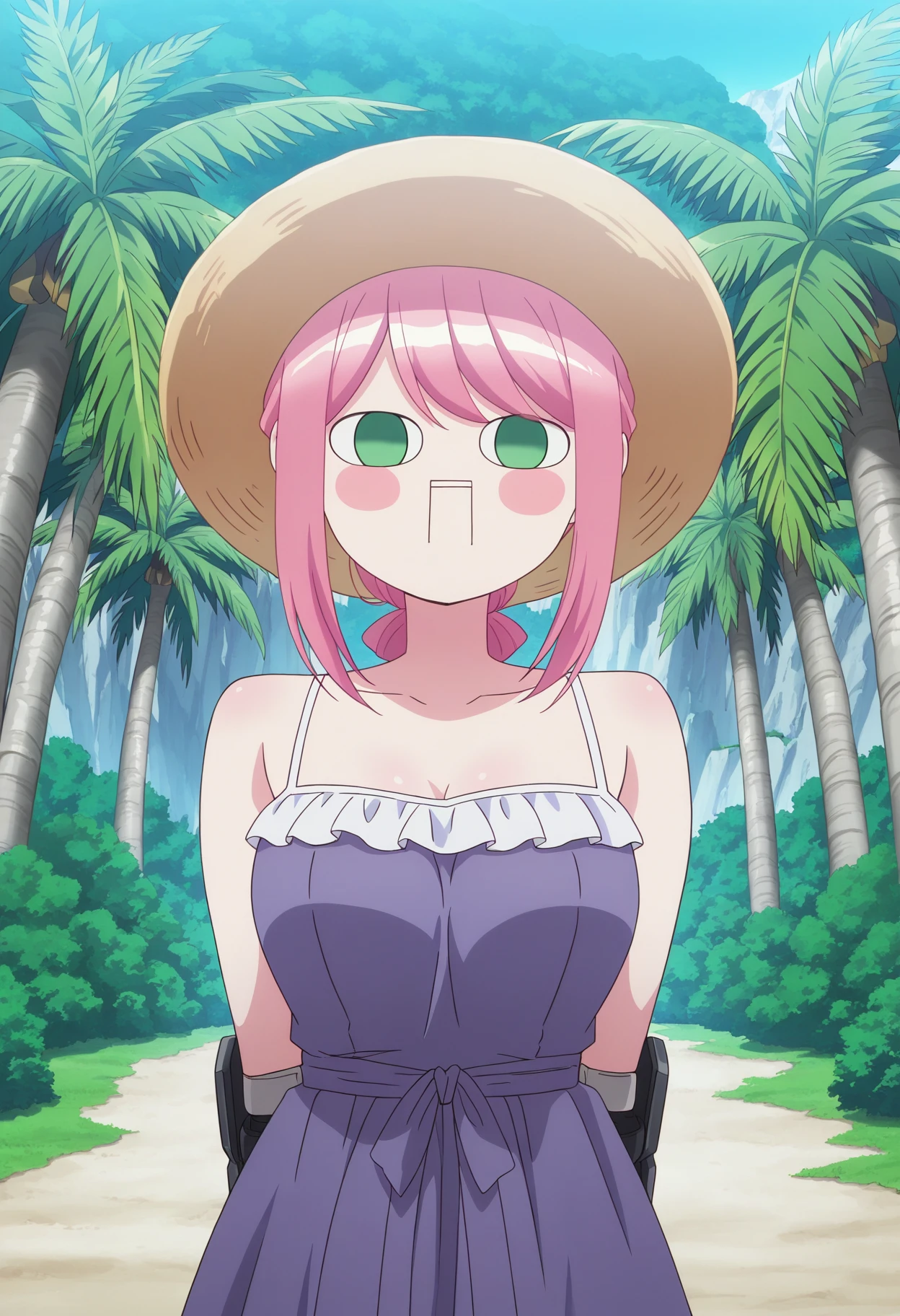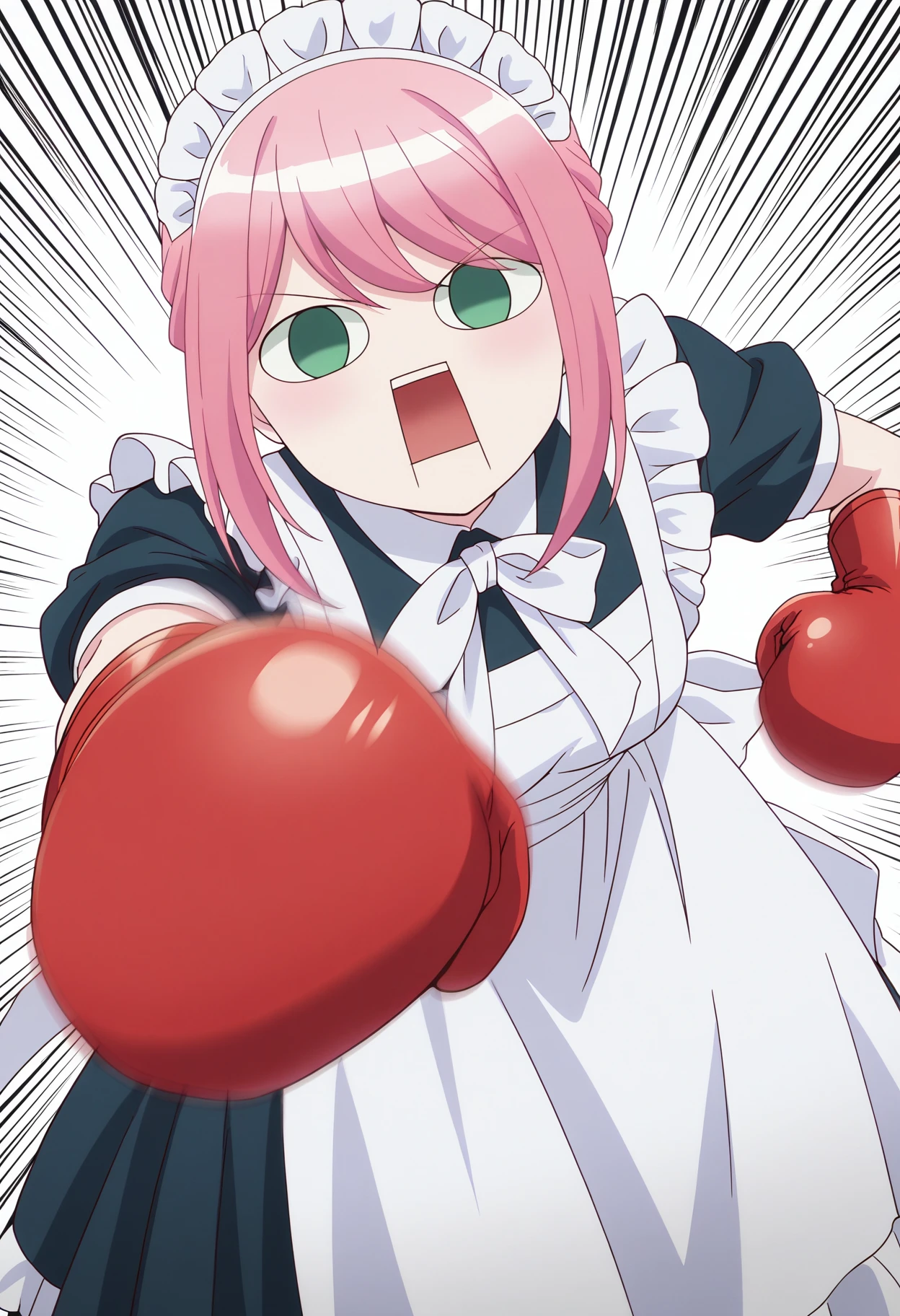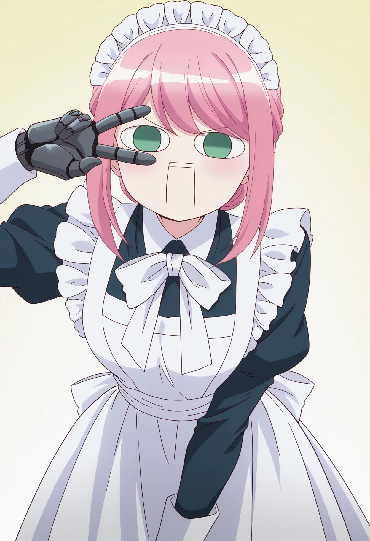 marie2wz, pink hair, sidelocks, green eyes, no pupils, rectangular mouth, breasts, mechanical hands, maid, maid headdress, long dress, white apron, maid apron, white bow, parody