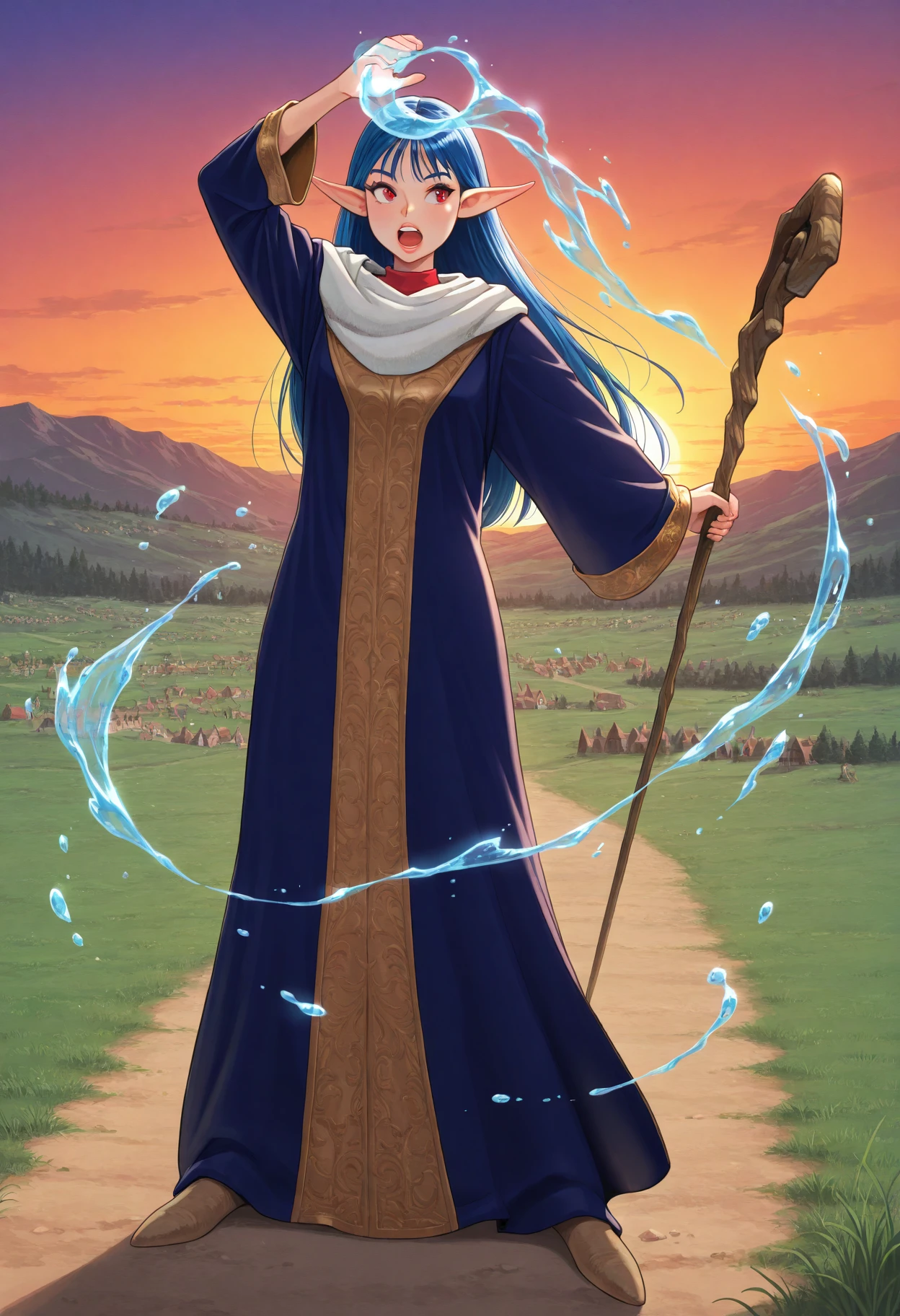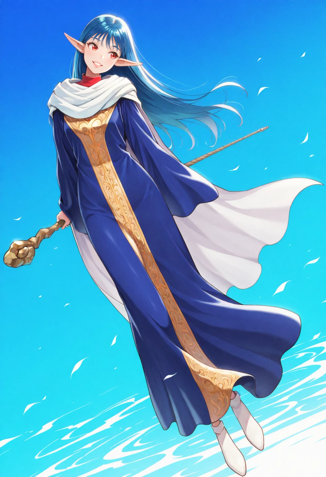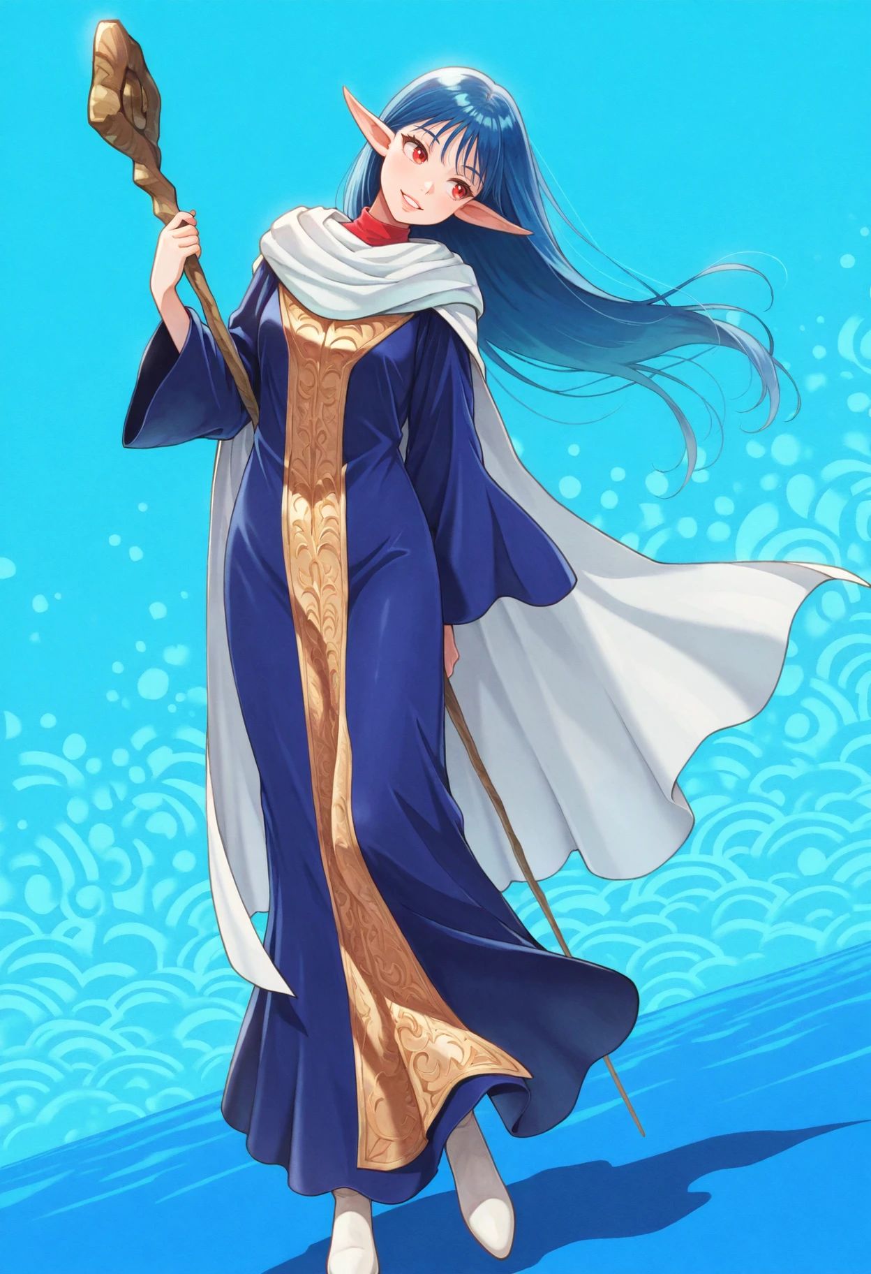 blue hair, long hair, pointy ears, red eyes, mage robe, long sleeves, wide sleeves, white shoes, holding staff,