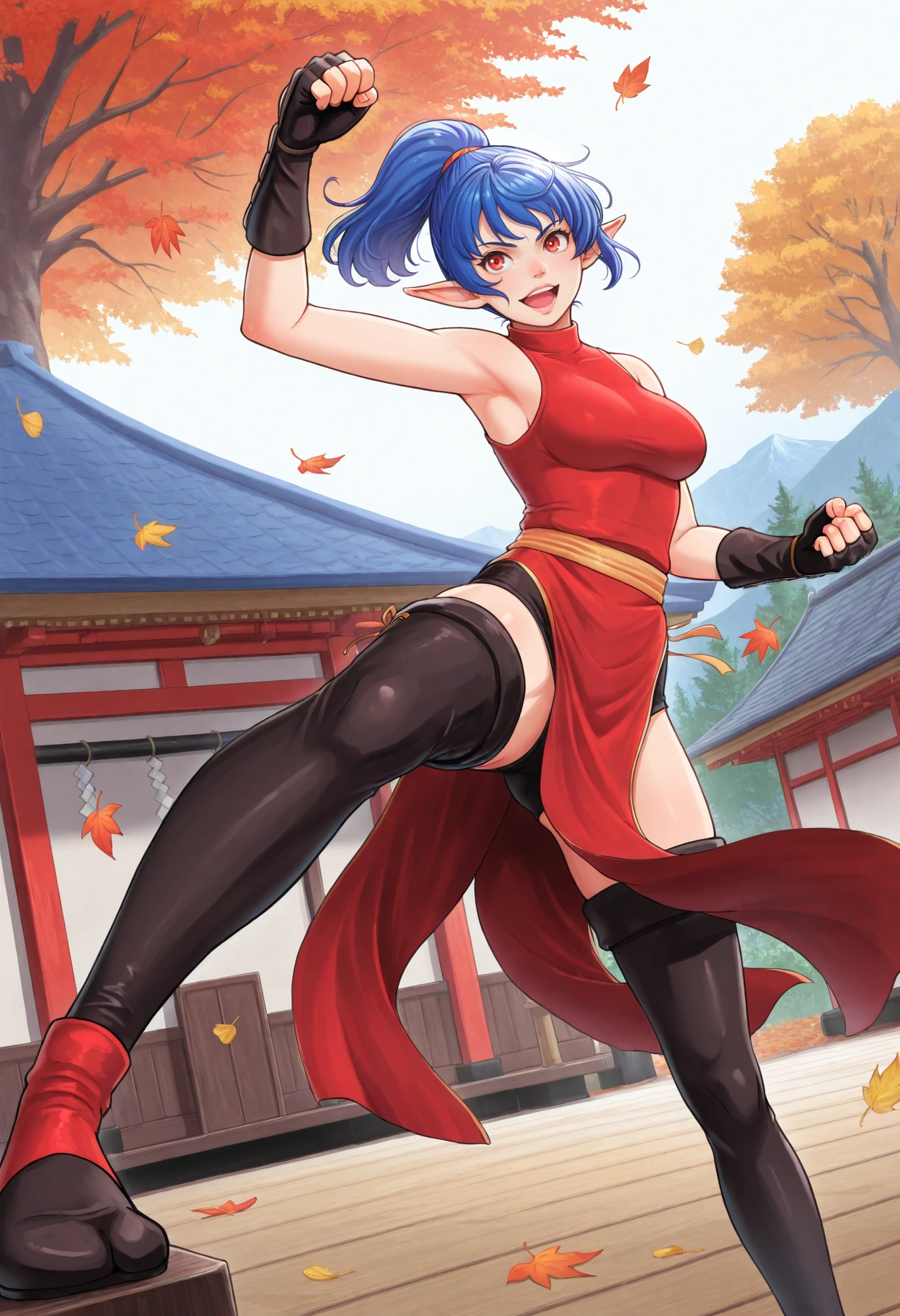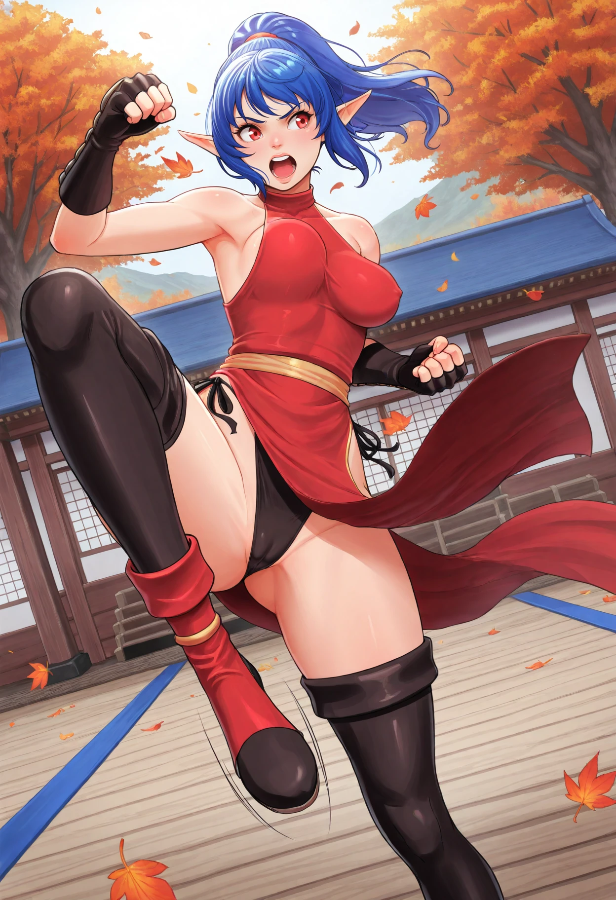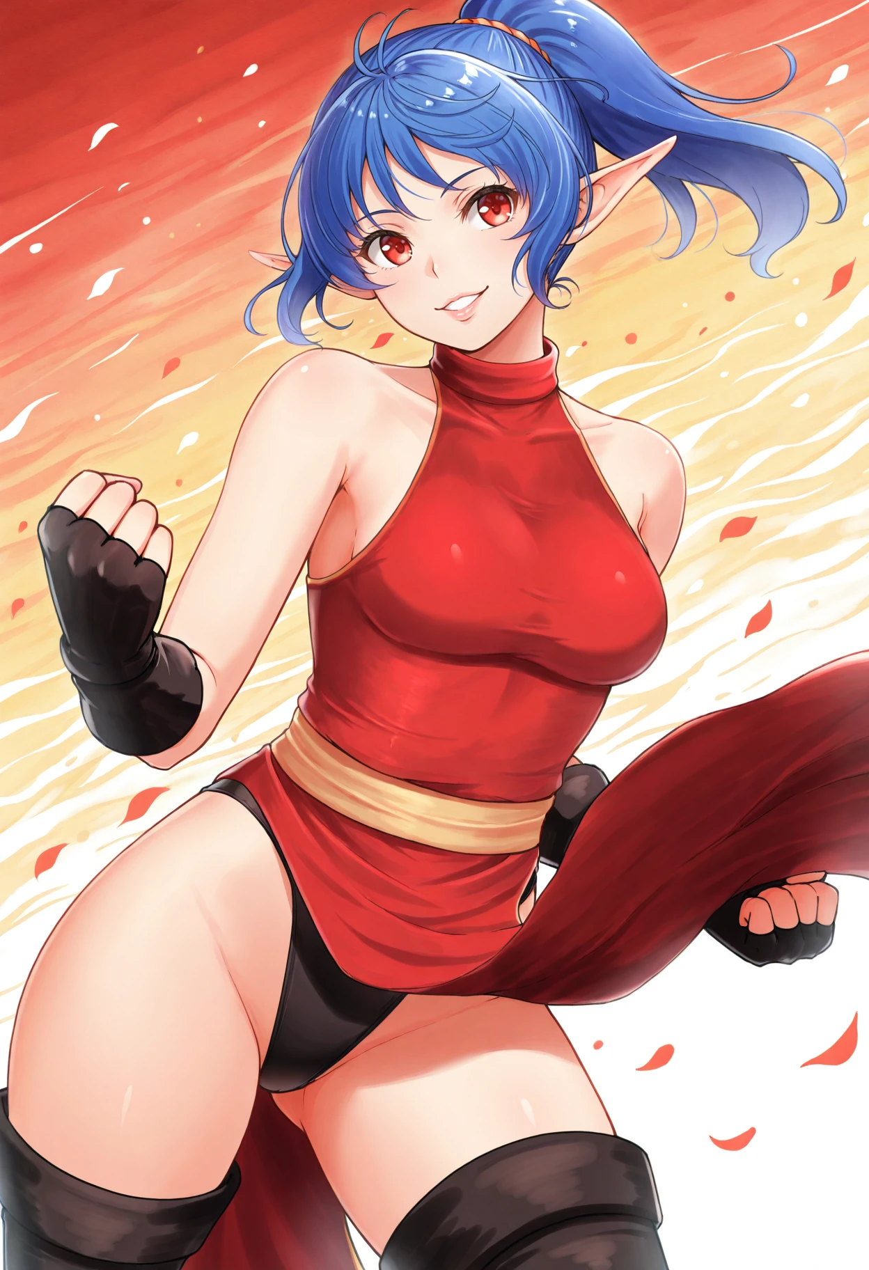 blue hair, ponytail, pointy ears, red eyes, mastermonk dress, sleeveless, halterneck, waist sash, mastermonk thighhighs, fingerless gloves,