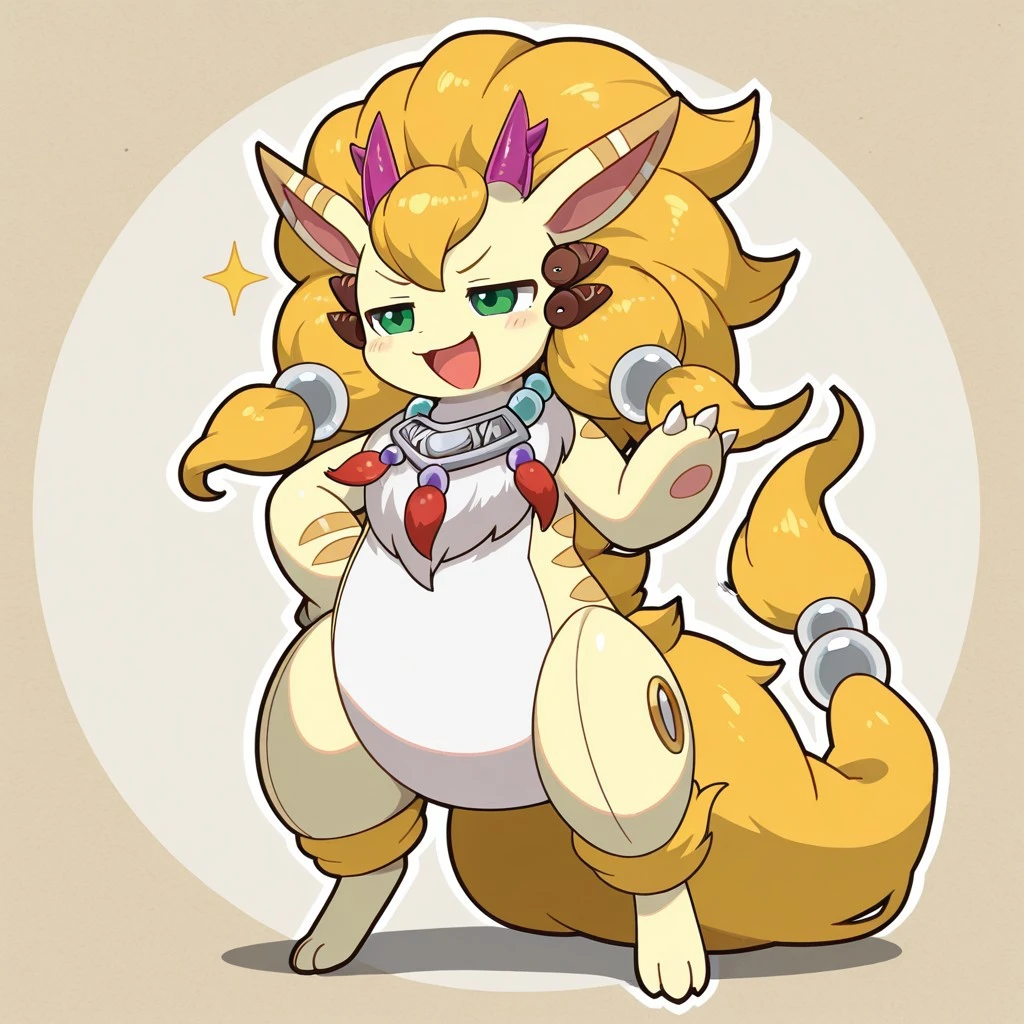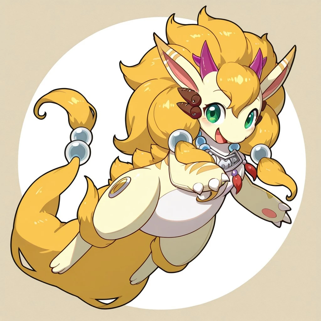 angelion, light yellow skin, white countershading, long yellow hair, yellow forehead fur, yellow fur on back, pink inner ears, two magenta horns, green eyes, brown facial ornaments, tan patterns, white neck tuft, yellow rene cut, necklace, three white claws on hands, three toes, brown buttons on shoulders and thighs, yellow knee fur, yellow tail, pink paw pads, gray beads on hair and tail