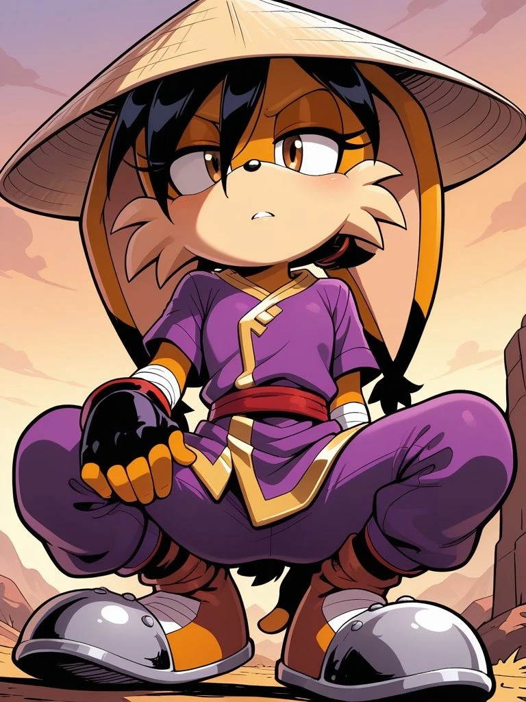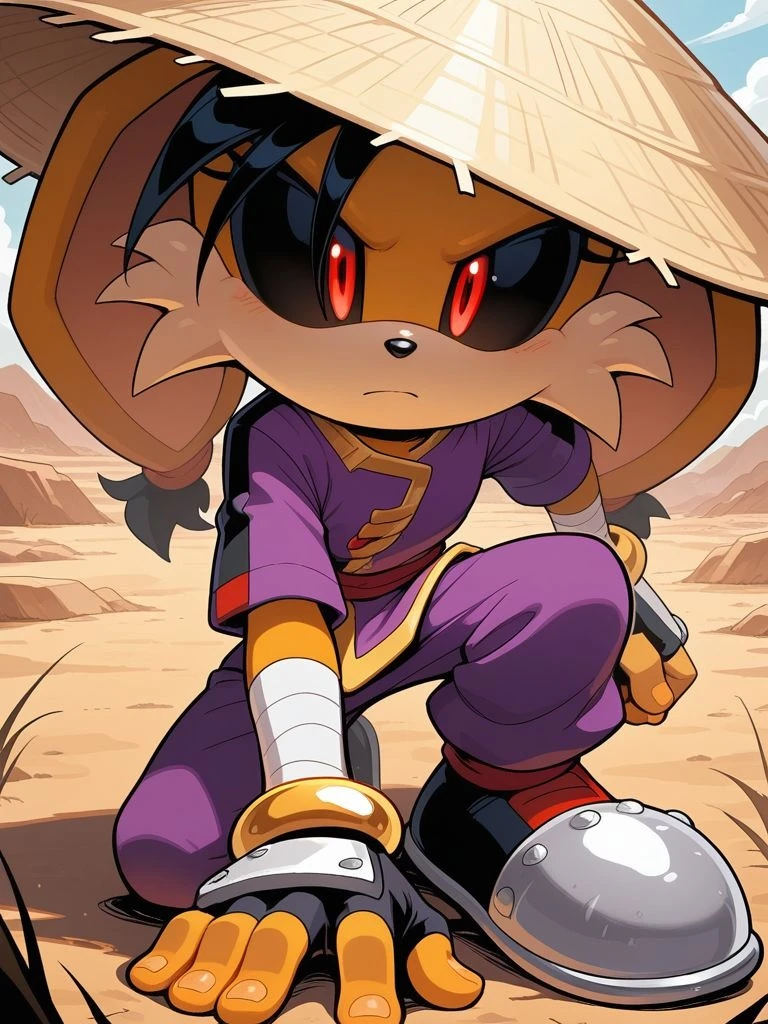 Conquering Storm, Brown Eyes, Brown Fur, Lynx Ears, Straw Hat, Black Hair, Purple Gi With A Gold Trim, Light Purple Pants, Tan Shoes, Black Padded Fingerless Gloves, White Arm Wrap, Black Sclera, Red Eyes,