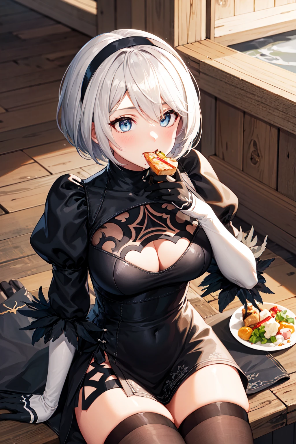 outfit C (without blindfold, dress)hm2b, blue eyes, mole under mouth, clothing cutout, long sleeves, puffy sleeves, juliet sleeves, feather trim, black thighhighs, black gloves, black dress, black skirt