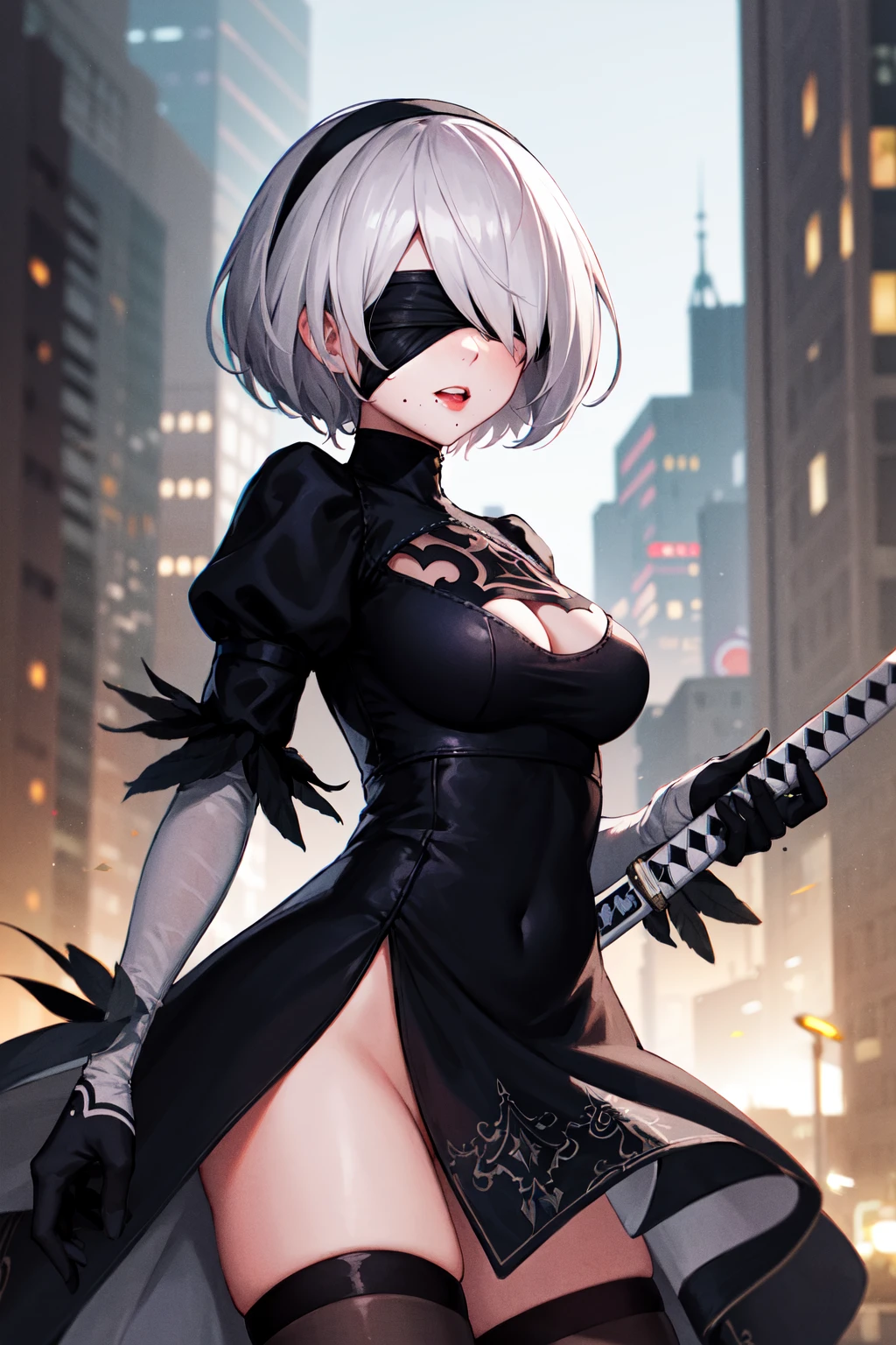 outfit B (blindfold, leotard)hm2b, black blindfold, covered eyes, mole under mouth, clothing cutout, long sleeves, puffy sleeves, juliet sleeves, feather trim, black thighhighs, black gloves, covered navel, (white leotard:1.2)