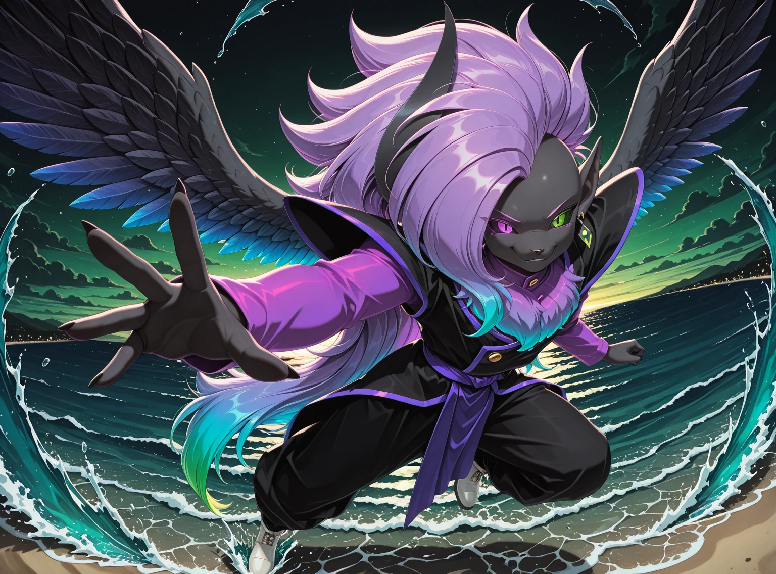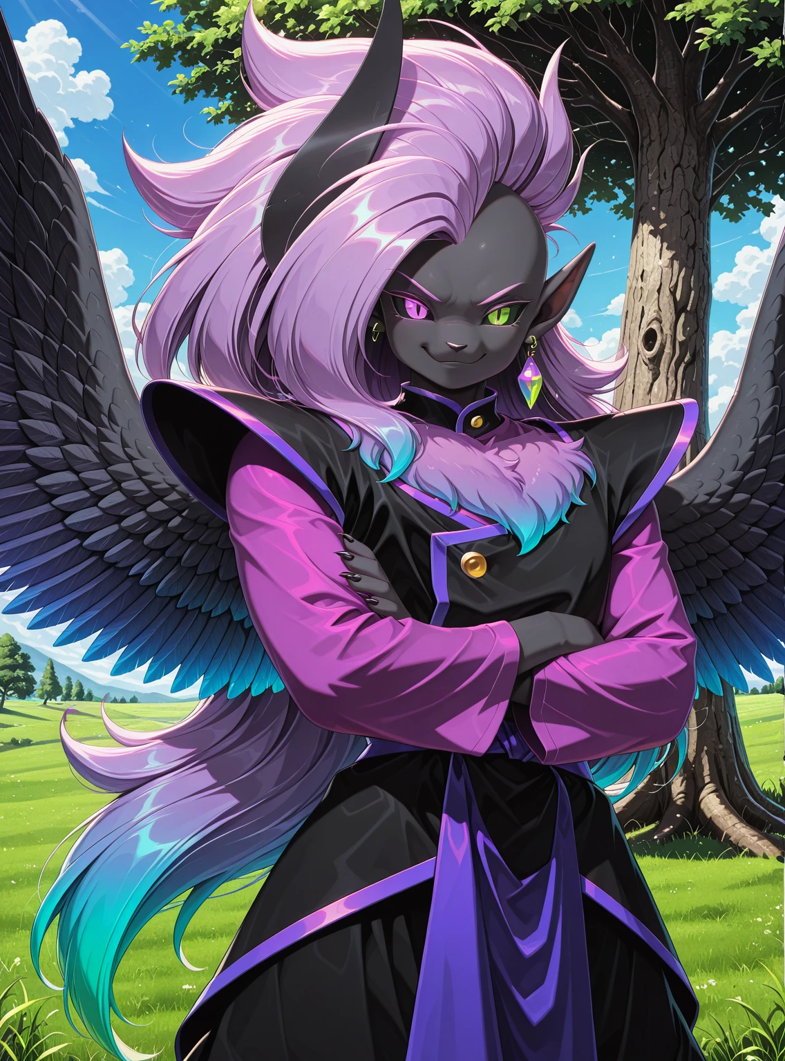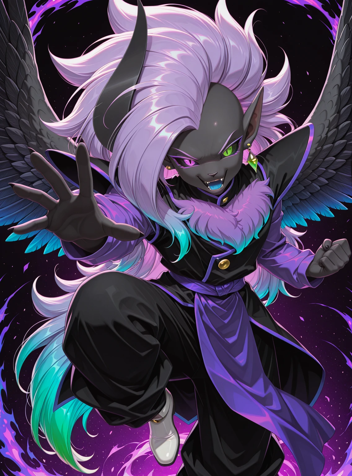 Tags: solo, Abbysu, furry, purple eye, green eye, heterochromia, slit pupils, black sclera, black skin, purple chest fur, gradient chest fur, black horn, one horn, purple hair, blue hair, gradient hair, multicolored hair, long hair, huge hair, spiky hair, pointy ear, one ear, black feathered wings, gradient wings, green earrings, round earrings, one earring, purple shirt, long sleeves, shirt under tunic, black tunic, shoulder pads, purple trim, gold button, purple sash, baggy pants, black pants, white footwear, black claws,