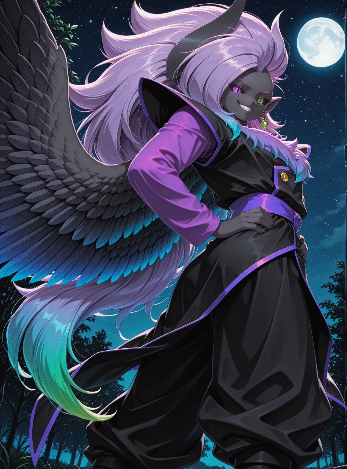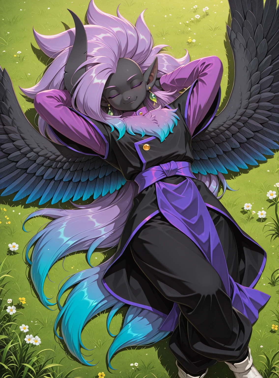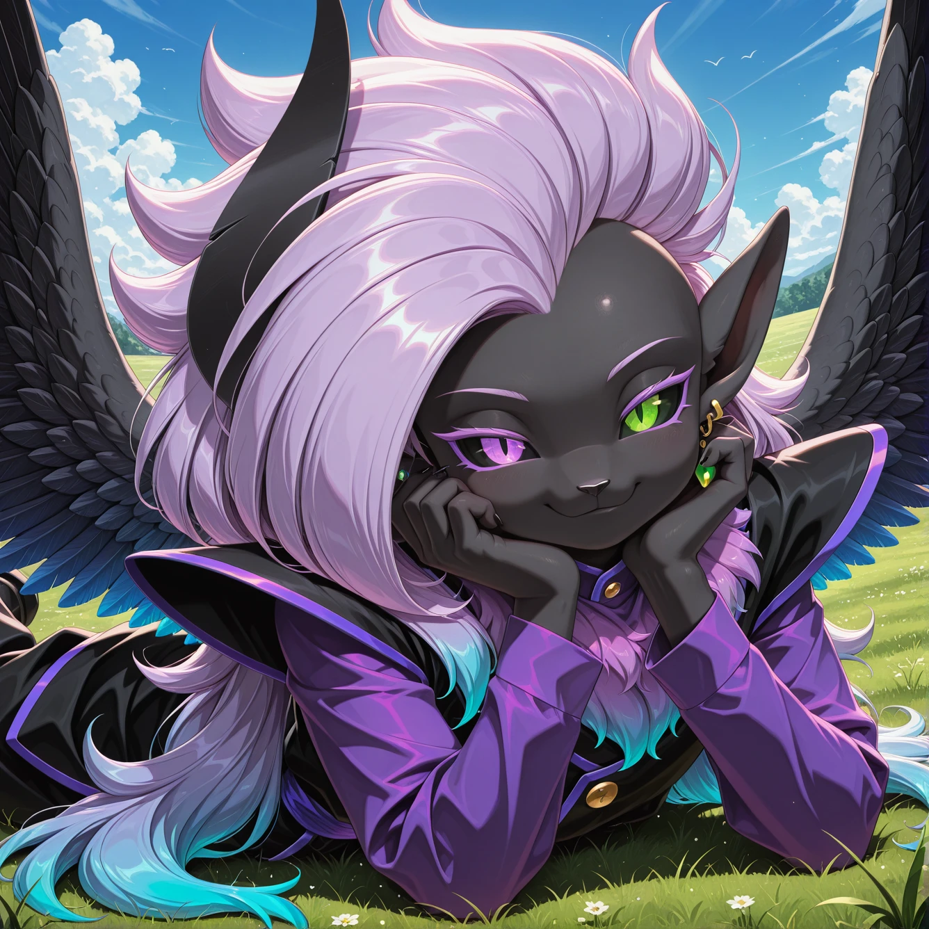 Tags: solo, Abbysu, furry, purple eye, green eye, heterochromia, slit pupils, black sclera, black skin, purple chest fur, gradient chest fur, black horn, one horn, purple hair, blue hair, gradient hair, multicolored hair, long hair, huge hair, spiky hair, pointy ear, one ear, black feathered wings, gradient wings, green earrings, round earrings, one earring, purple shirt, long sleeves, shirt under tunic, black tunic, shoulder pads, purple trim, gold button, purple sash, baggy pants, black pants, white footwear, black claws,