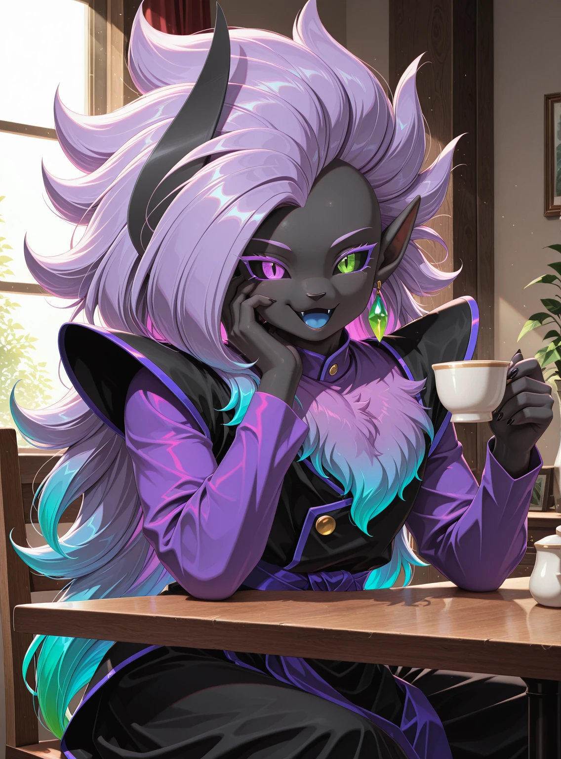 solo, Abbysu, furry, purple eye, green eye, heterochromia, slit pupils, black sclera, black skin, purple chest fur, gradient chest fur, black horn, one horn, purple hair, blue hair, gradient hair, multicolored hair, long hair, huge hair, spiky hair, pointy ear, one ear, black feathered wings, gradient wings, green earrings, round earrings, one earring, purple shirt, long sleeves, shirt under tunic, black tunic, shoulder pads, purple trim, gold button, purple sash, baggy pants, black pants, white footwear, black claws,