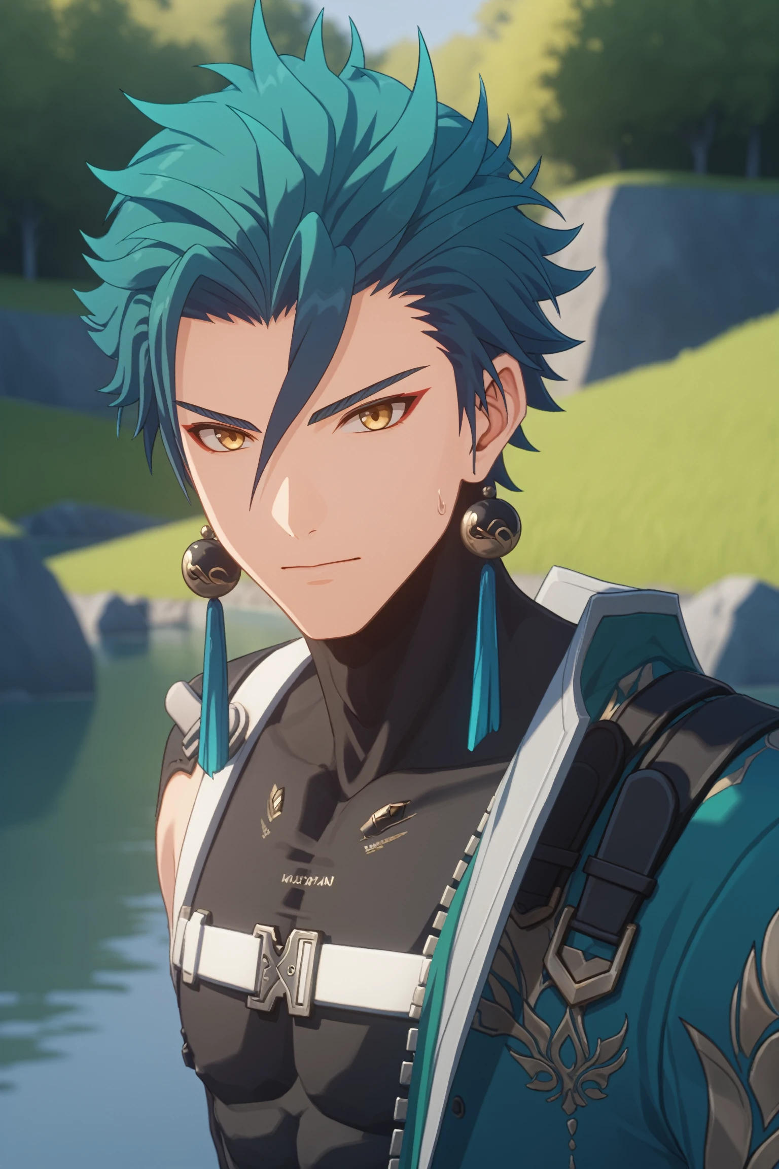 jiyan_wuwa, green hair, long hair, yellow eyes, red eyeliner