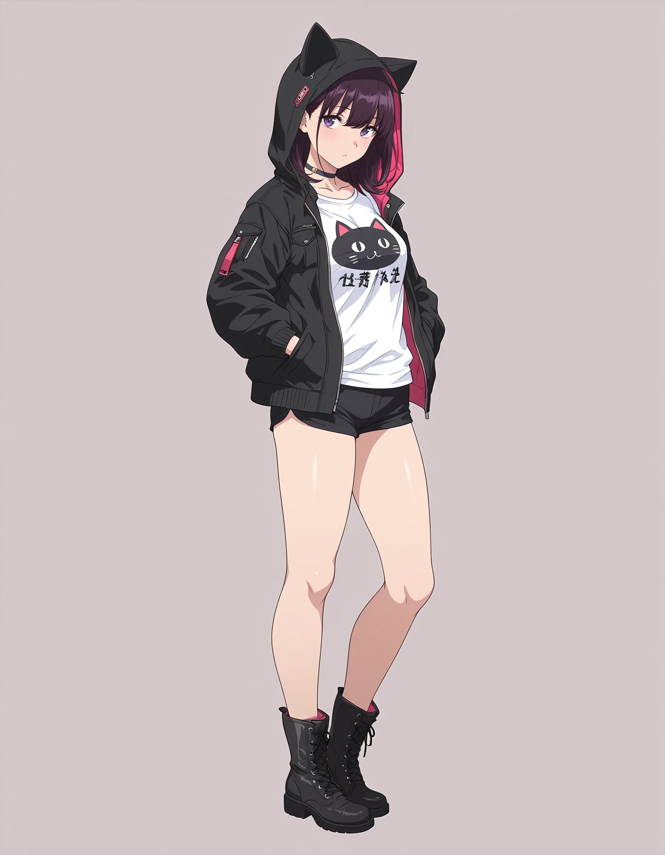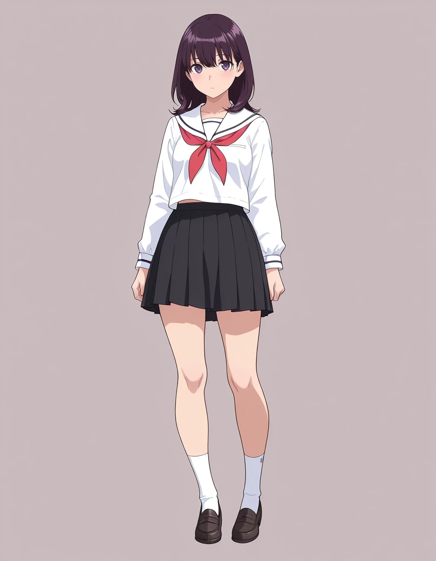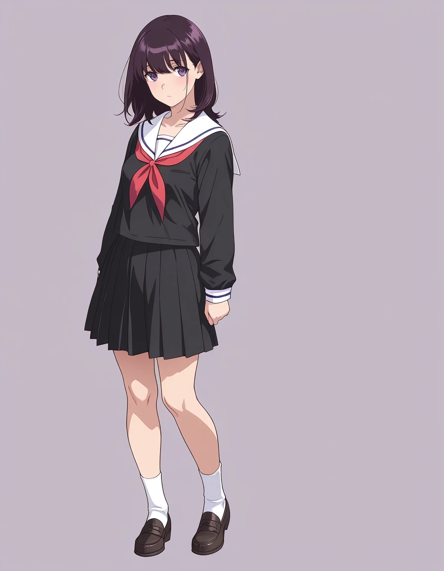 mai_nol,mai_sayokool,medium_hair,black_hair,purple_eyes,school_uniform,white_serafuku,red_neckerchief,white_shirt,short_skirt,black_skirt,white_socks,loafers