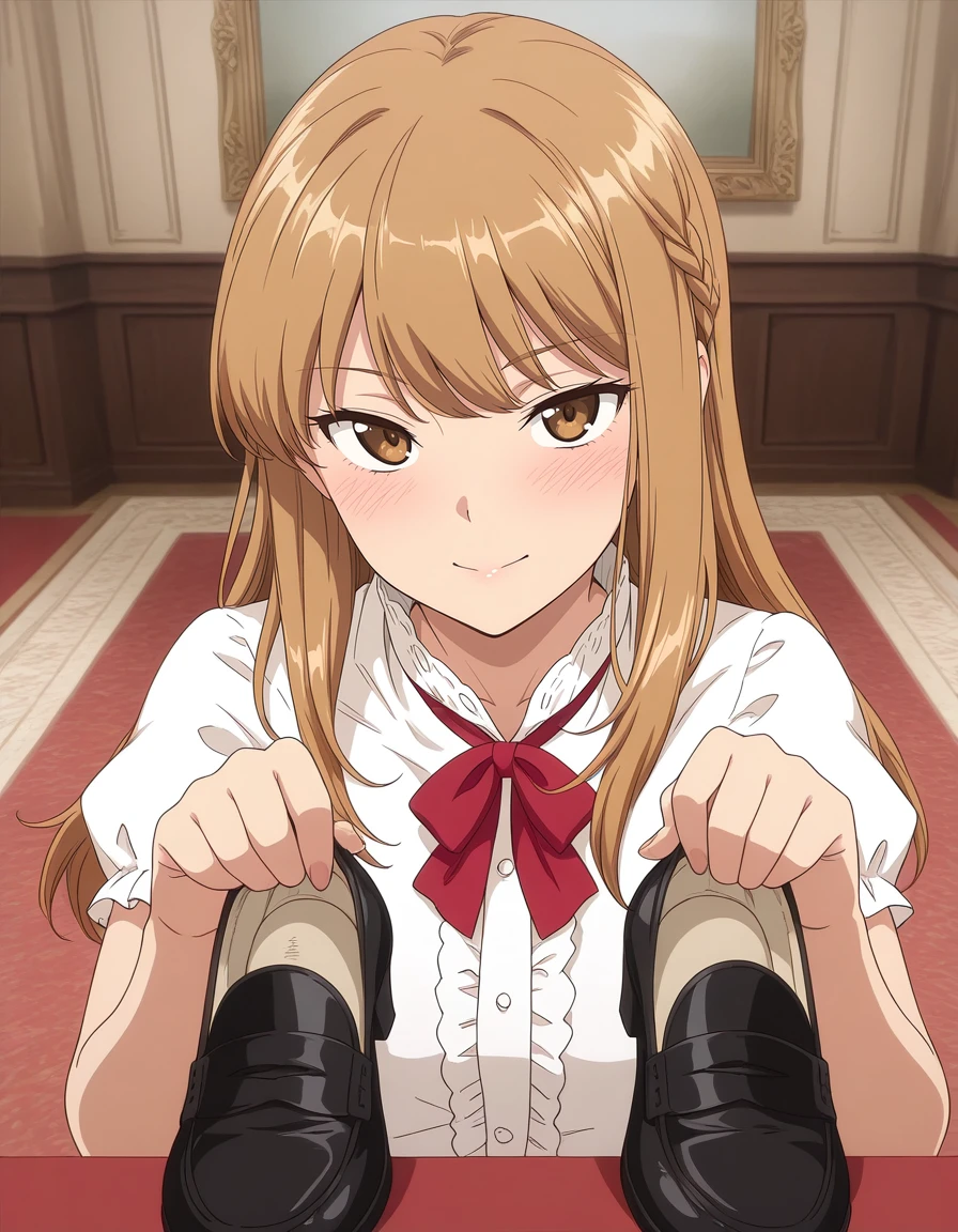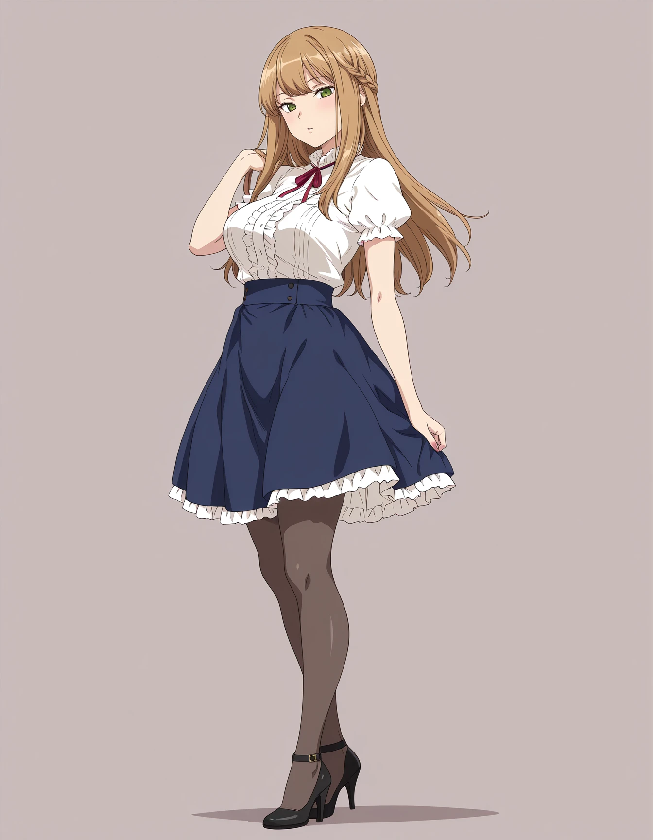 mai_nol,mai_yumekool,long_hair,french_braid,blonde_hair,green_eyes,large_,white_shirt,puffy_sleeves,short_sleeves,frills,red_ neck_ribbon,blue_skirt,pantyhose,high_heels