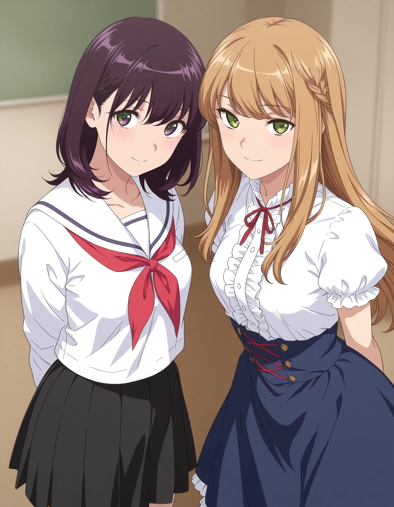 mai_nol,mai_sayokool,medium_hair,black_hair,purple_eyes,school_uniform,white_serafuku,red_neckerchief,white_shirt,short_skirt,black_skirt,white_socks,loafersYumeko ORIGASA 折笠 夢子