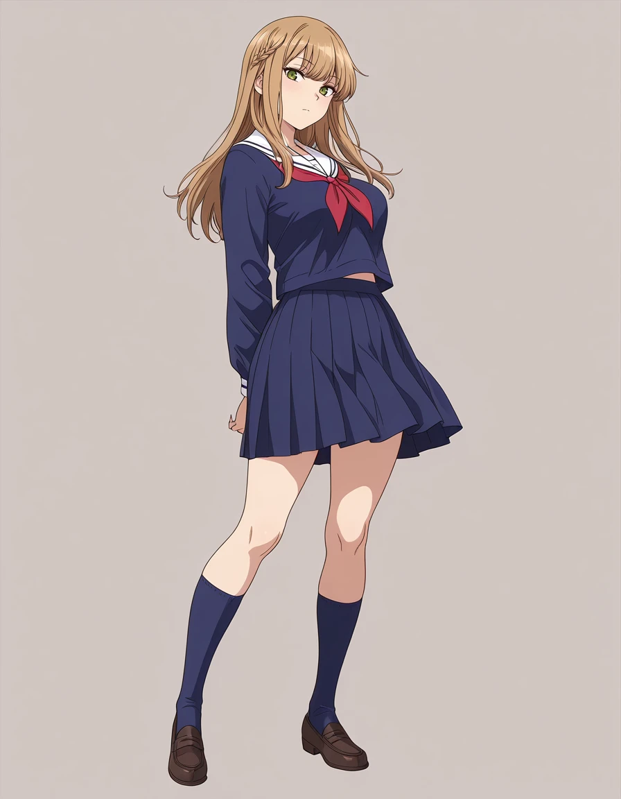 mai_nol,mai_yumekool,long_hair,french_braid,blonde_hair,green_eyes,large_breasts,white_shirt,puffy_sleeves,short_sleeves,frills,red_ neck_ribbon,blue_skirt,pantyhose,high_heelsUsing the prompt 'mai_nol' can obtain the style of the work.