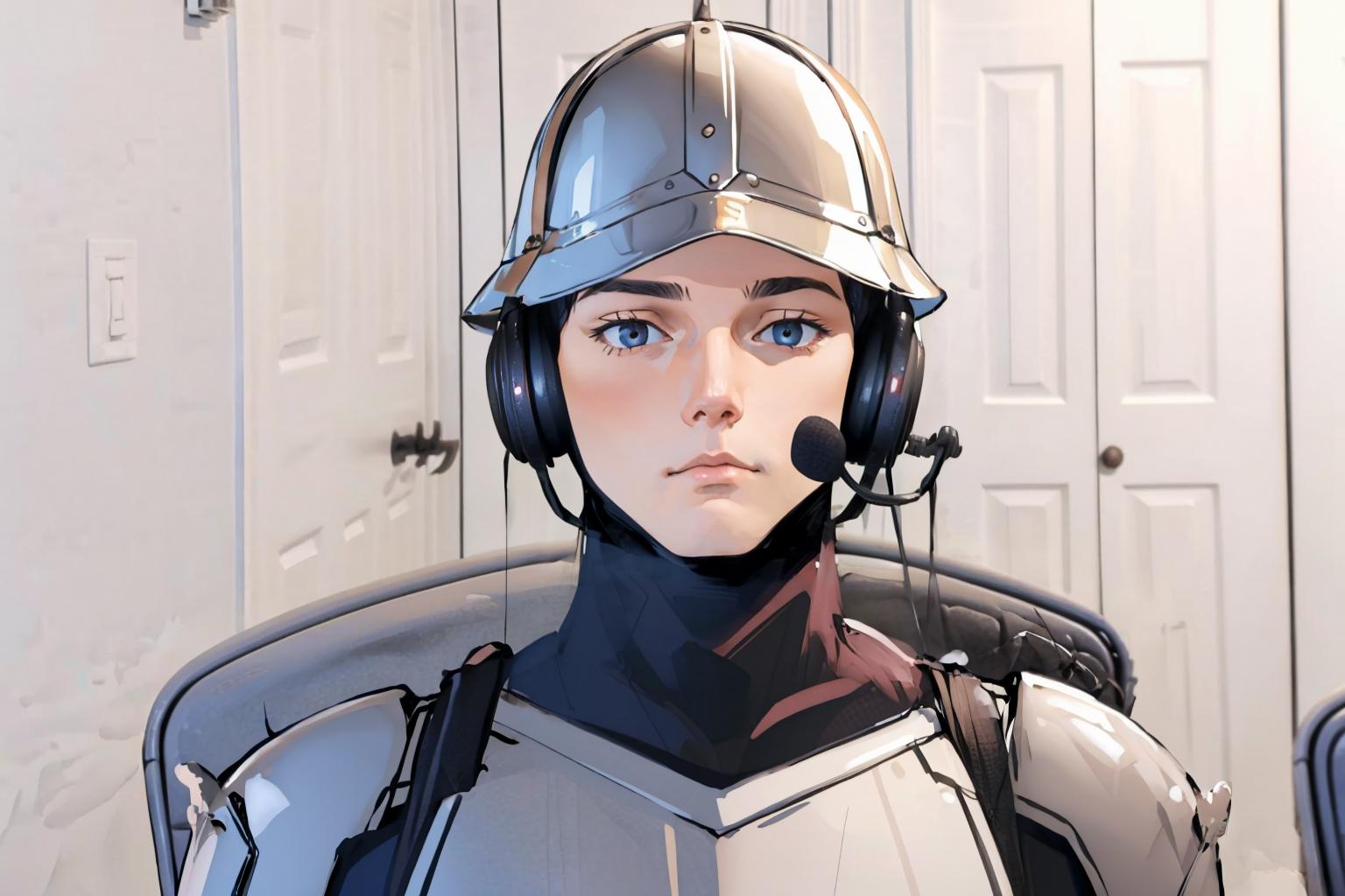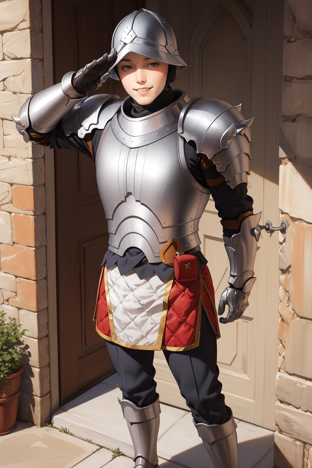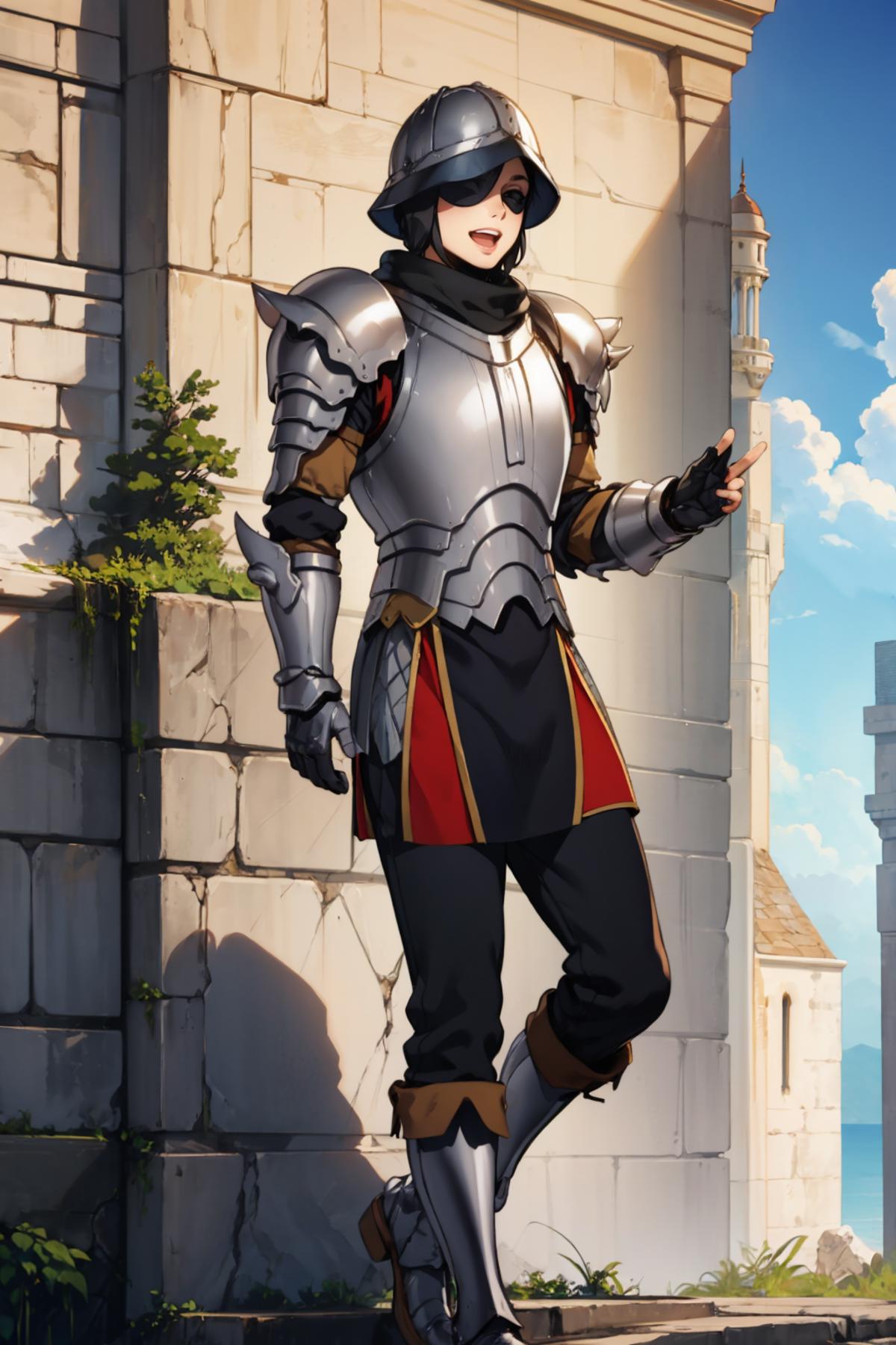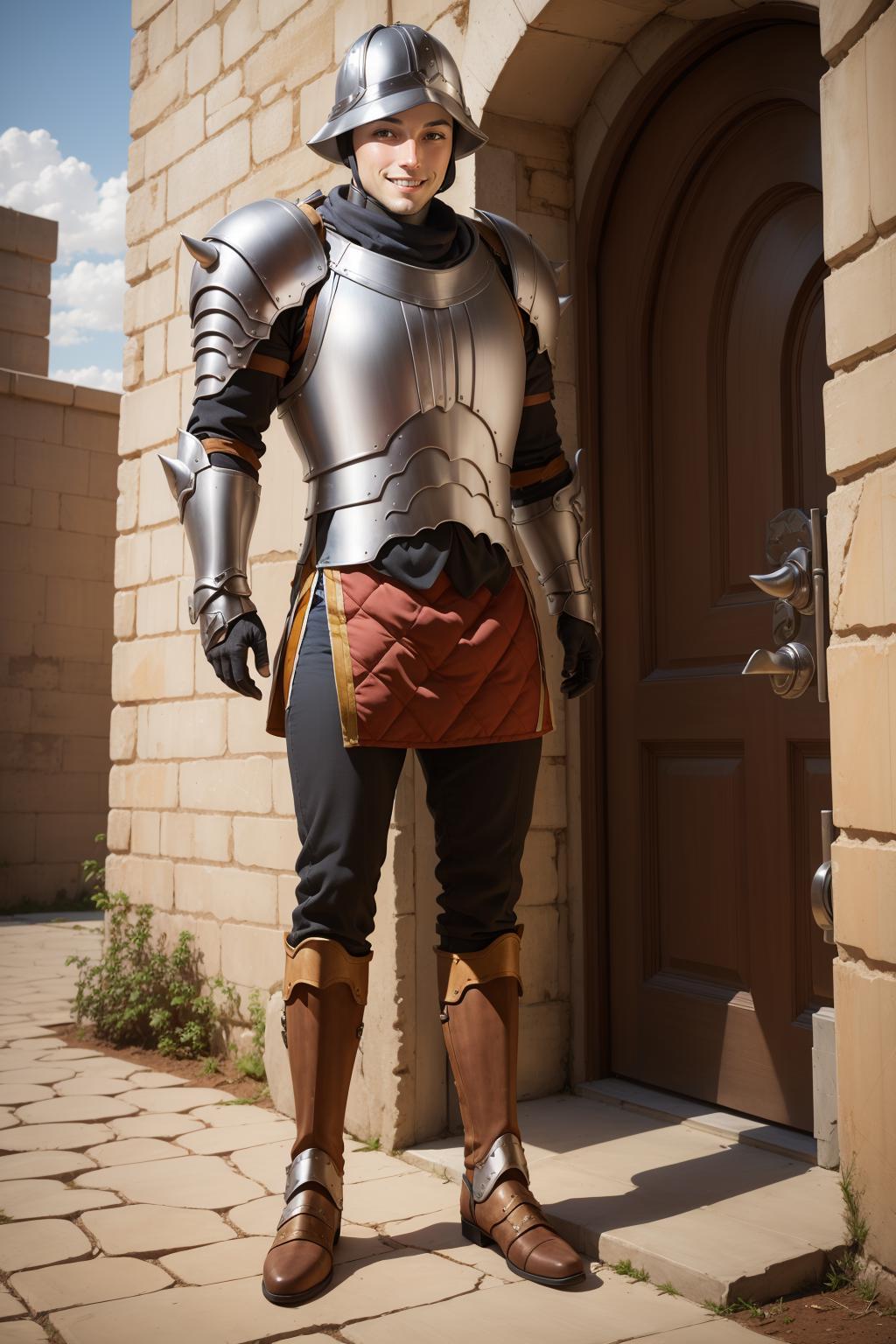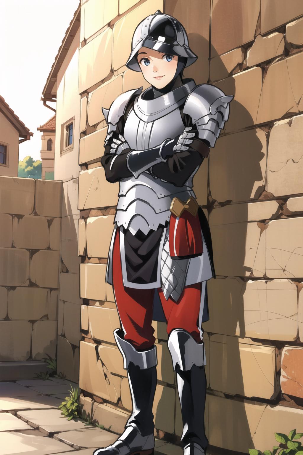 Add "helmet, full armor, gauntlets, armored boots" for his regular look.