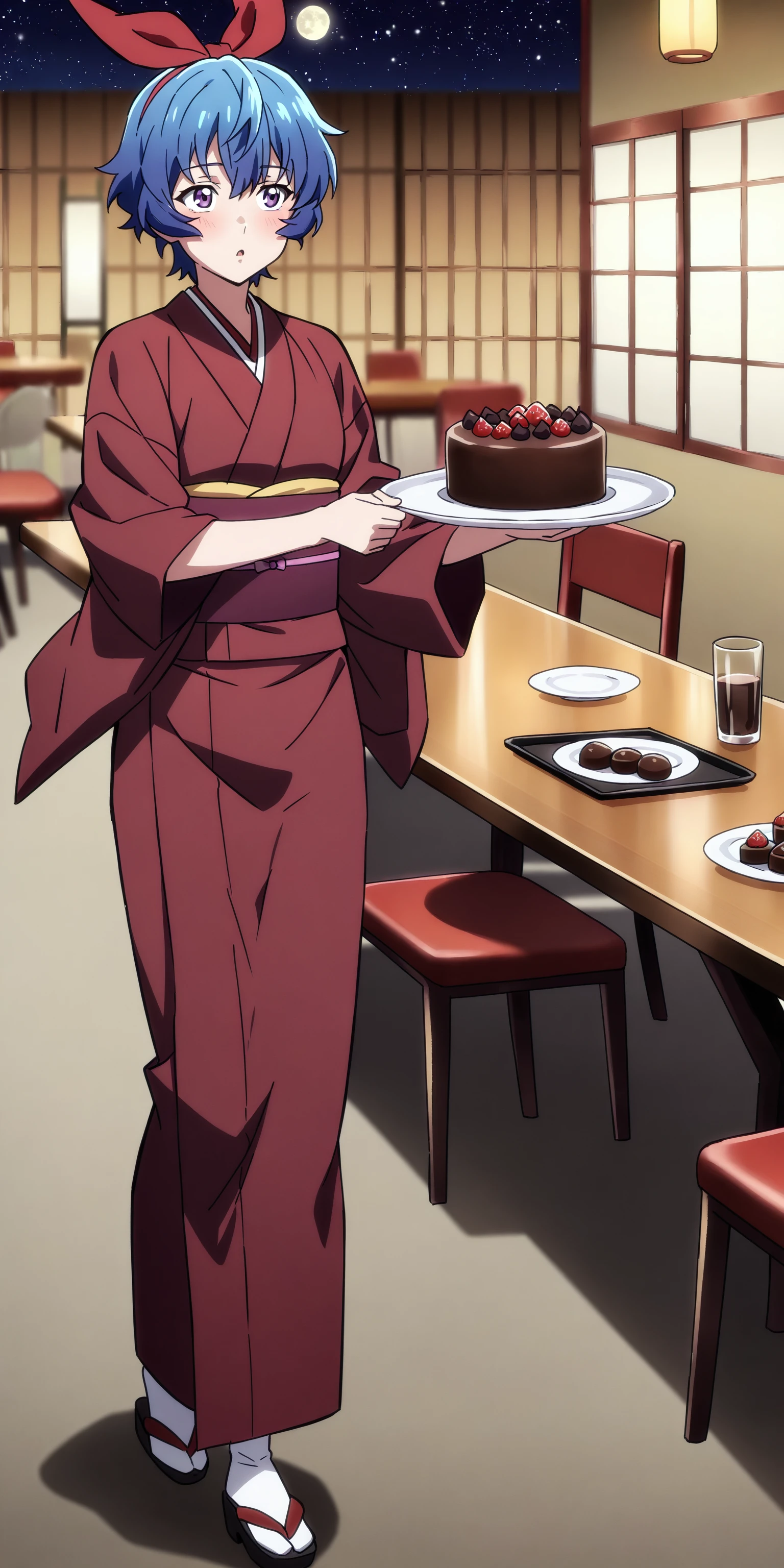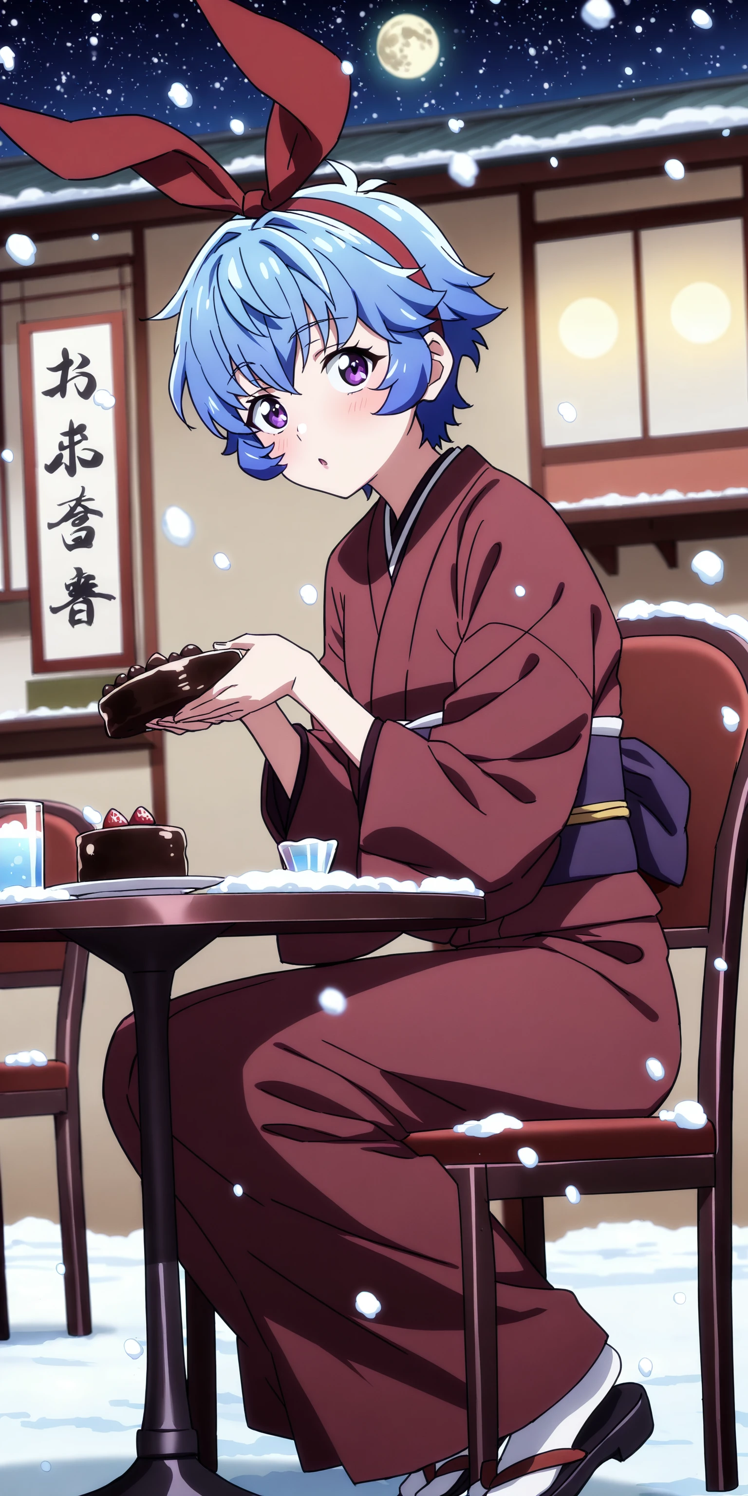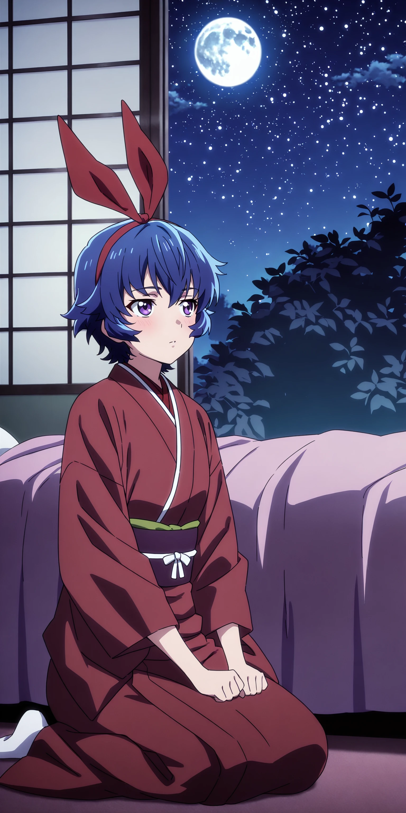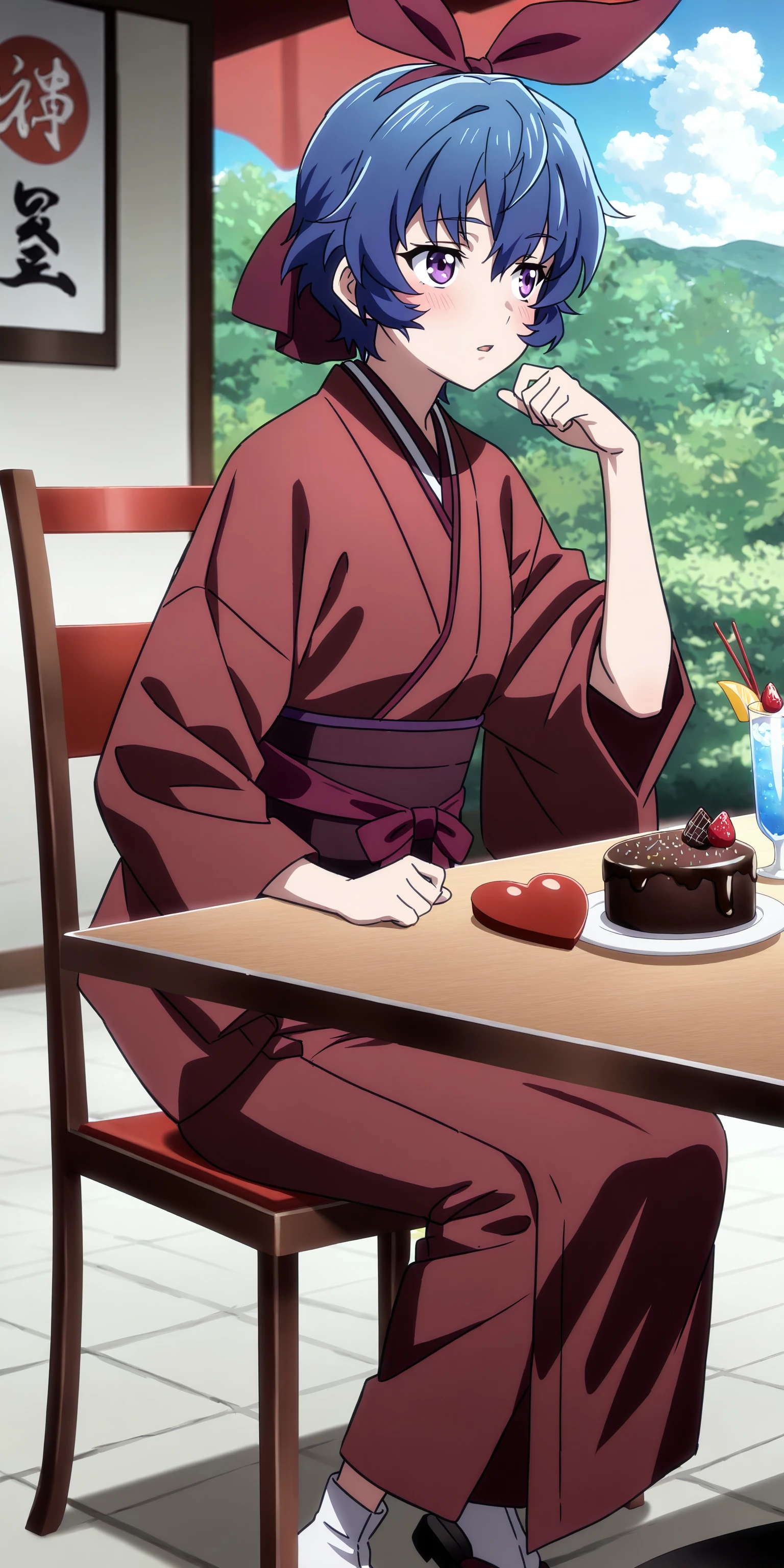 short hair, ribbon, blue hair, purple eyes, hair ribbon, japanese clothes, kimono,